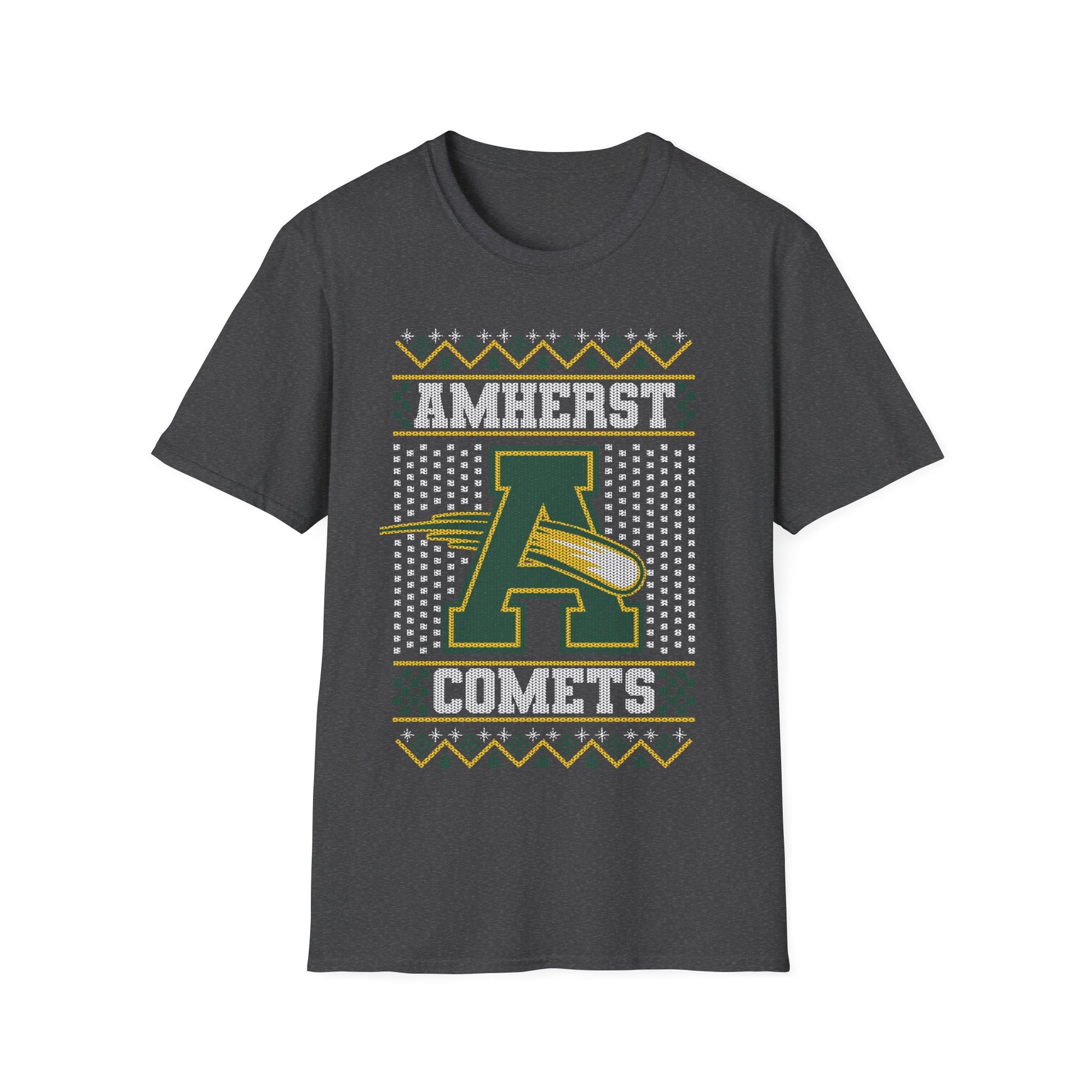 Show your school pride this holiday season with the Amherst Comets Festive Spirit Tee! This unique shirt brings the cozy charm of an ugly sweater to a comfortable t-shirt, featuring the words “Amherst Comets” alongside the iconic Amherst logo in the center. With a cheerful blend of white, green, and gold, this festive design is perfect for game days, holiday parties, or simply celebrating your hometown spirit in style.