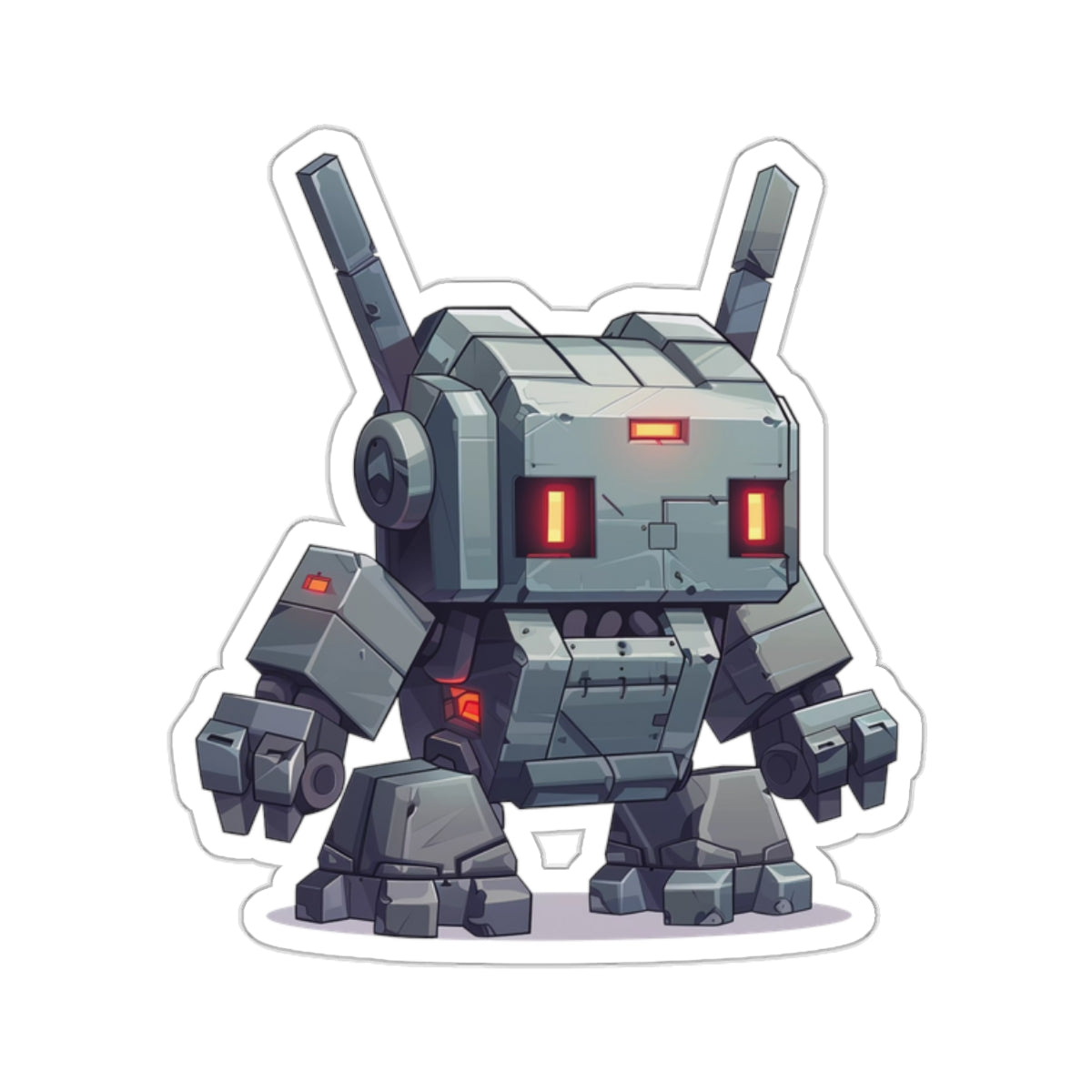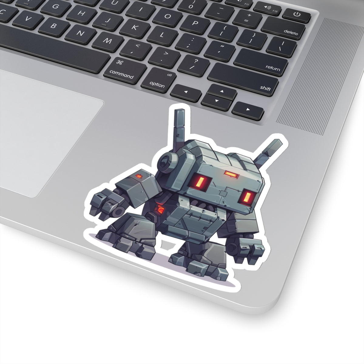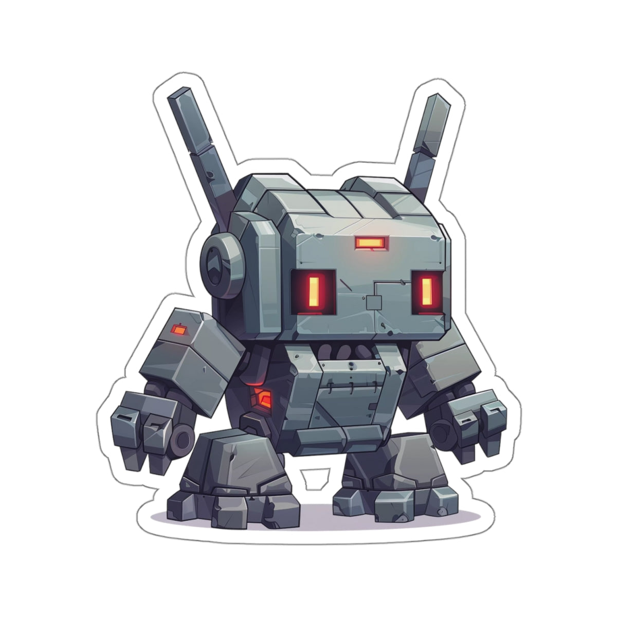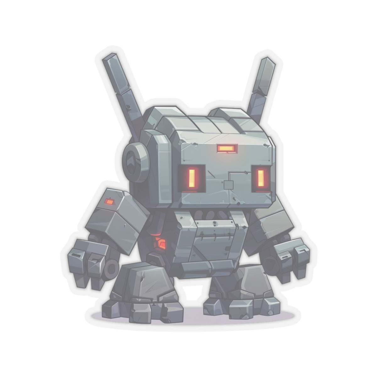 in a lightish gray-green hue, exuding an aura of strength and resilience. With its robust appearance reminiscent of a battle robot, this sticker is perfect for fans of futuristic warfare. The robot's orange glowing eyes add an intense and menacing touch, ready for any challenge. Perfect for sci-fi enthusiasts and lovers of futuristic technology, this sticker adds a touch of battle-ready charm to laptops, notebooks, and more. Crafted from durable vinyl with strong 3M adhesive for long-lasting attachment, the kiss-cut design allows for easy customization of shapes. Available in multiple sizes to suit your preferences, with a thickness of 0.004" (1mm) and a glossy finish, this sticker brings a futuristic edge to any surface. Please note, these stickers are not waterproof but are perfect for indoor decor.
