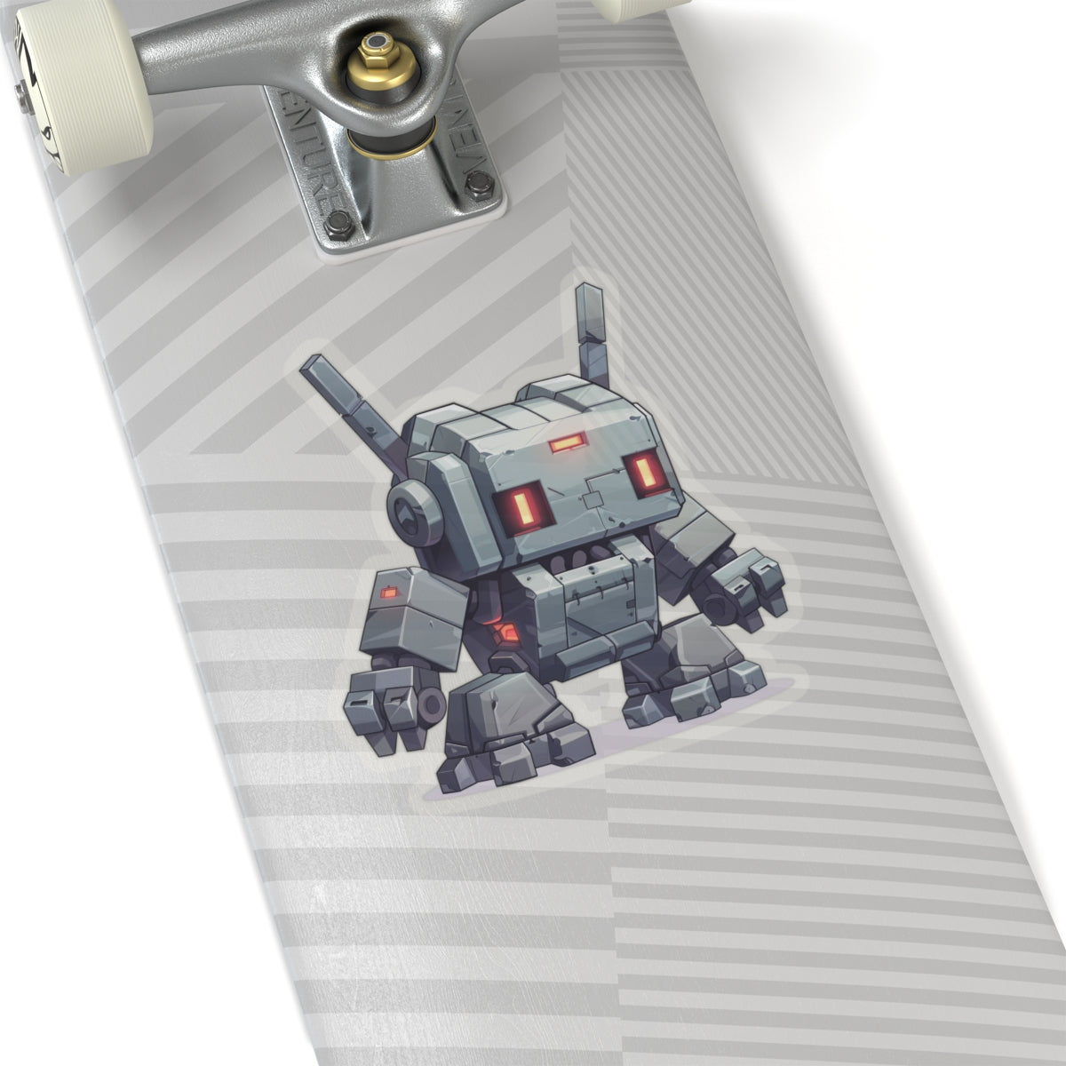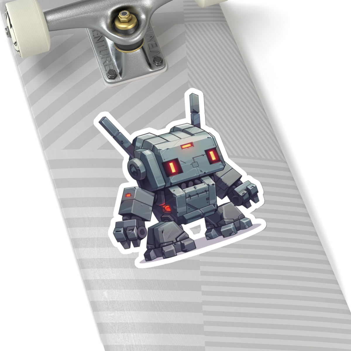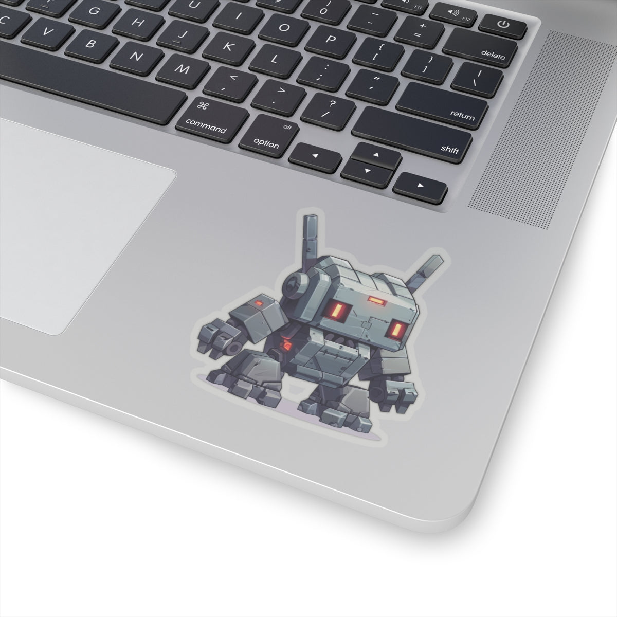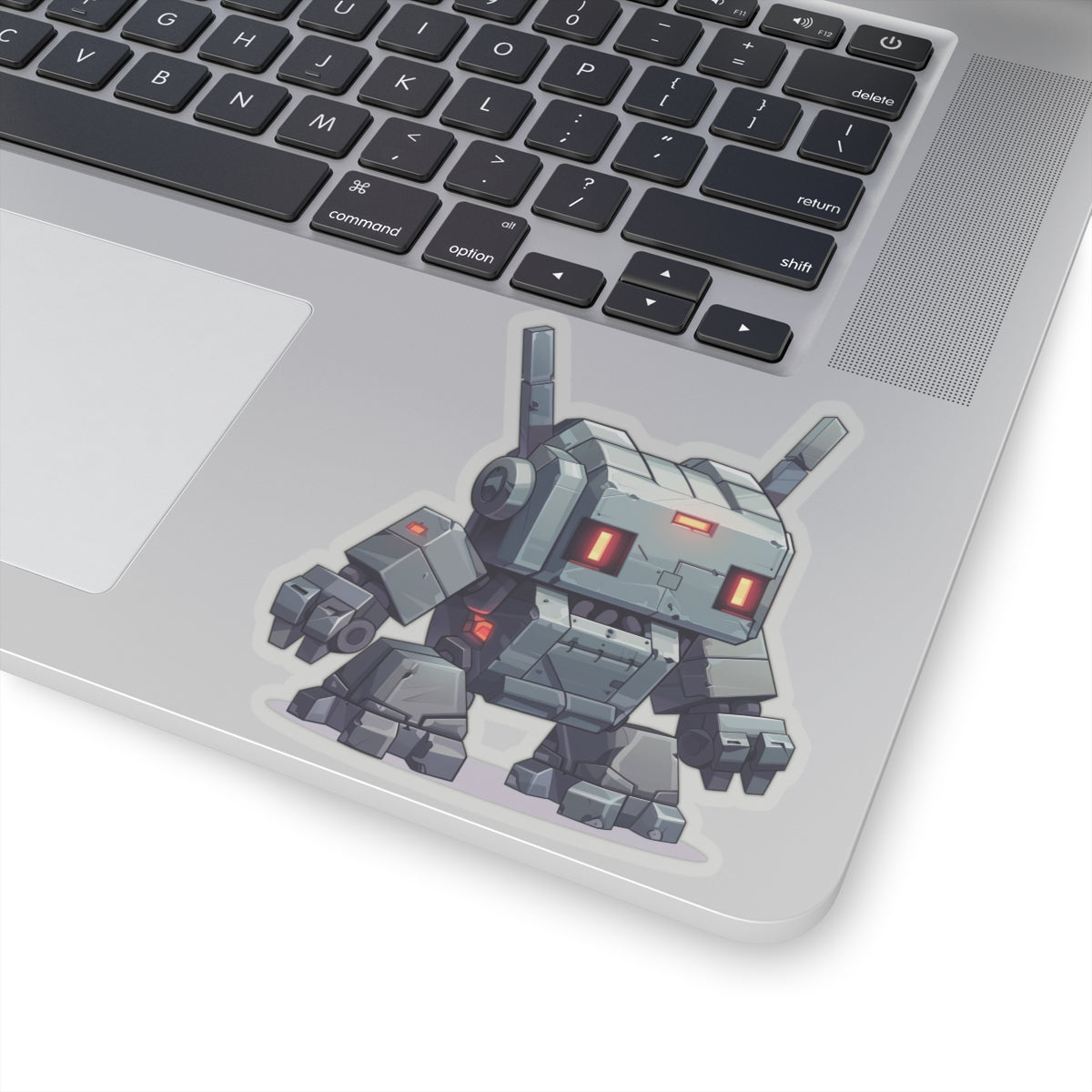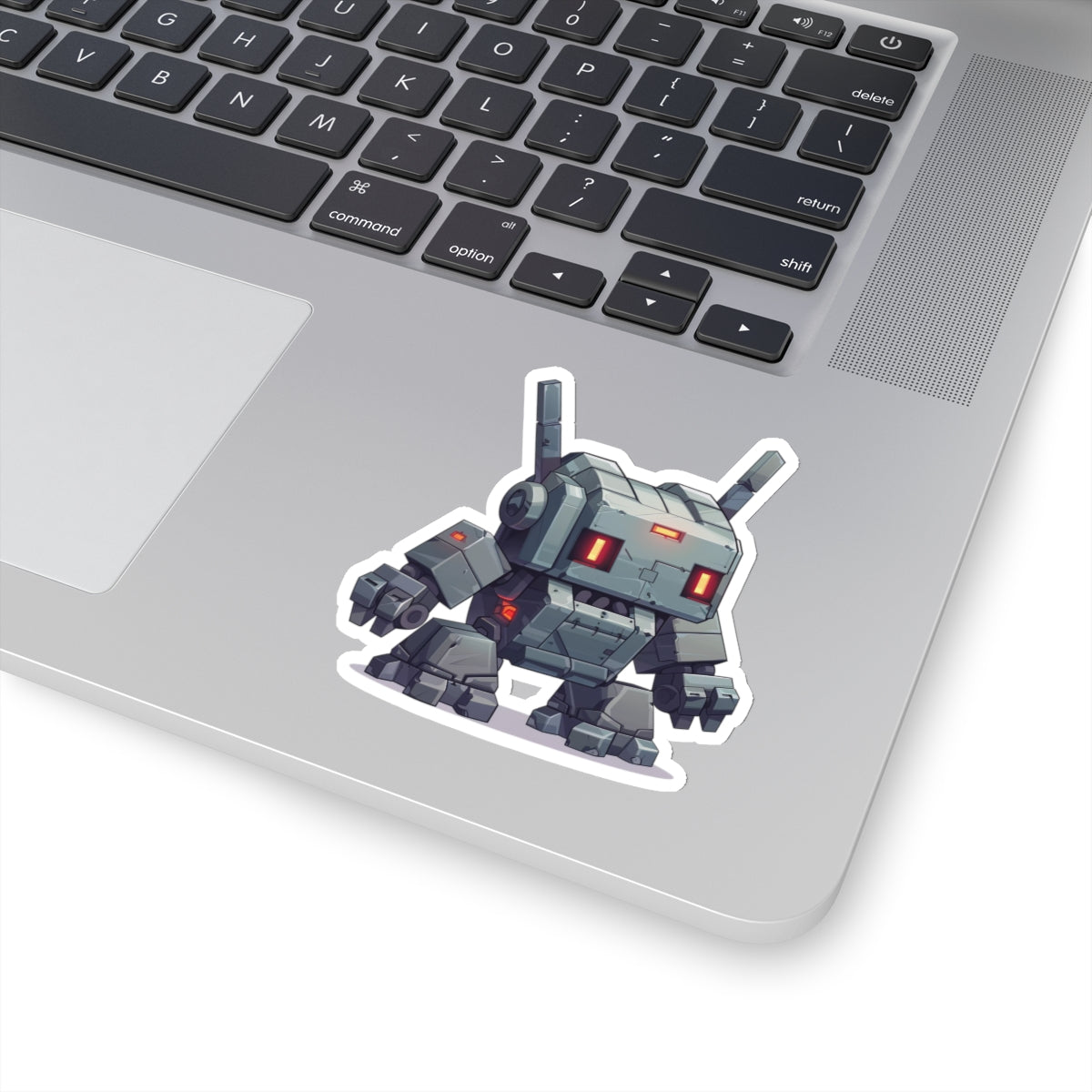 in a lightish gray-green hue, exuding an aura of strength and resilience. With its robust appearance reminiscent of a battle robot, this sticker is perfect for fans of futuristic warfare. The robot's orange glowing eyes add an intense and menacing touch, ready for any challenge. Perfect for sci-fi enthusiasts and lovers of futuristic technology, this sticker adds a touch of battle-ready charm to laptops, notebooks, and more. Crafted from durable vinyl with strong 3M adhesive for long-lasting attachment, the kiss-cut design allows for easy customization of shapes. Available in multiple sizes to suit your preferences, with a thickness of 0.004" (1mm) and a glossy finish, this sticker brings a futuristic edge to any surface. Please note, these stickers are not waterproof but are perfect for indoor decor.