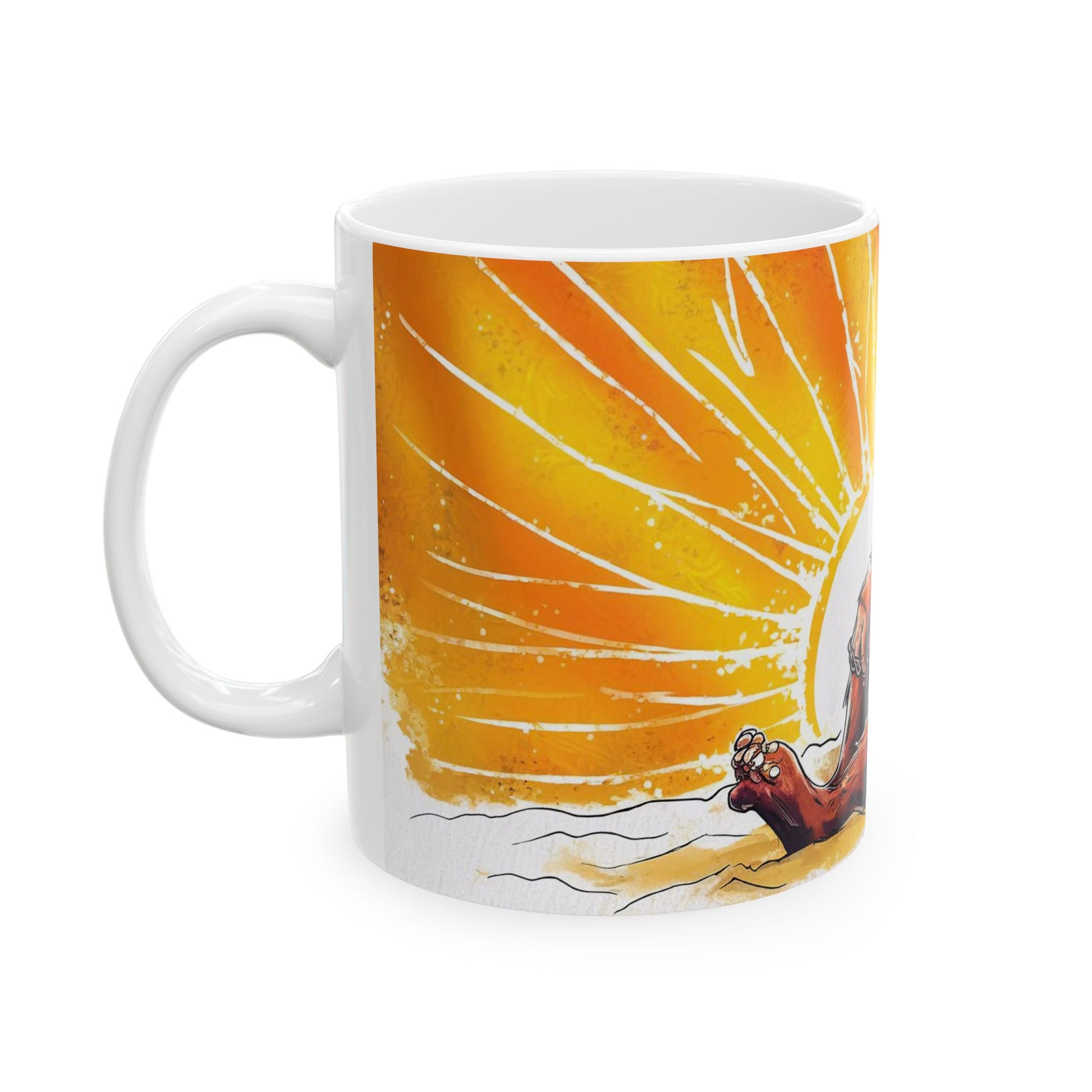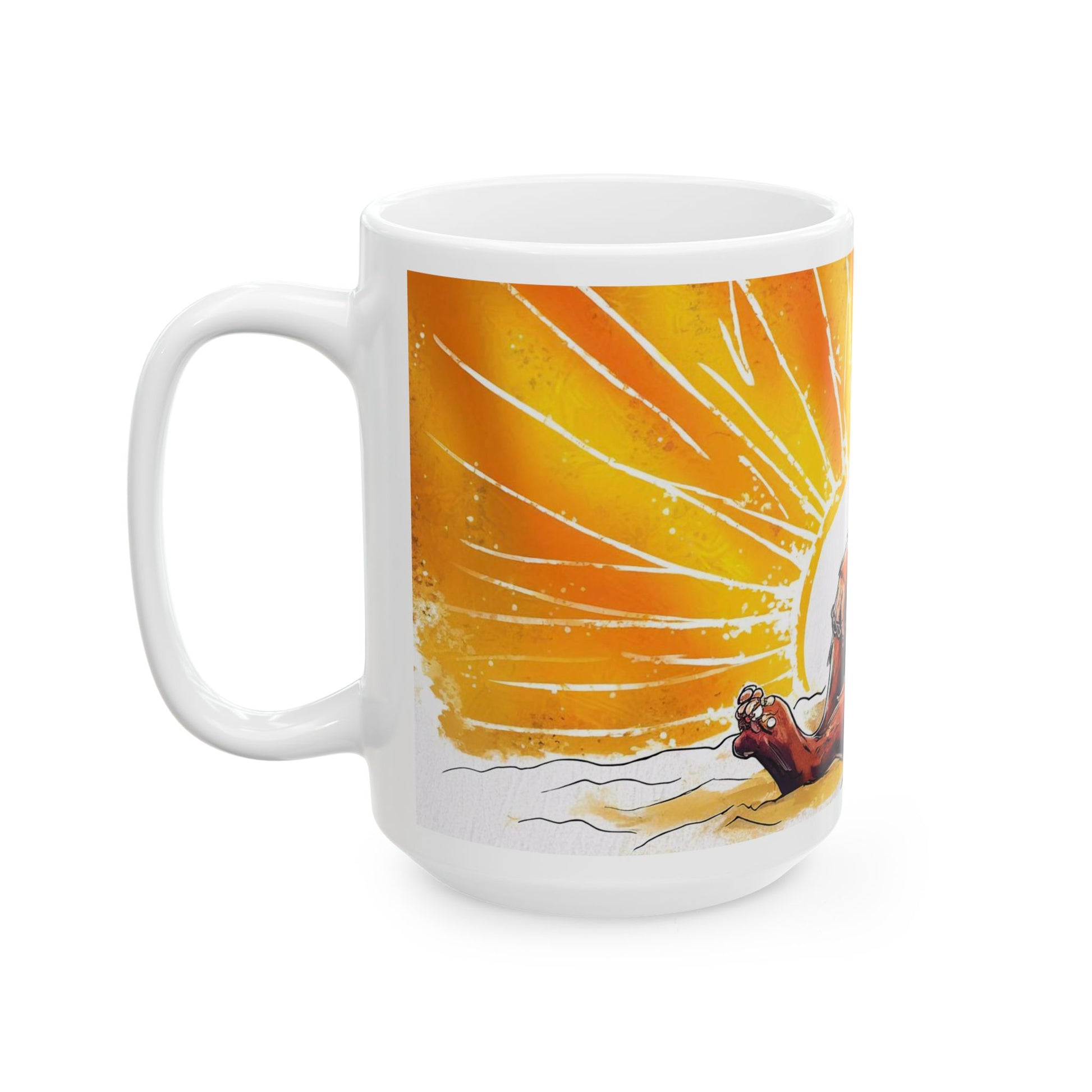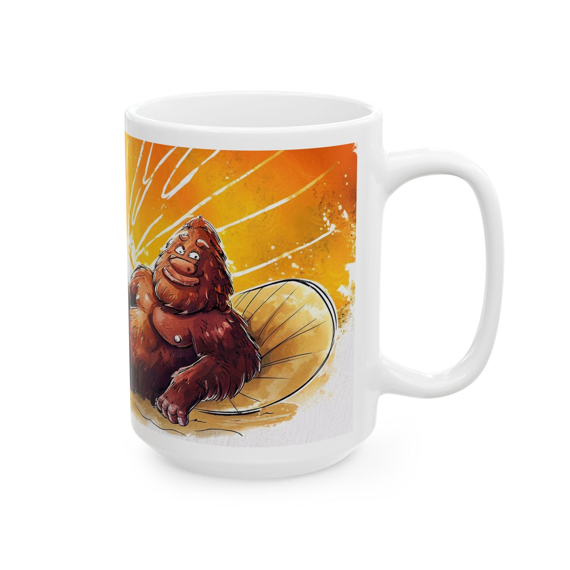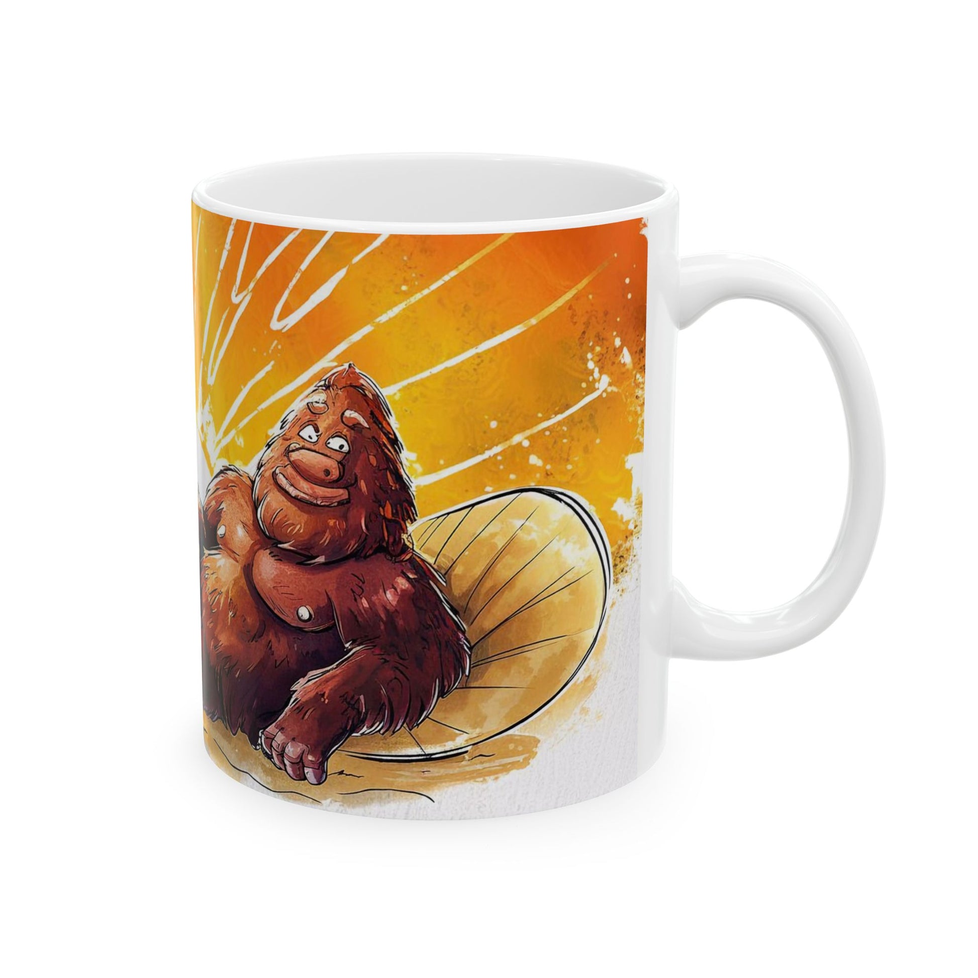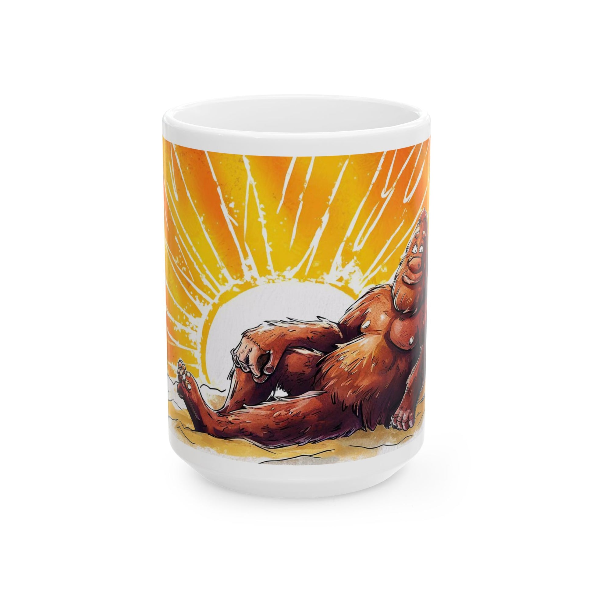 Unwind with this whimsical ceramic coffee mug featuring a playful Bigfoot catching some rays and enjoying a beautiful sunset. The soft, hand-drawn aesthetic with gentle watercolor textures creates a serene, carefree vibe, set against a backdrop of warm oranges and yellows. This design captures the joy and wonder of summer days spent in nature. Available in 11oz and 15oz sizes, this BPA and lead-free mug is microwave and dishwasher safe. Perfect for anyone who loves a laid-back, nature-inspired design to accompany their daily brew!