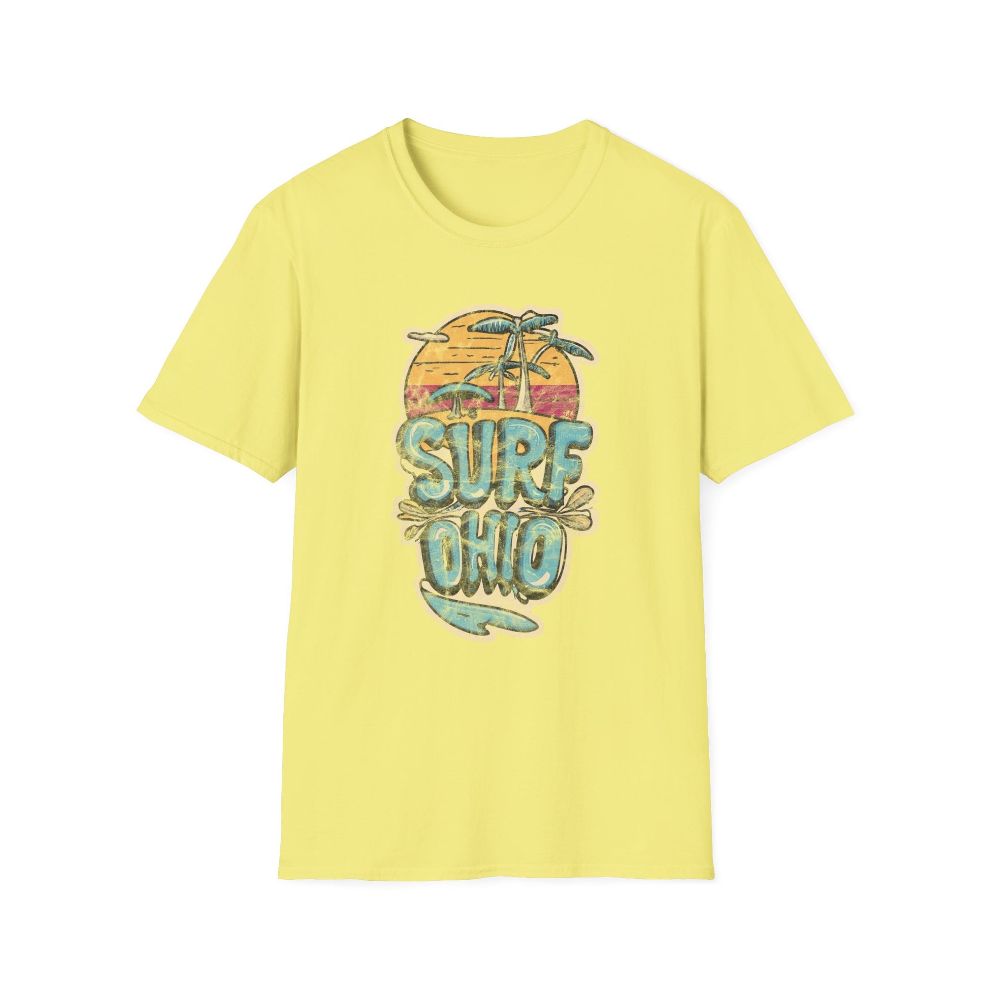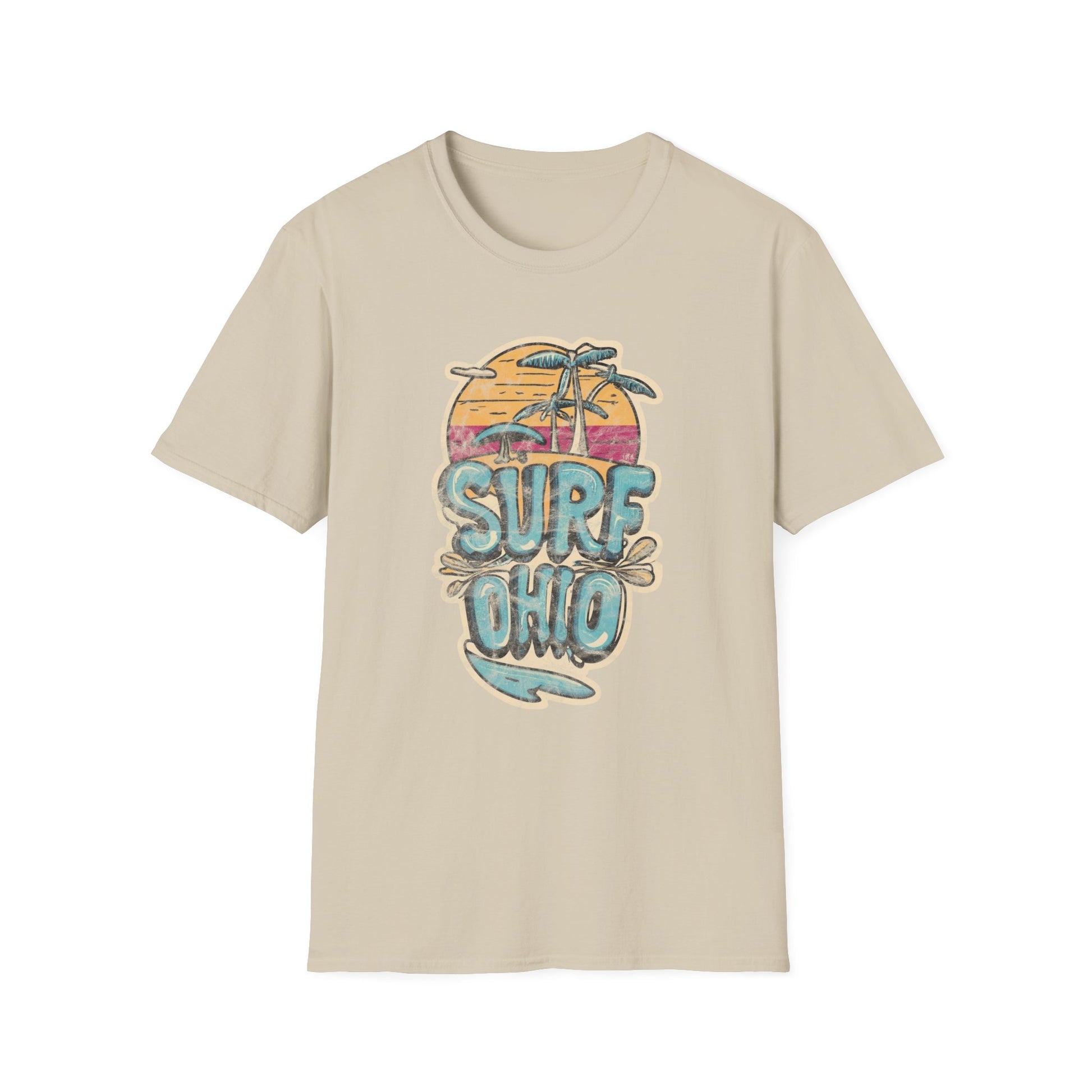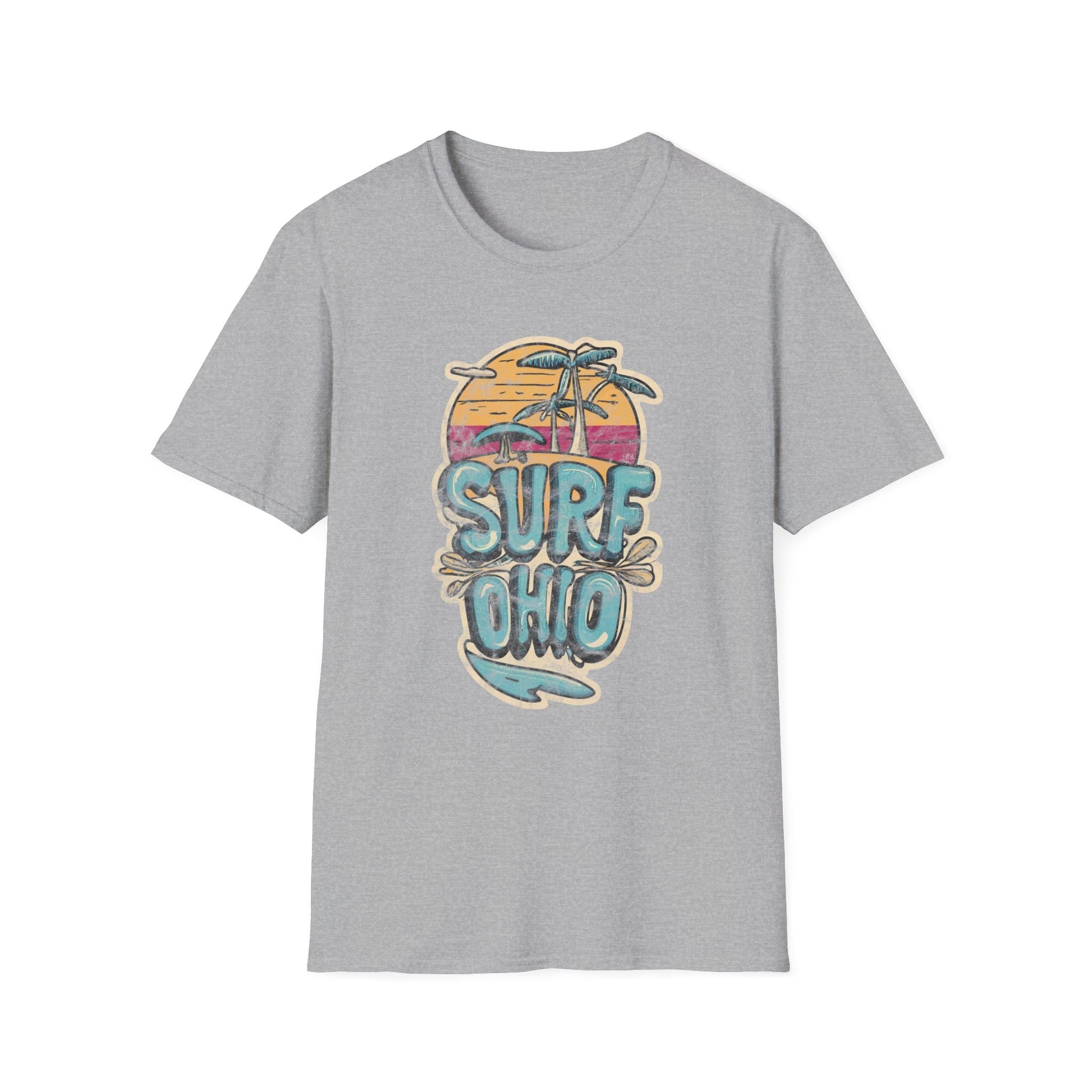 Ride the waves of nostalgia with our Colorful Sunset Surf Ohio Softstyle Tee! This vibrant shirt features the words "Surf Ohio" adorned with a captivating sunset backdrop, complete with palm trees swaying gently in the breeze. The colorful design captures the essence of beachside bliss and Ohio's surf culture.