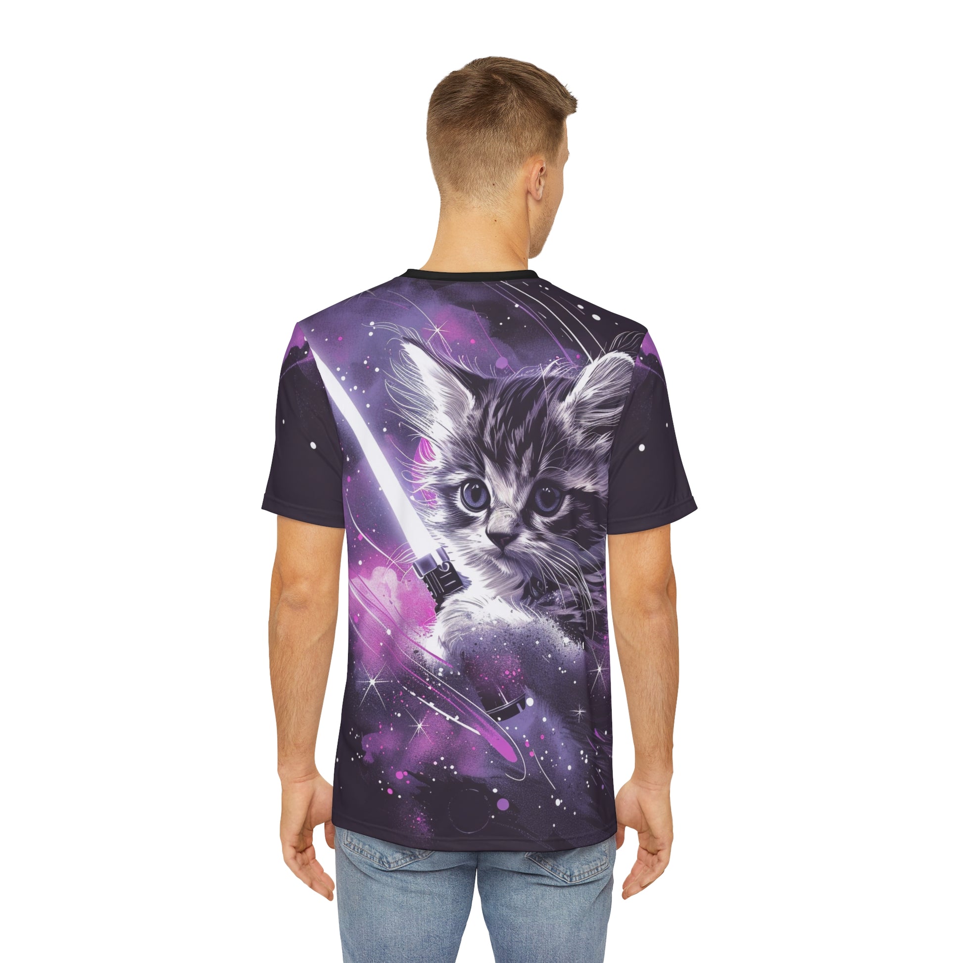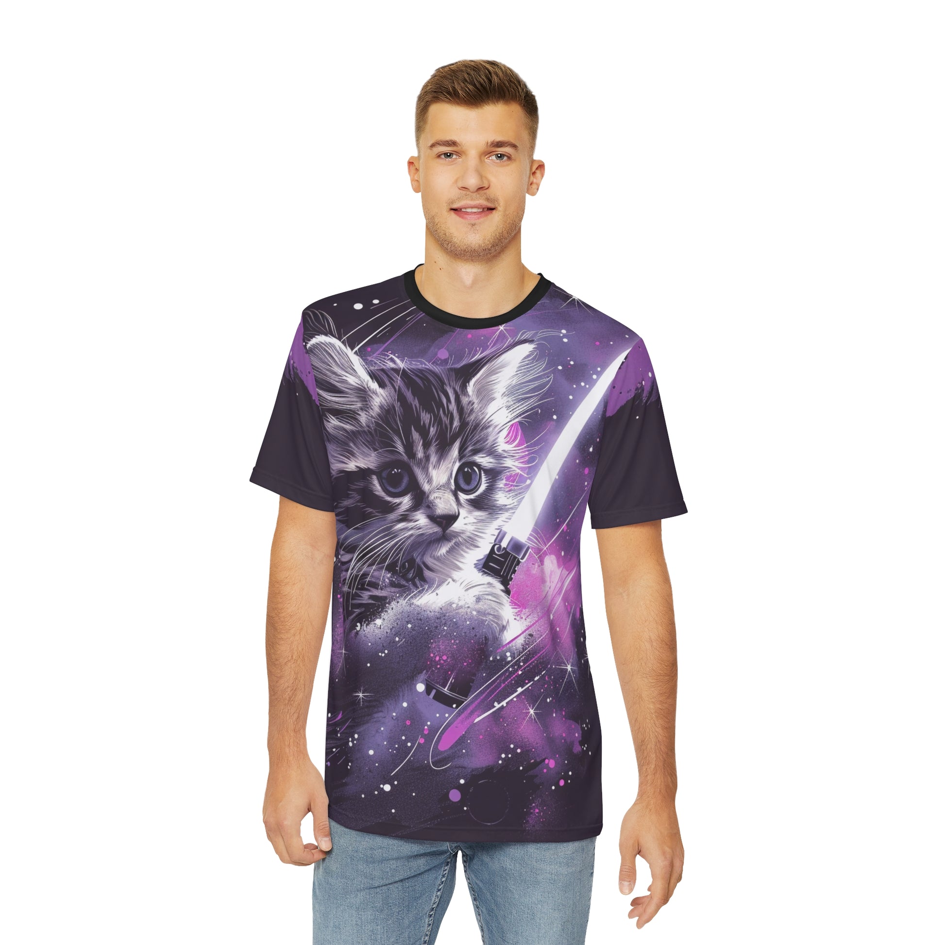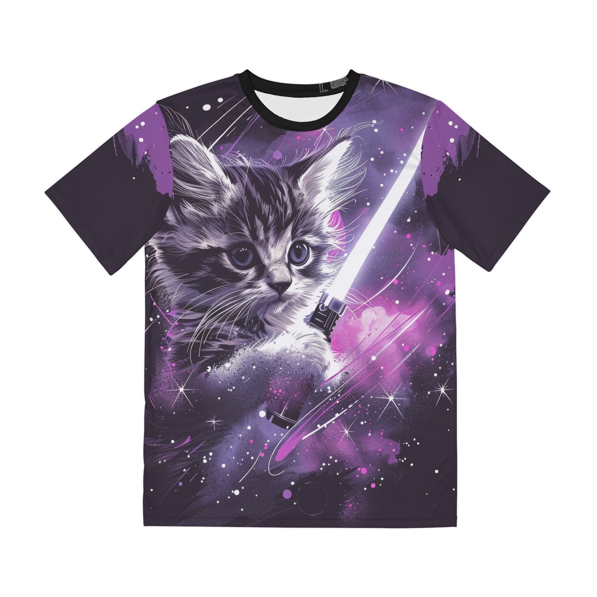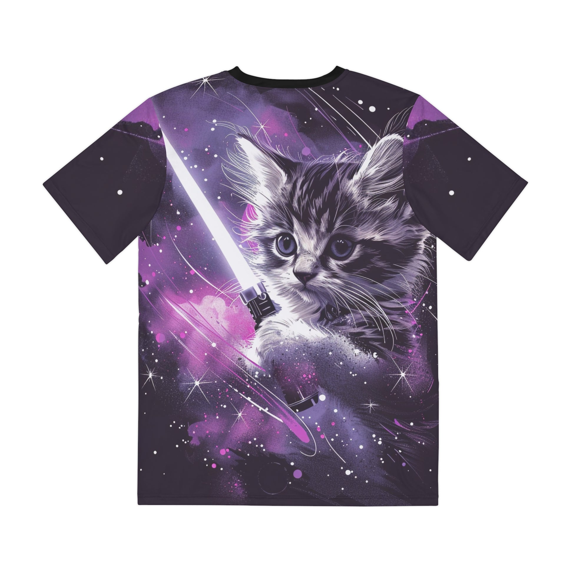 Dive into the enchanting scene featuring a charming kitten ready for adventure amidst a vibrant galaxy backdrop. With the kitten's playful spirit and the cosmic wonders of space, this design captures the imagination and brings a touch of magic to your wardrobe.