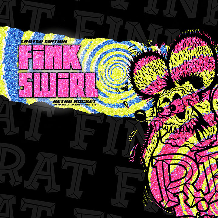 Get ready to ride in style with the Fink Swirl - Custom Rat Fink Retro Rocket Skateboard - a rare and collectible work of art! With its stunning retro design featuring swirls, pinks, blues, and yellows, all created by a licensed Rat Fink artist, this skateboard is sure to turn heads.