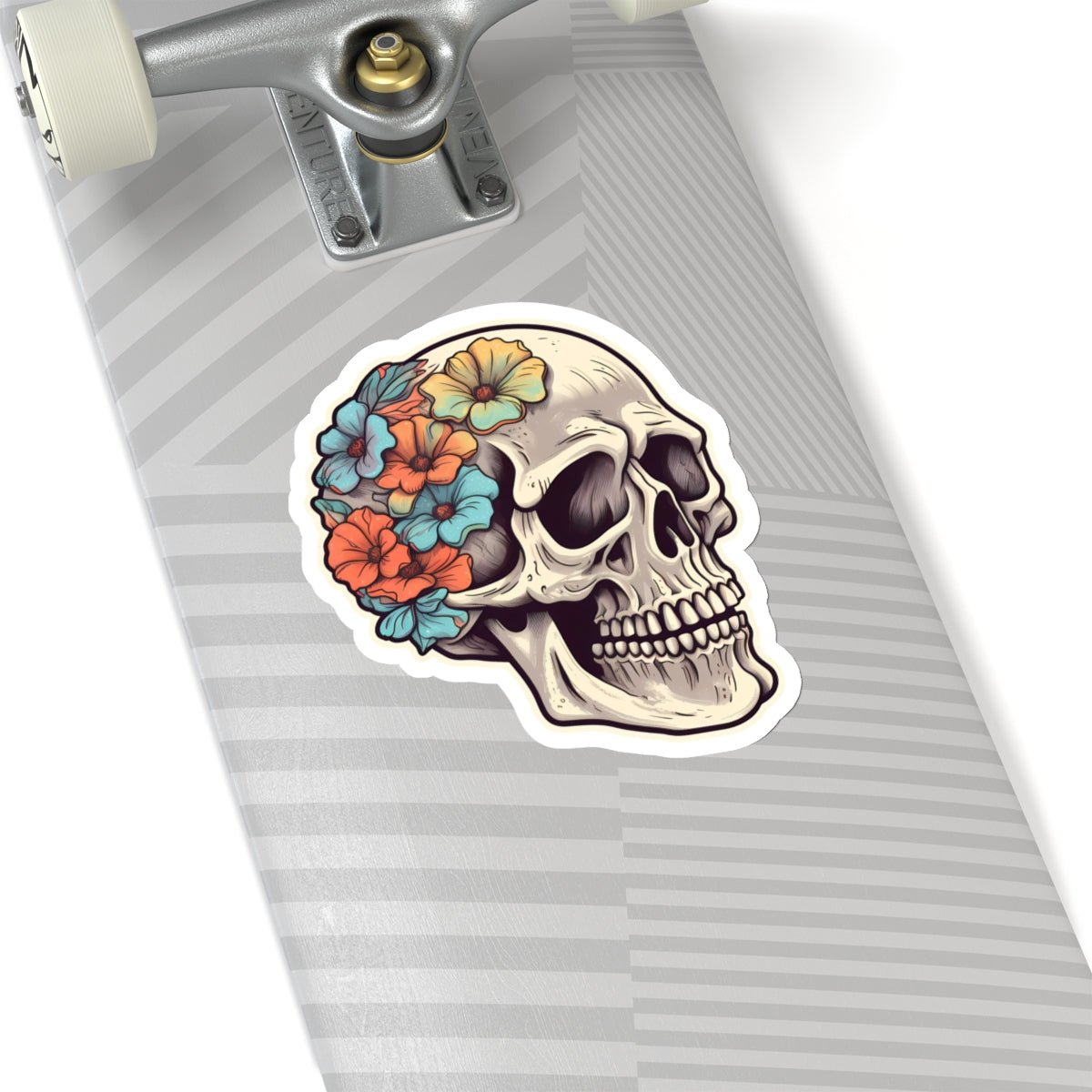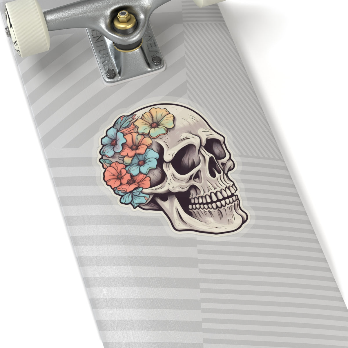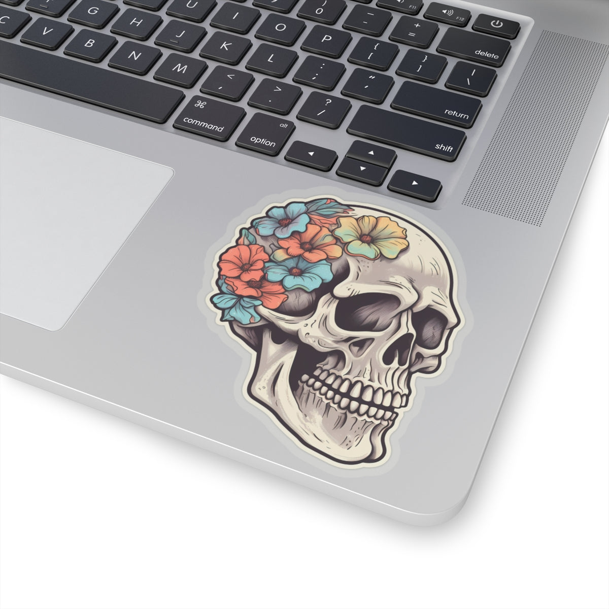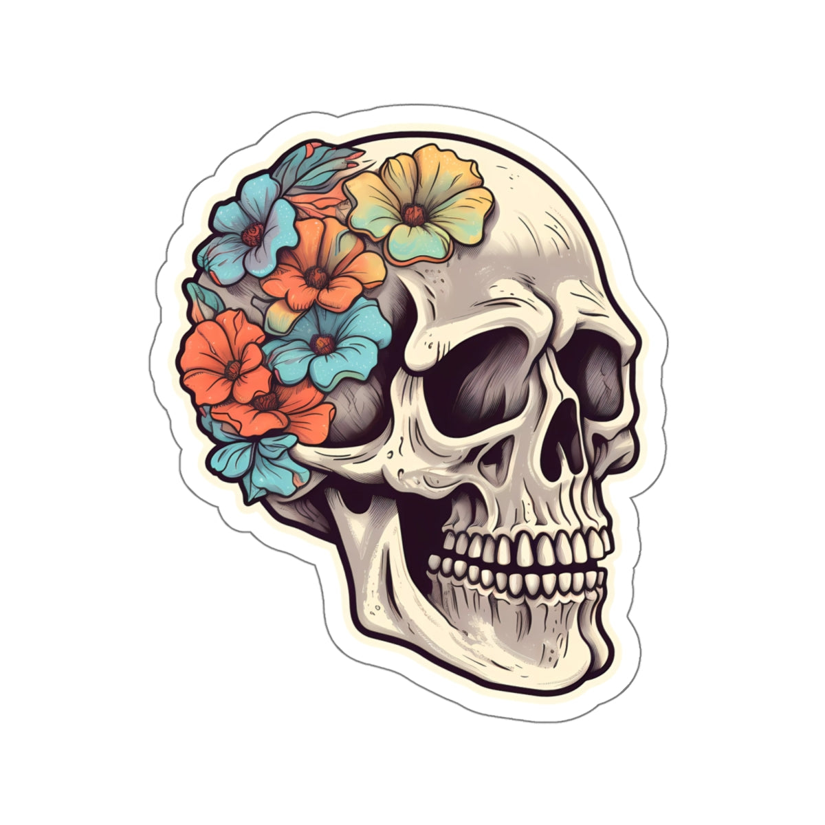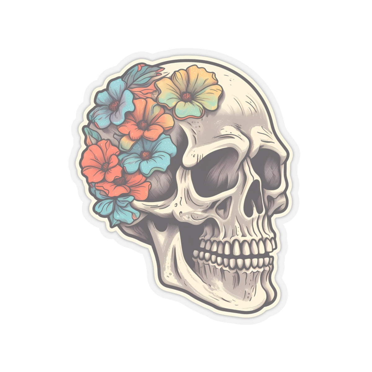 Add a touch of whimsical beauty to your belongings with our Floral Embellished Tan Skull Sticker! This enchanting sticker features a light