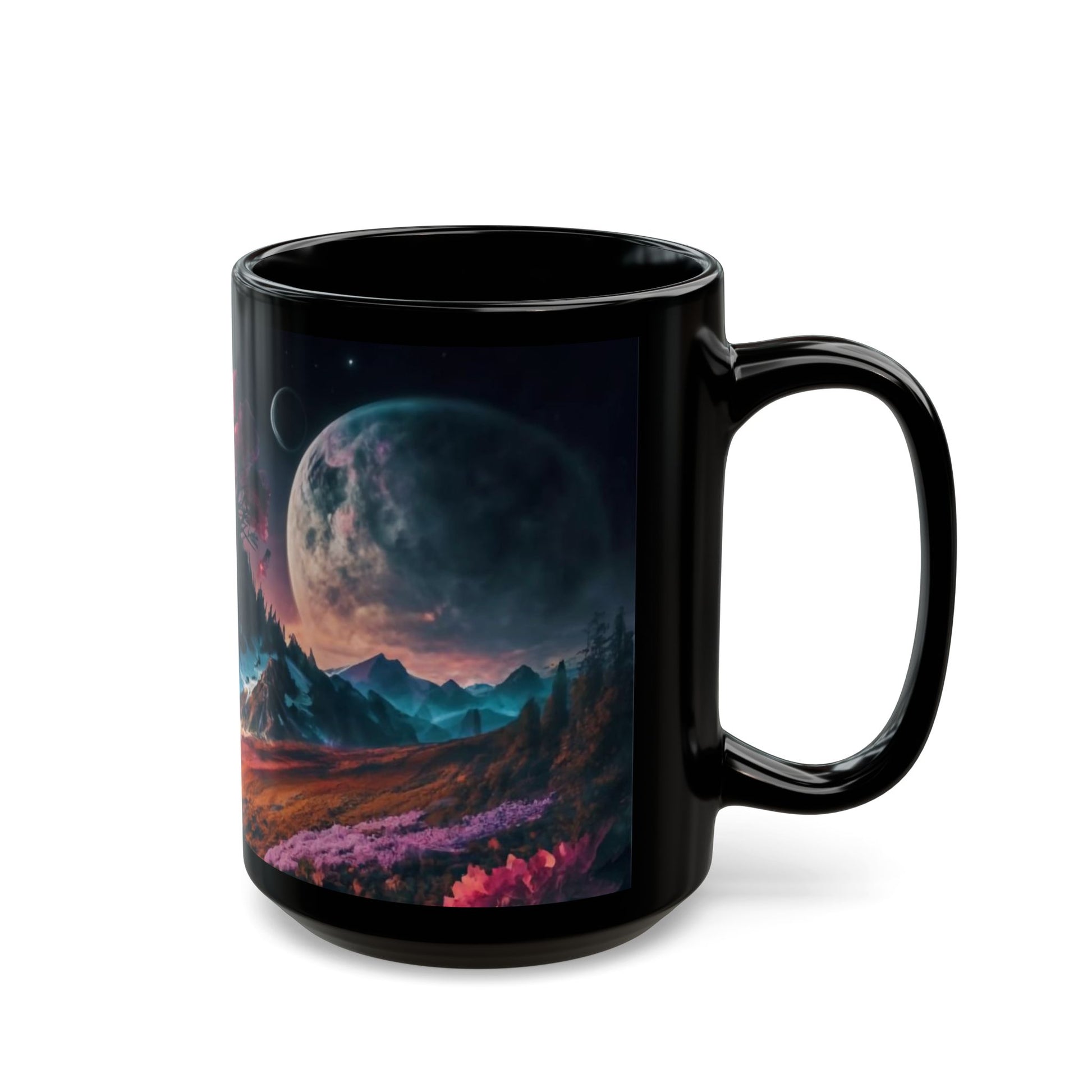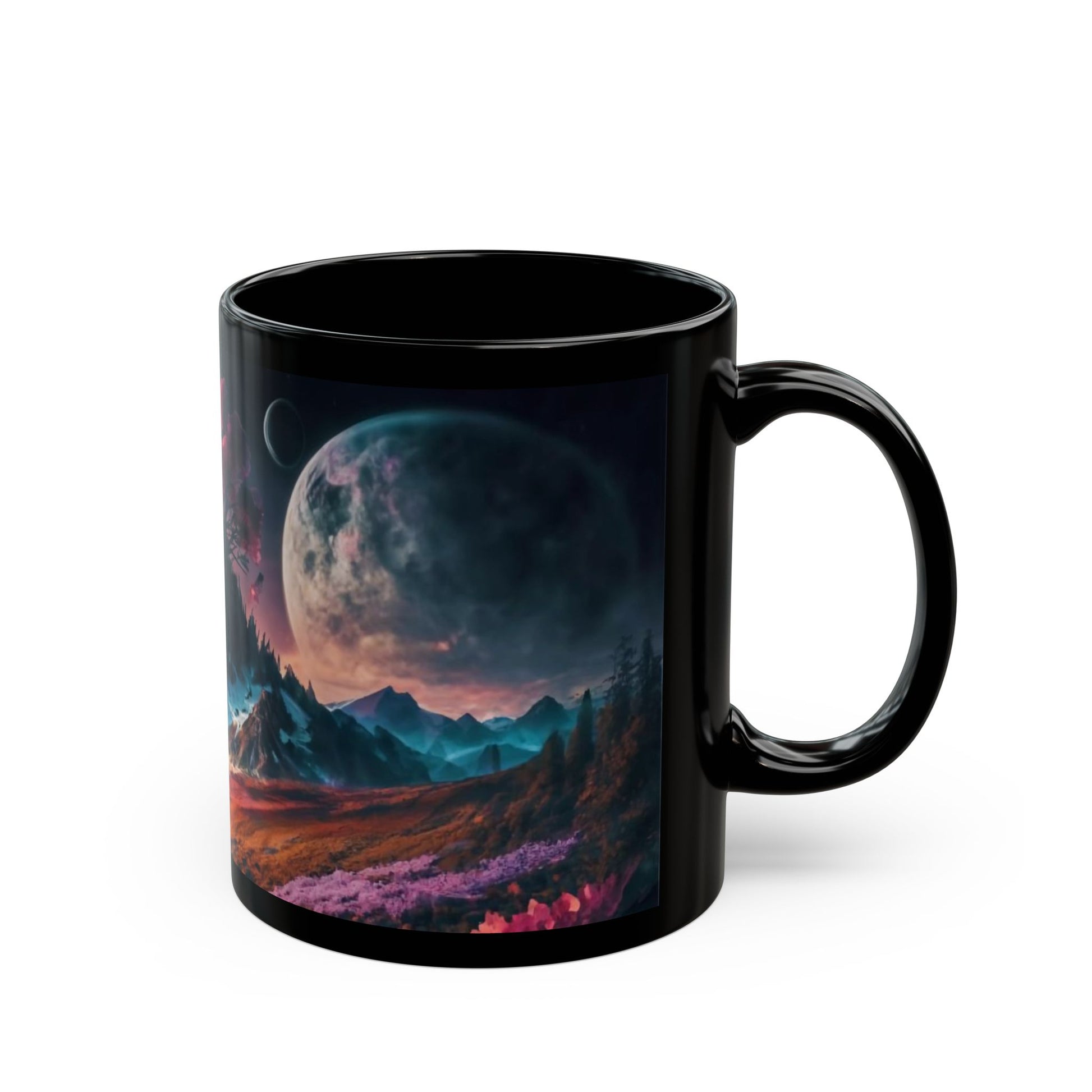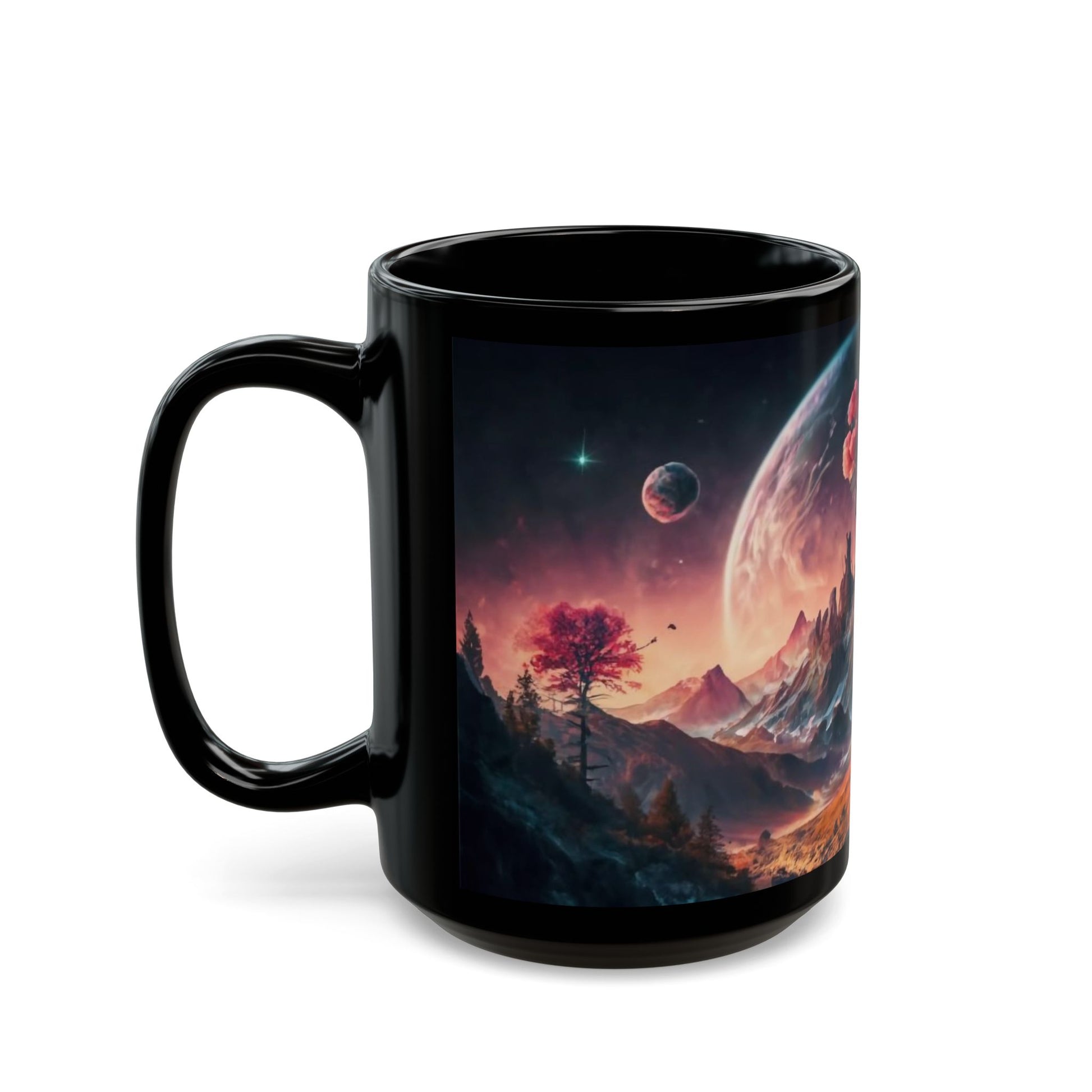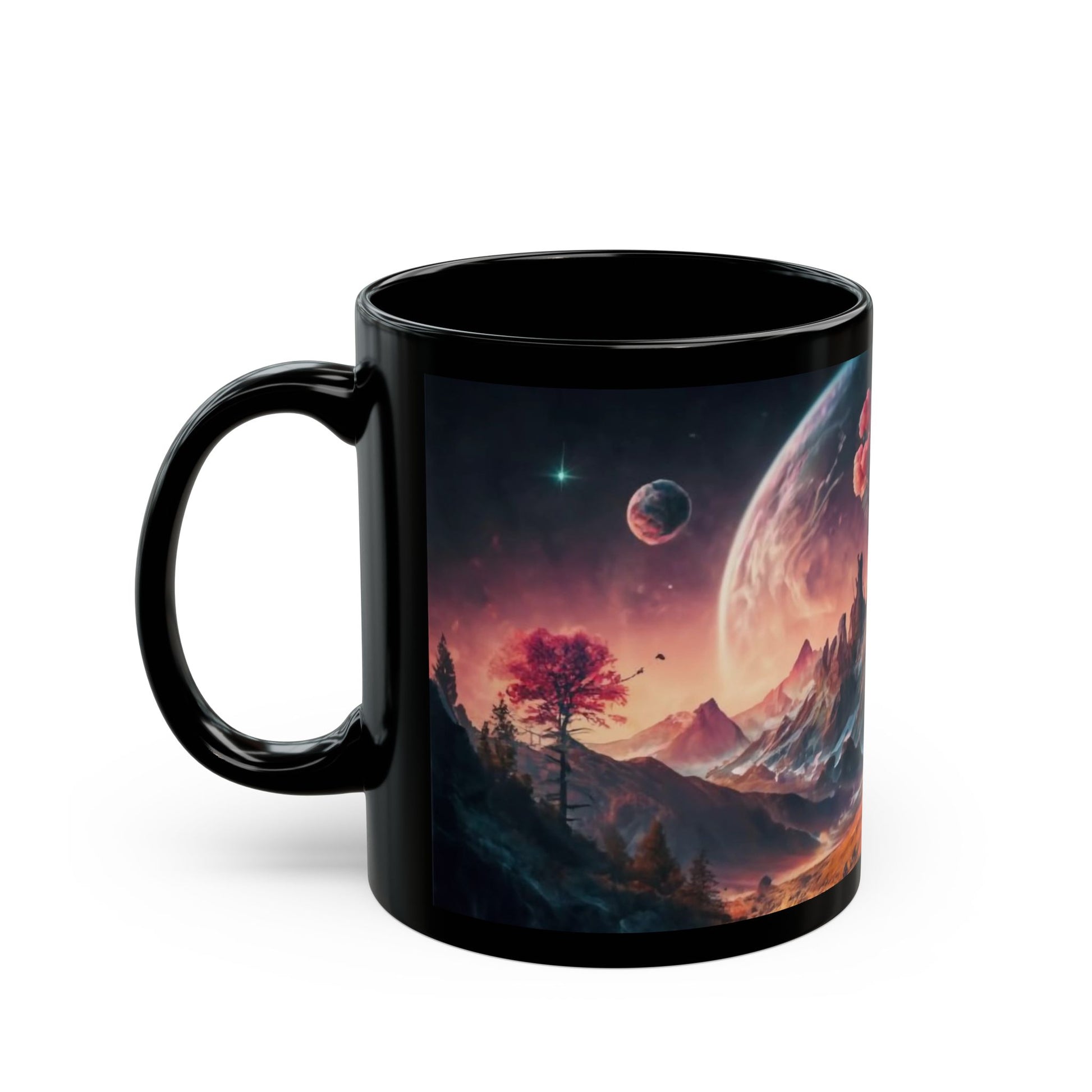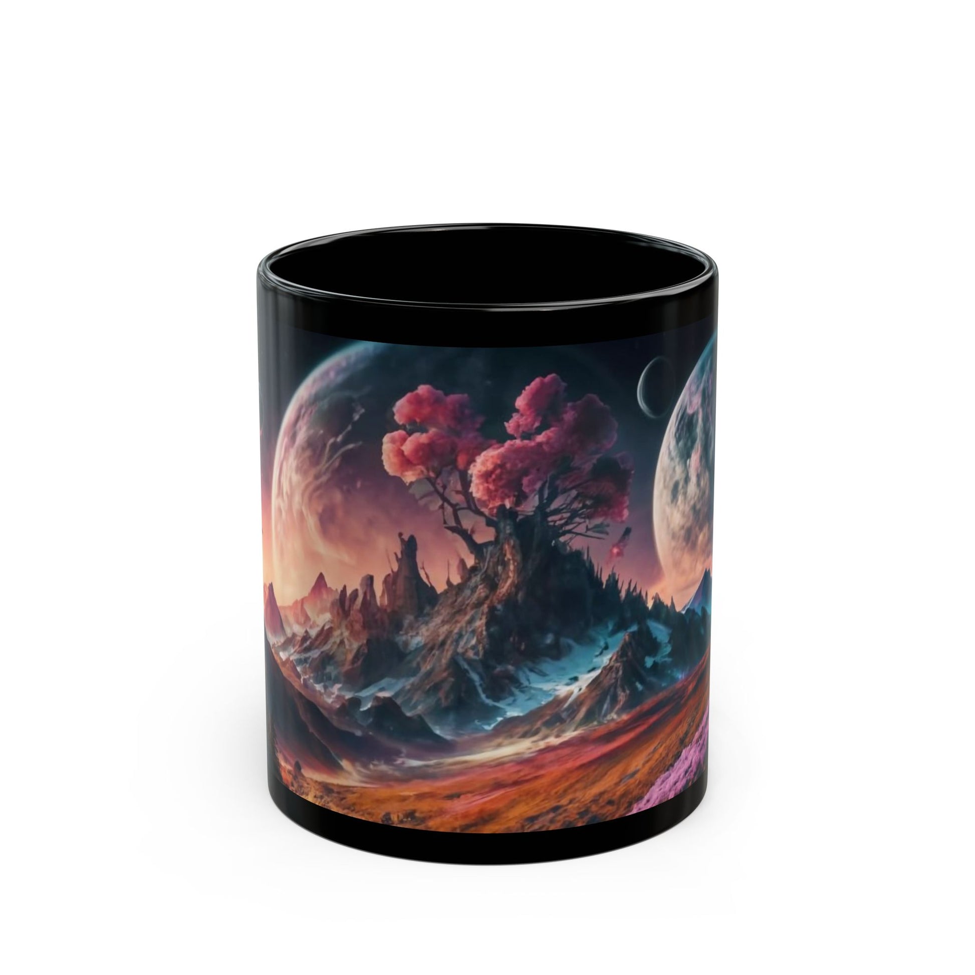 Start your day with a futuristic vibe using this ceramic coffee mug featuring a breathtaking landscape of a crimson cherry blossom tree atop a majestic mountain. The vivid backdrop showcases large, colorful planets against a bright, otherworldly skyline. Crafted from durable ceramic, this BPA and lead-free mug is available in 11oz and 15oz sizes, perfect for your favorite coffee, tea, or cocoa. Microwave and dishwasher safe, it’s a striking blend of art and practicality—a must-have for dreamers and sci-fi lovers alike!