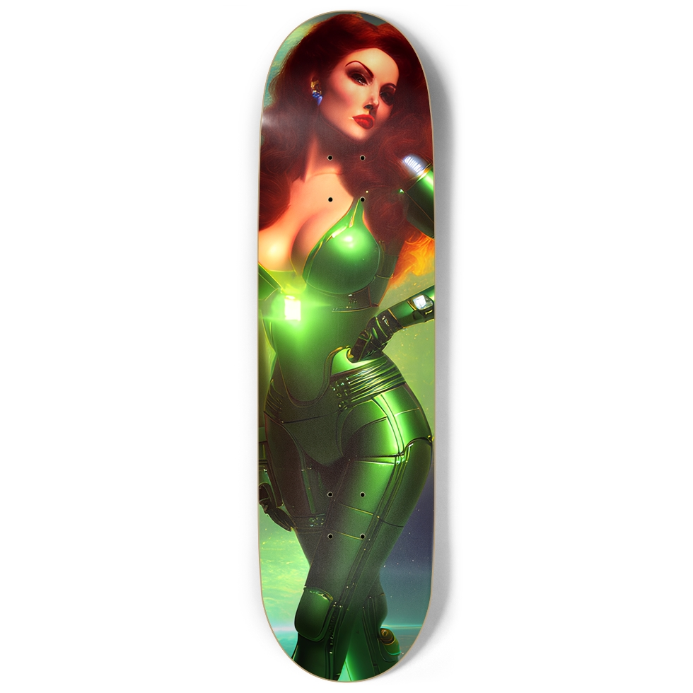 The skateboard features high-resolution graphics that capture the essence of retro-futurism and glam. The design features a striking glam girl with a futuristic twist, adding a touch of personality and flair to your skating style.