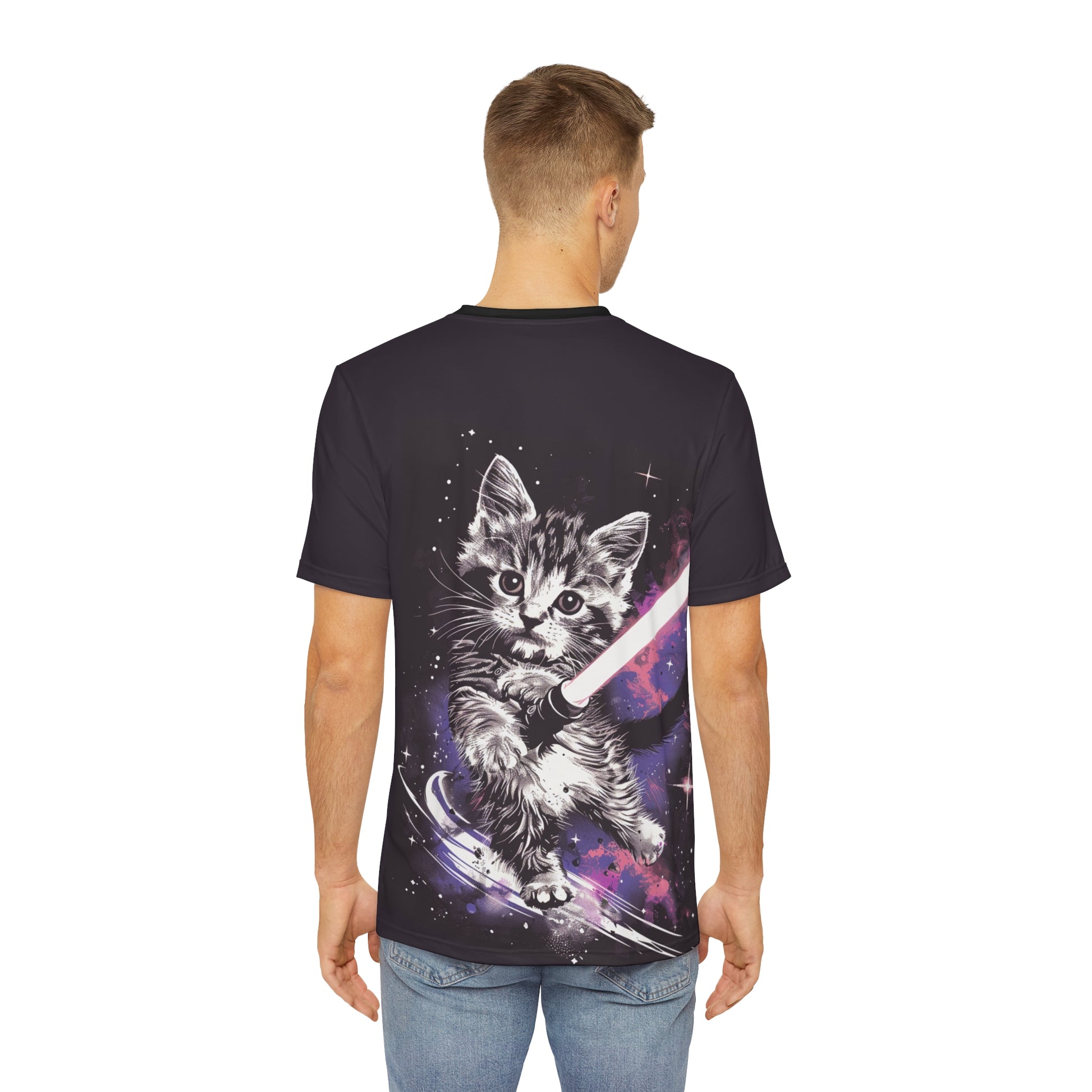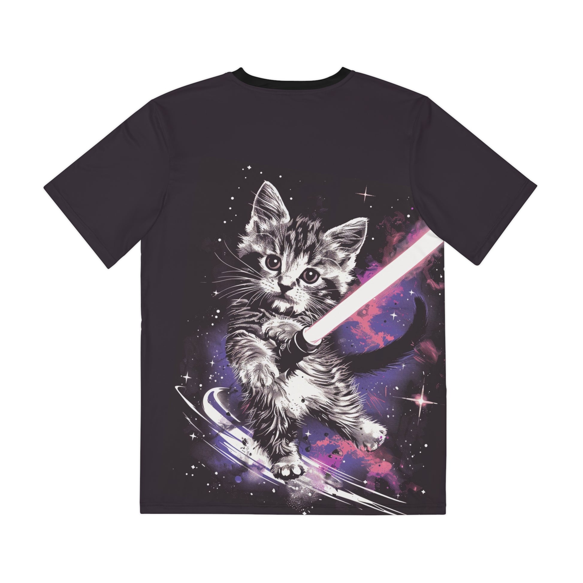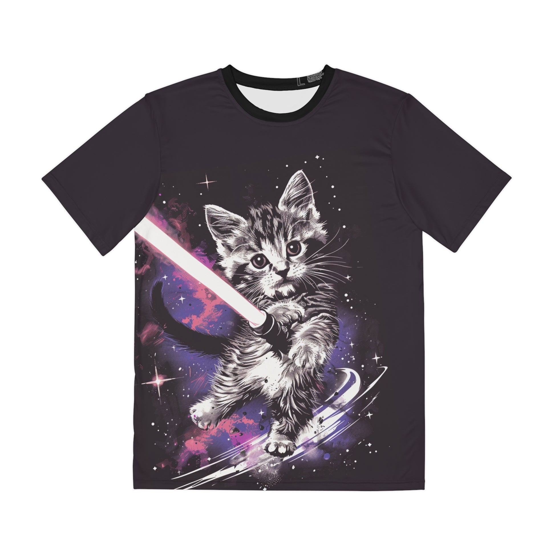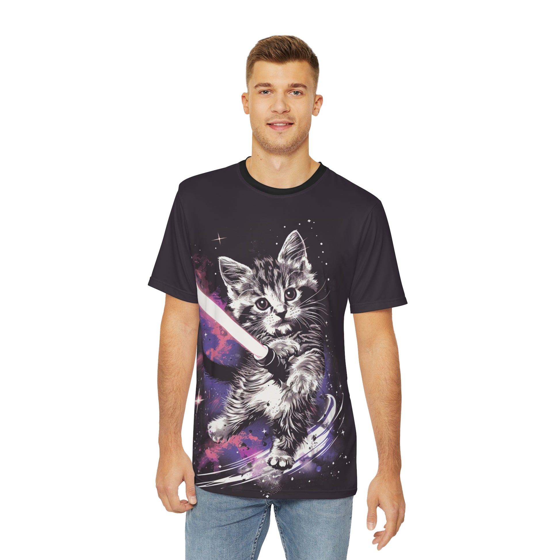 Embrace the playful spirit of a feline warrior exploring the depths of space with our captivating design featuring a charming kitten holding a lightsaber atop a mesmerizing purple-colored galaxy. The whimsical scene adds a touch of magic to your wardrobe, capturing the imagination of cat lovers and space enthusiasts alike.