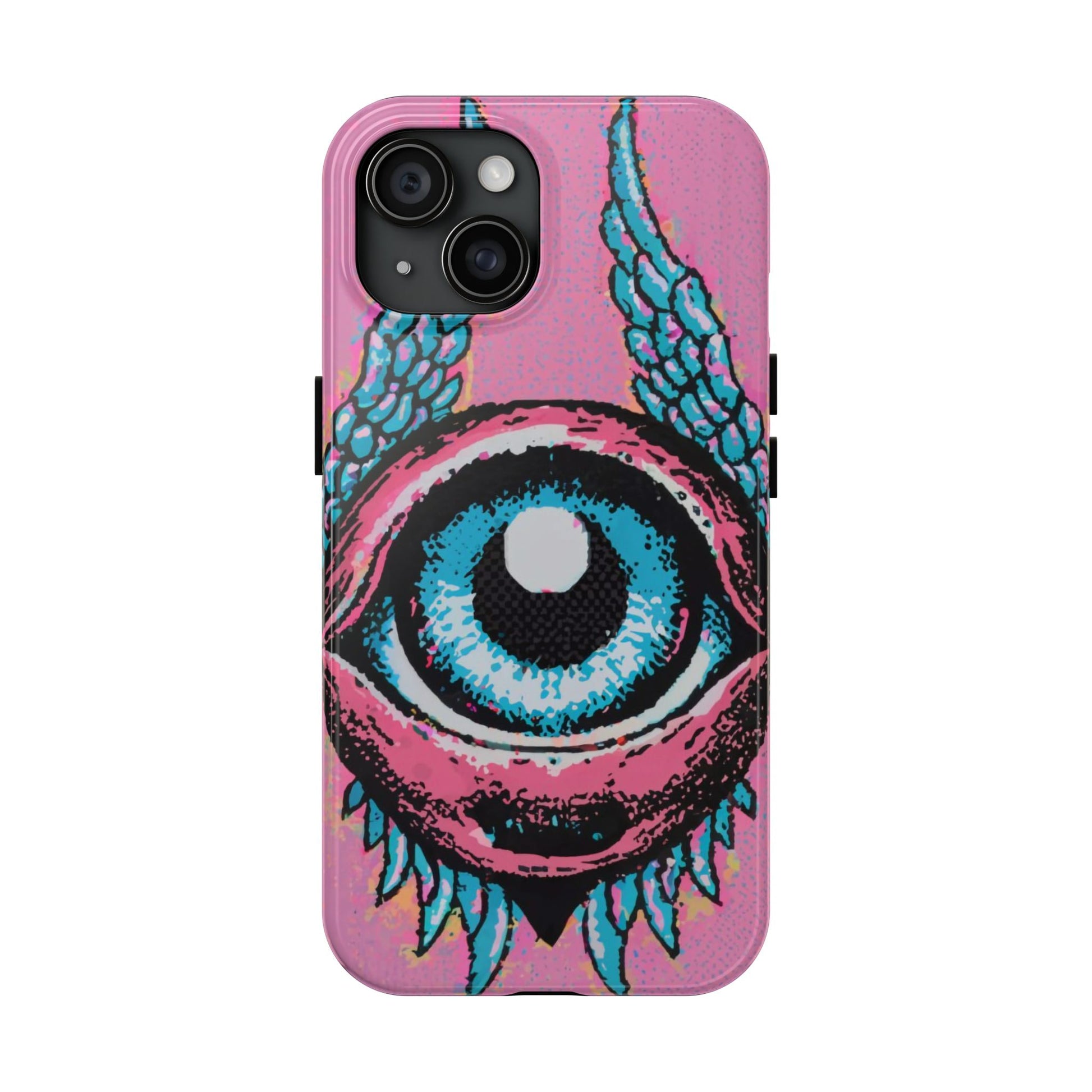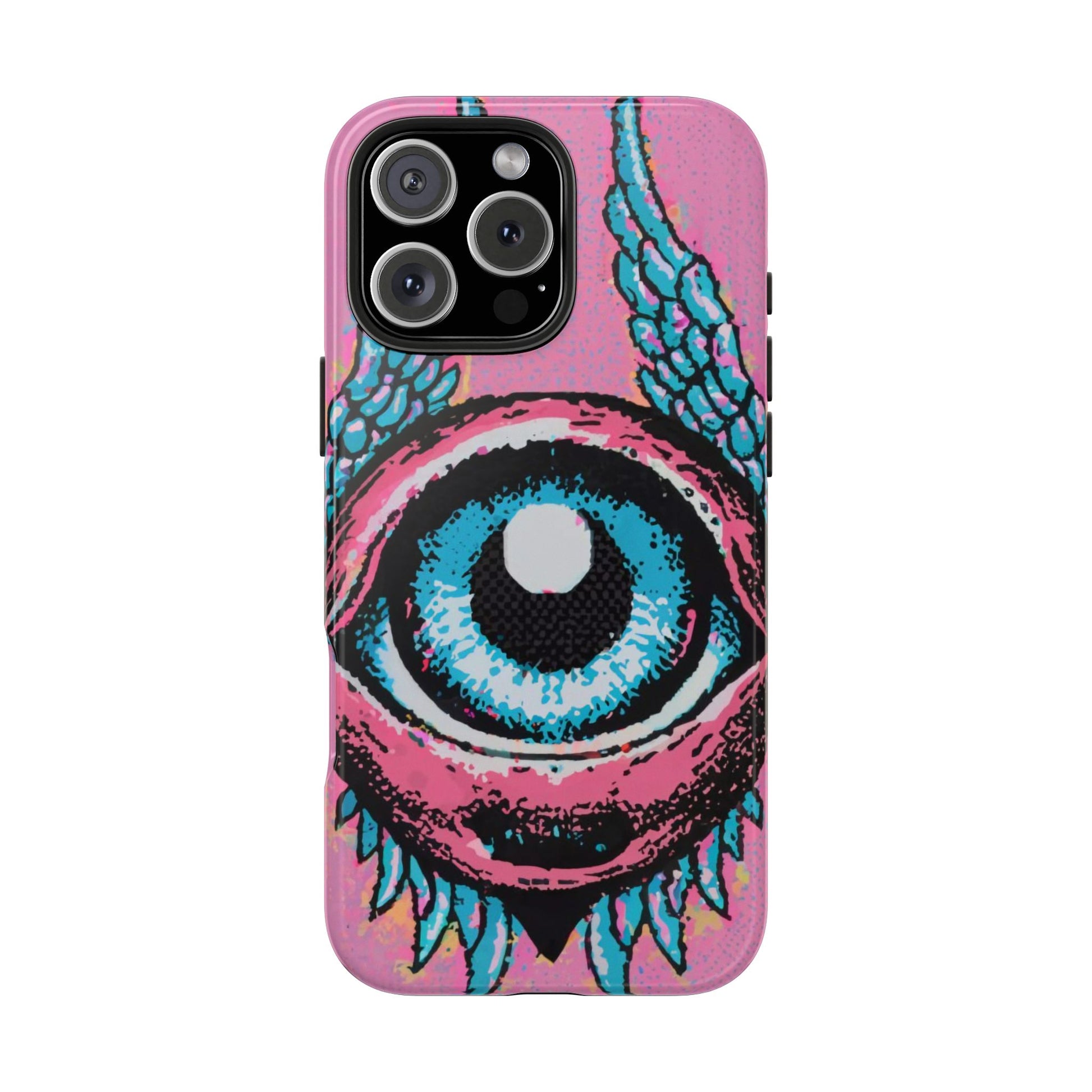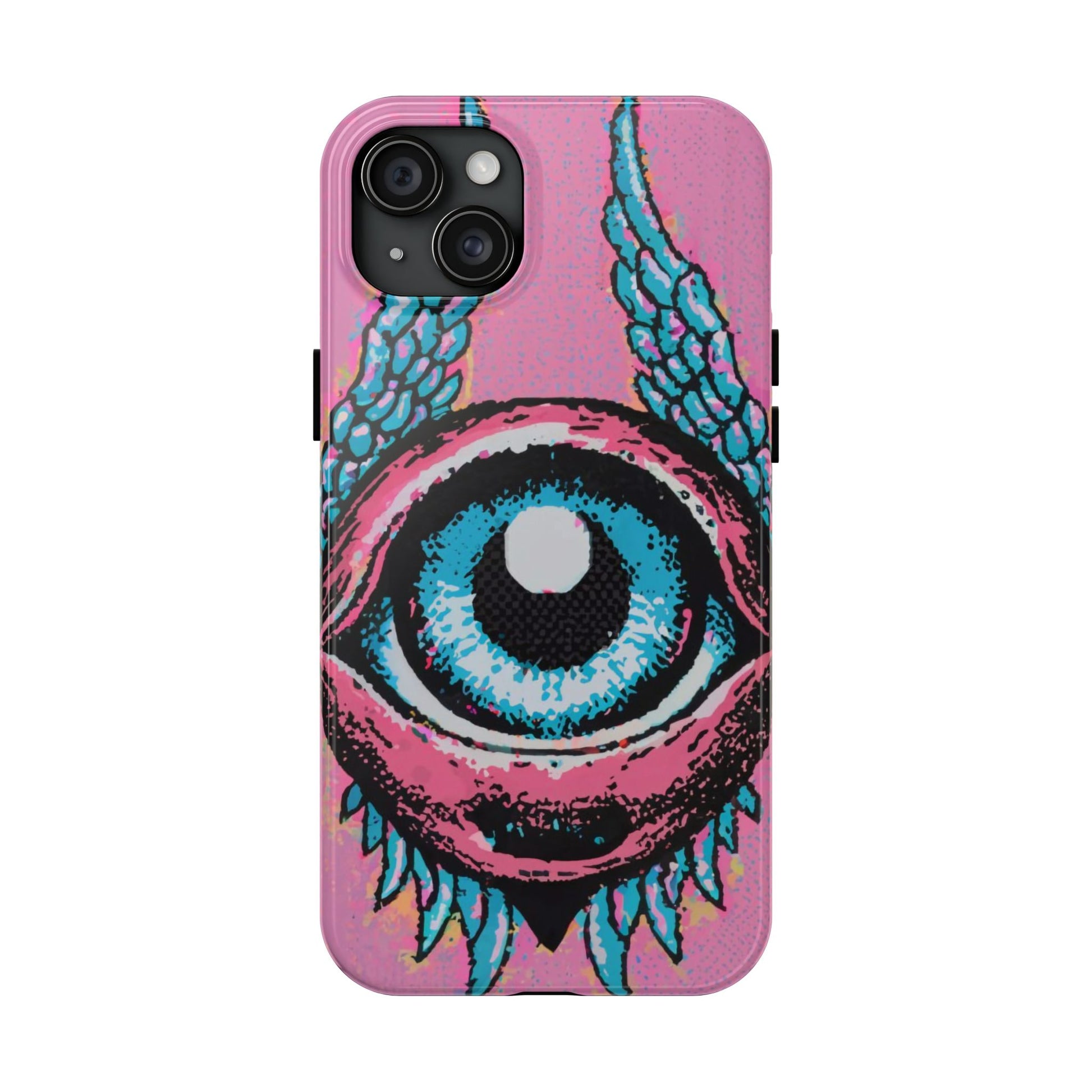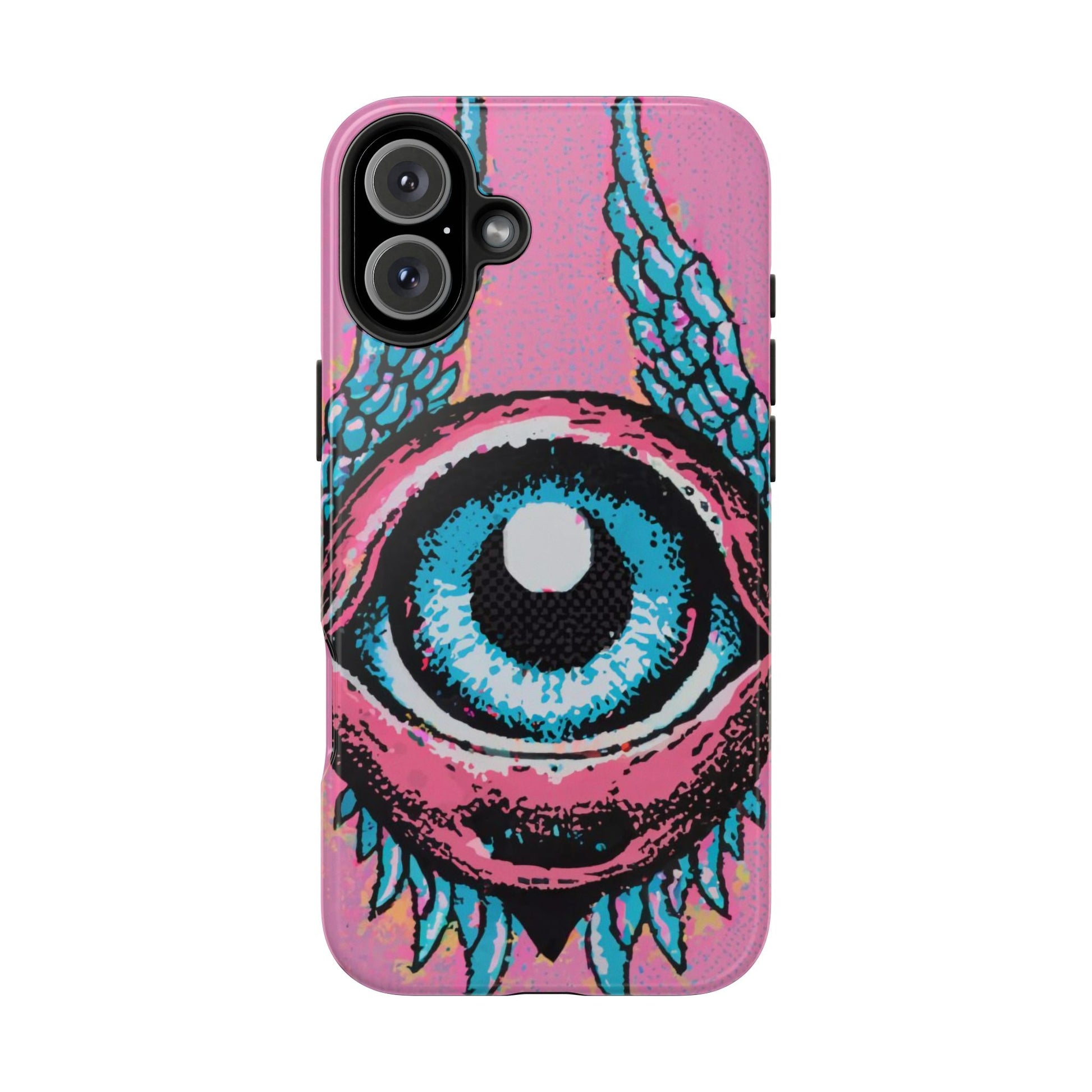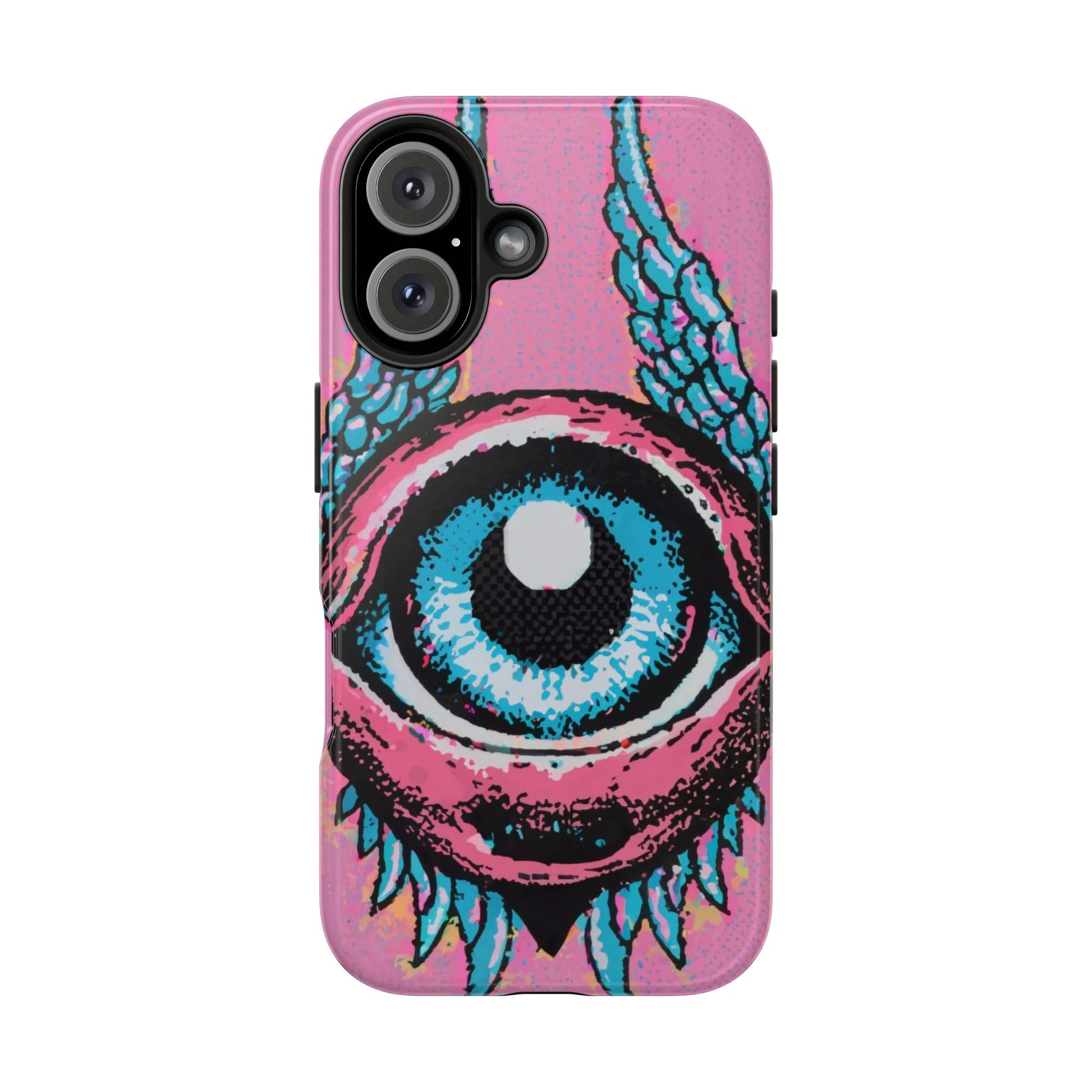 Add a touch of whimsical pop art to your iPhone with the "Halftone Horizon Eyeball iPhone Case." This striking design features a vibrant blue eyeball framed by soft pink eyelids, flanked by dynamic blue wings, all set against a bright pink background with bold halftone detailing.Unique Design: A captivating mix of retro pop art and surreal creativity.Unmatched Protection: Built tough to keep your iPhone safe from bumps, drops, and scratches.Effortless Usability: Precise cutouts and compatibility with wireless charging make it as functional as it is fashionable.Turn heads and protect your device in style with the "Halftone Horizon Eyeball iPhone Case."