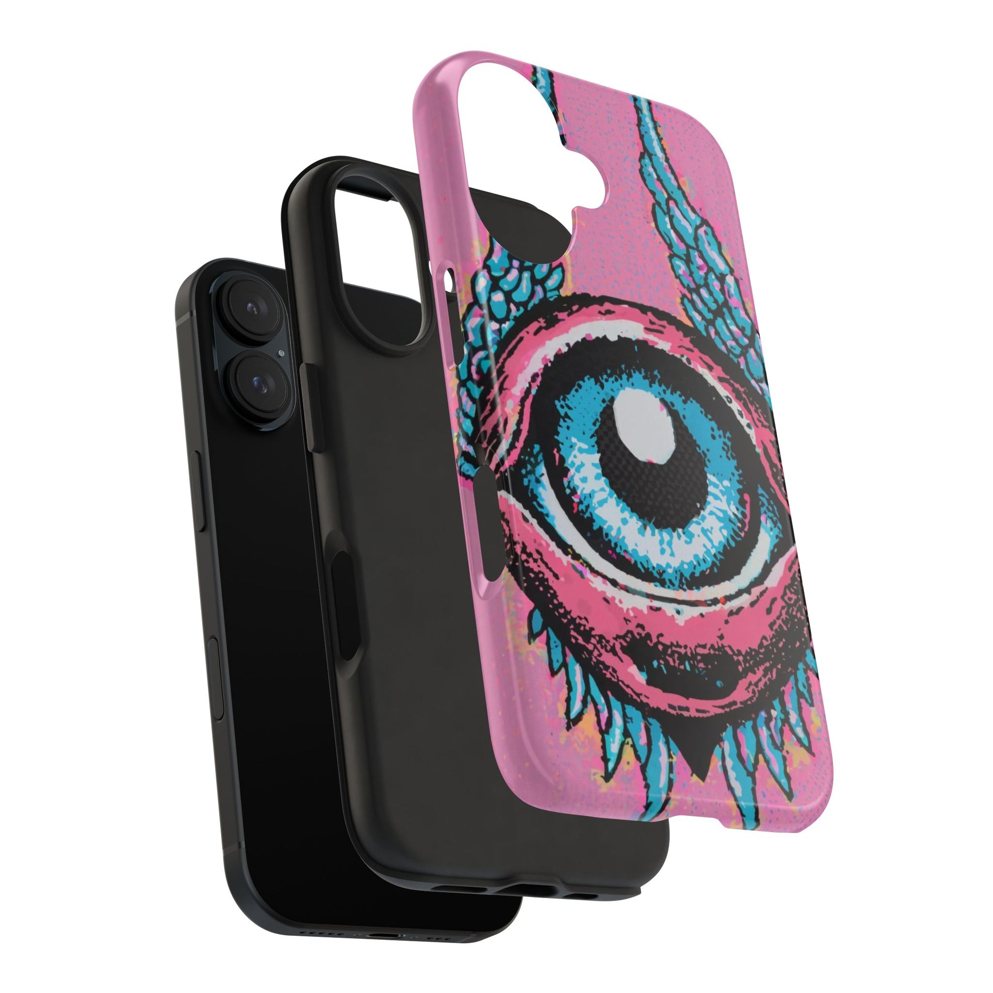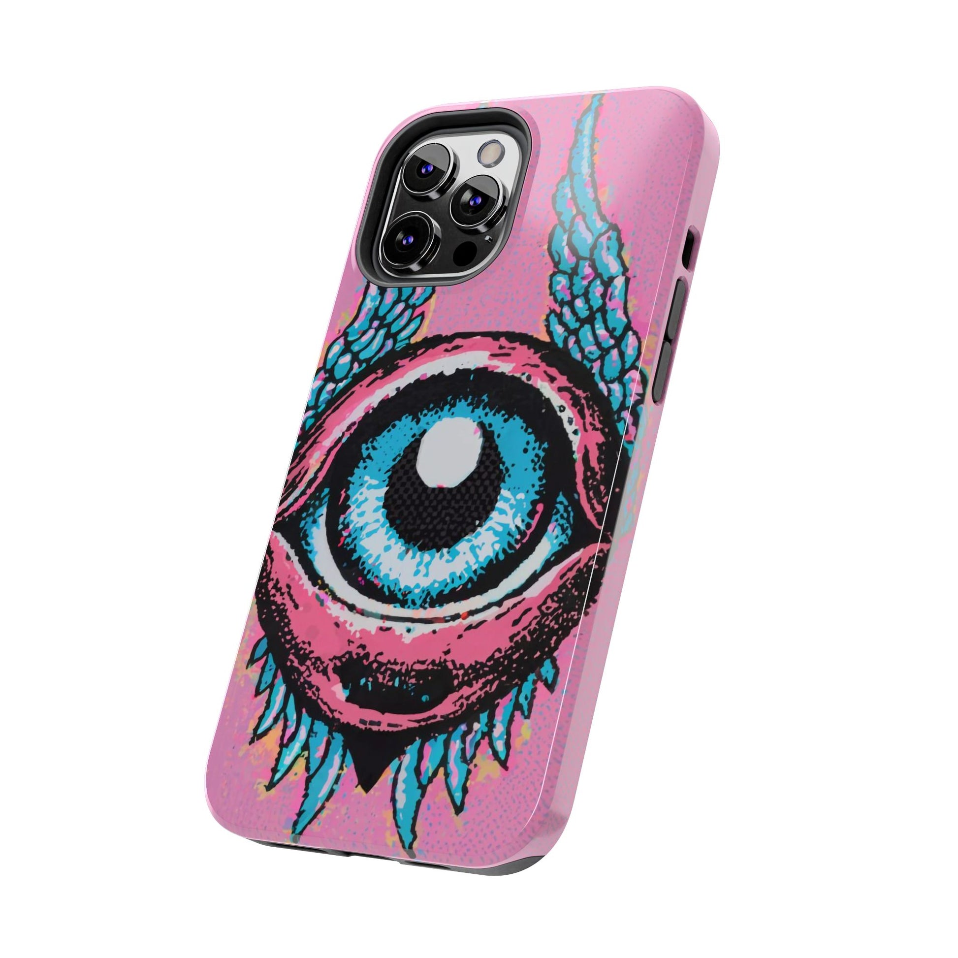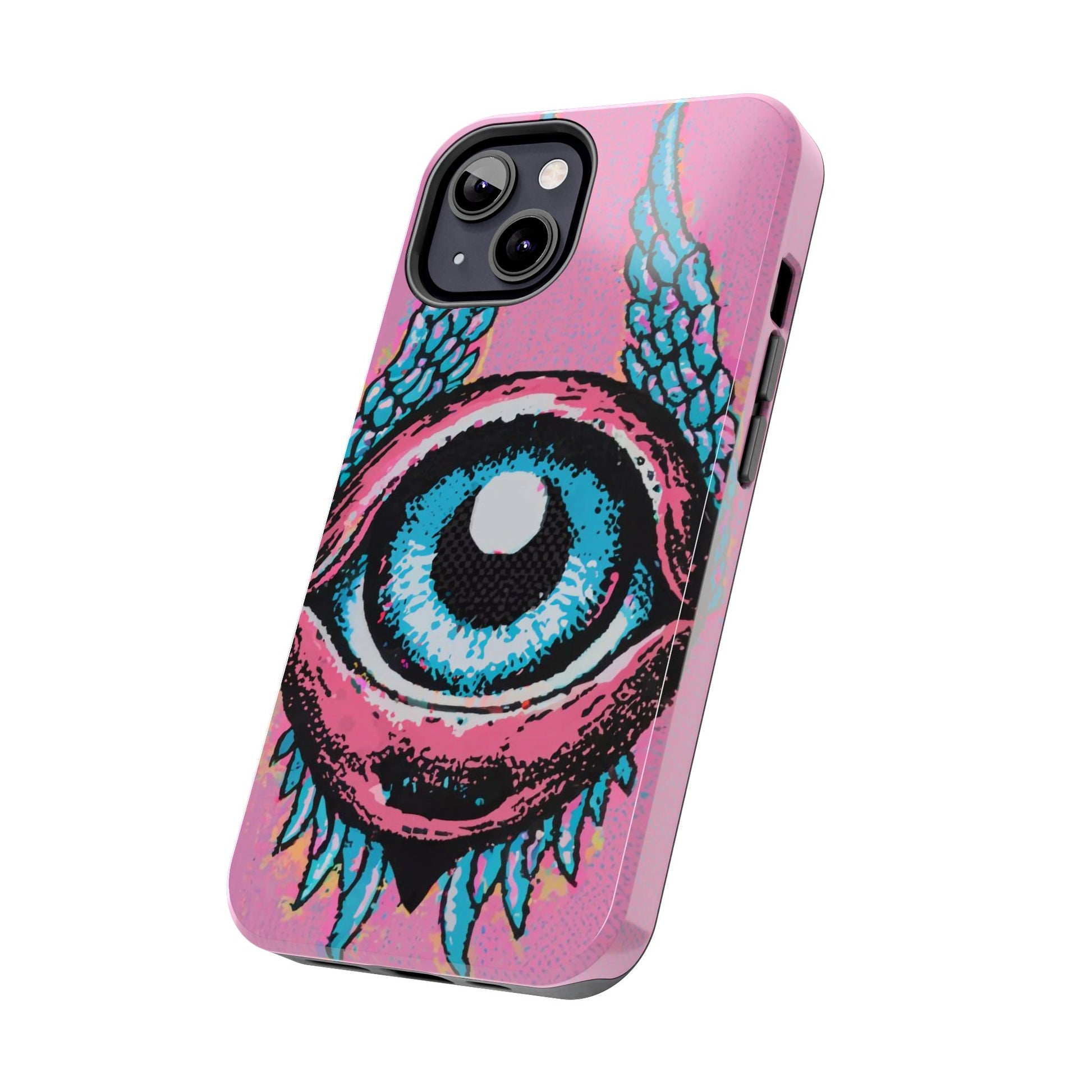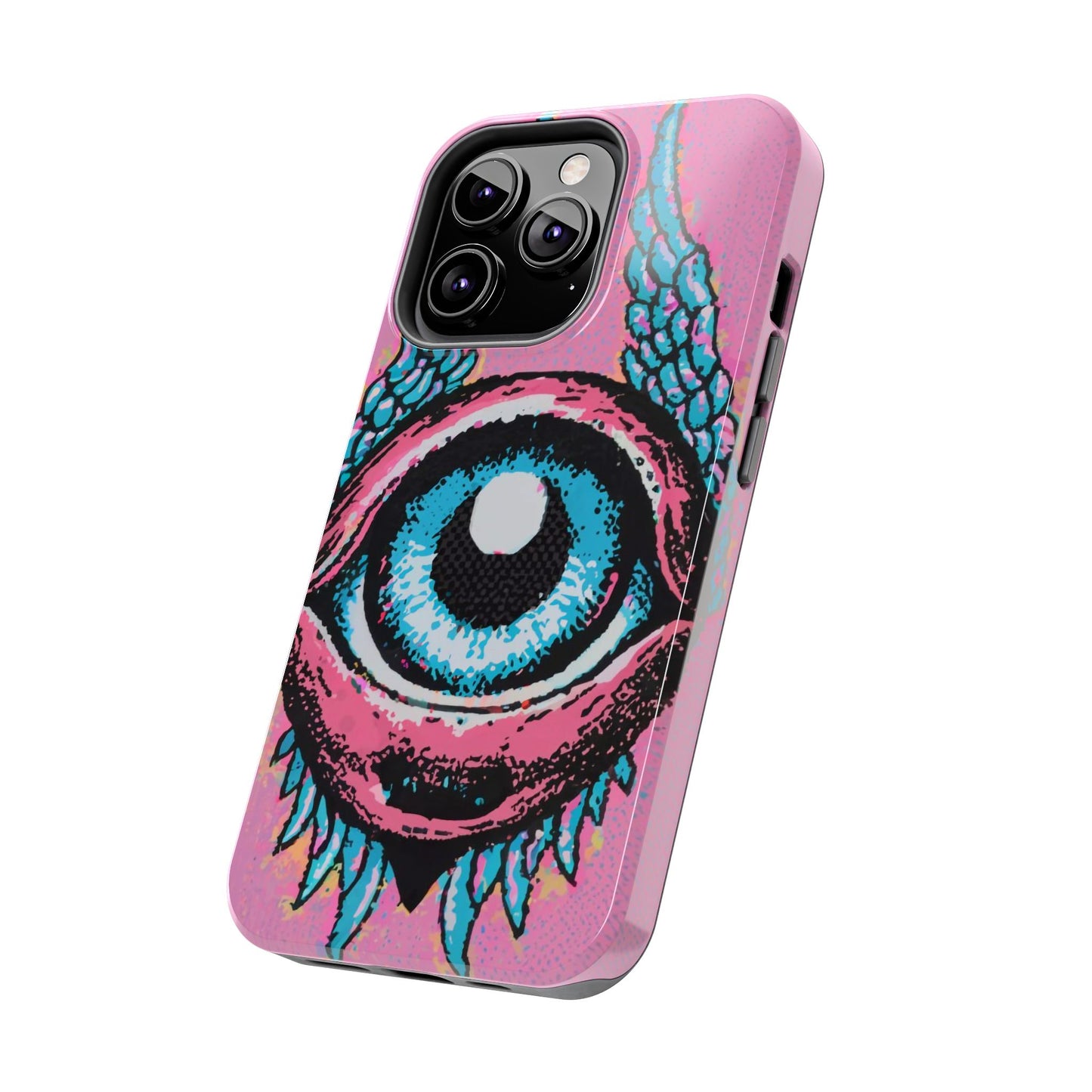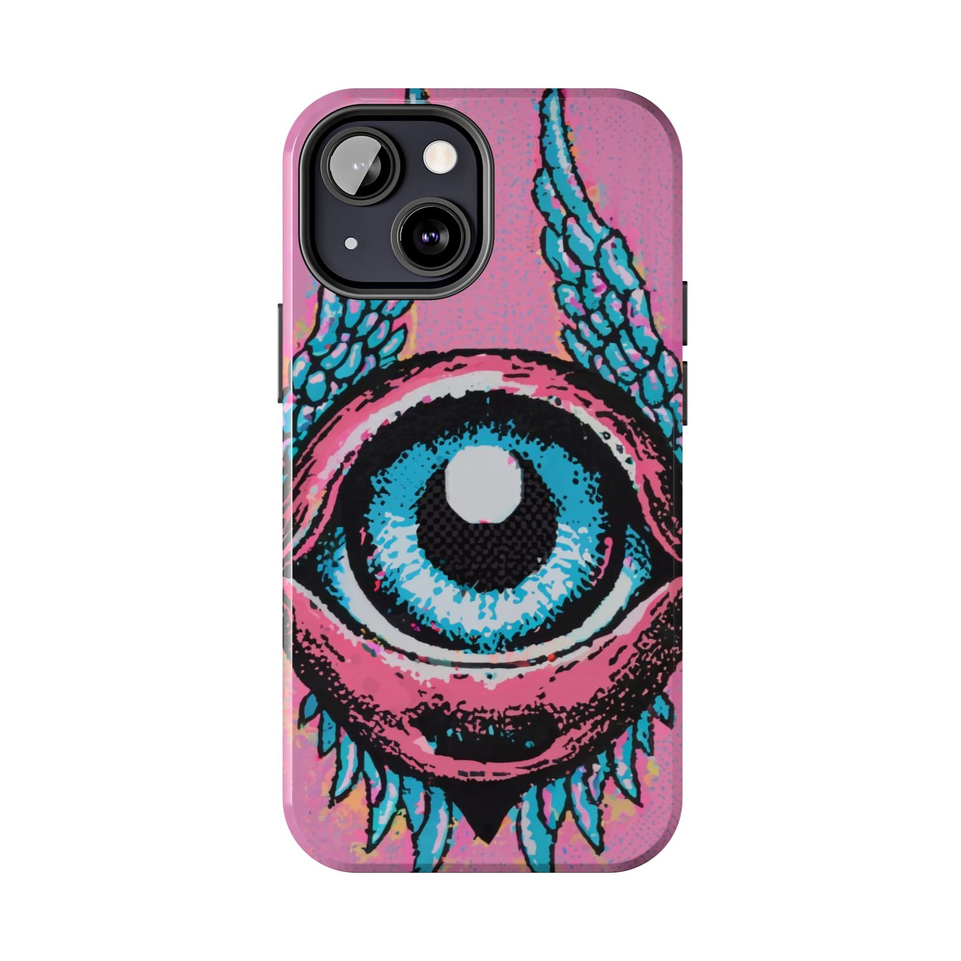 Add a touch of whimsical pop art to your iPhone with the "Halftone Horizon Eyeball iPhone Case." This striking design features a vibrant blue eyeball framed by soft pink eyelids, flanked by dynamic blue wings, all set against a bright pink background with bold halftone detailing.Unique Design: A captivating mix of retro pop art and surreal creativity.Unmatched Protection: Built tough to keep your iPhone safe from bumps, drops, and scratches.Effortless Usability: Precise cutouts and compatibility with wireless charging make it as functional as it is fashionable.Turn heads and protect your device in style with the "Halftone Horizon Eyeball iPhone Case."