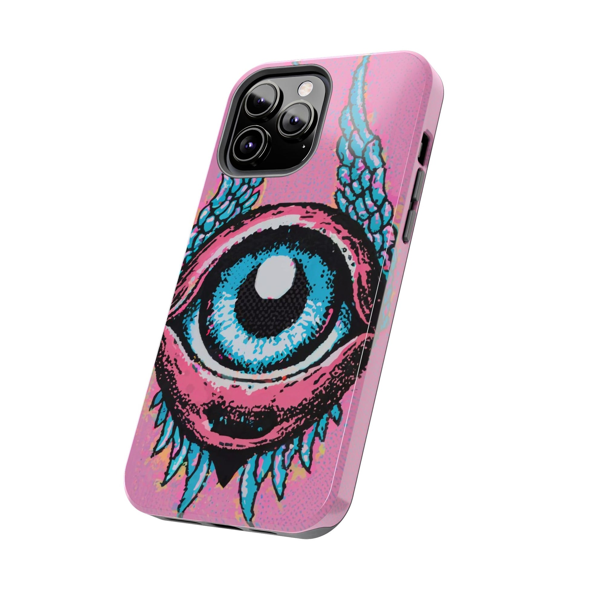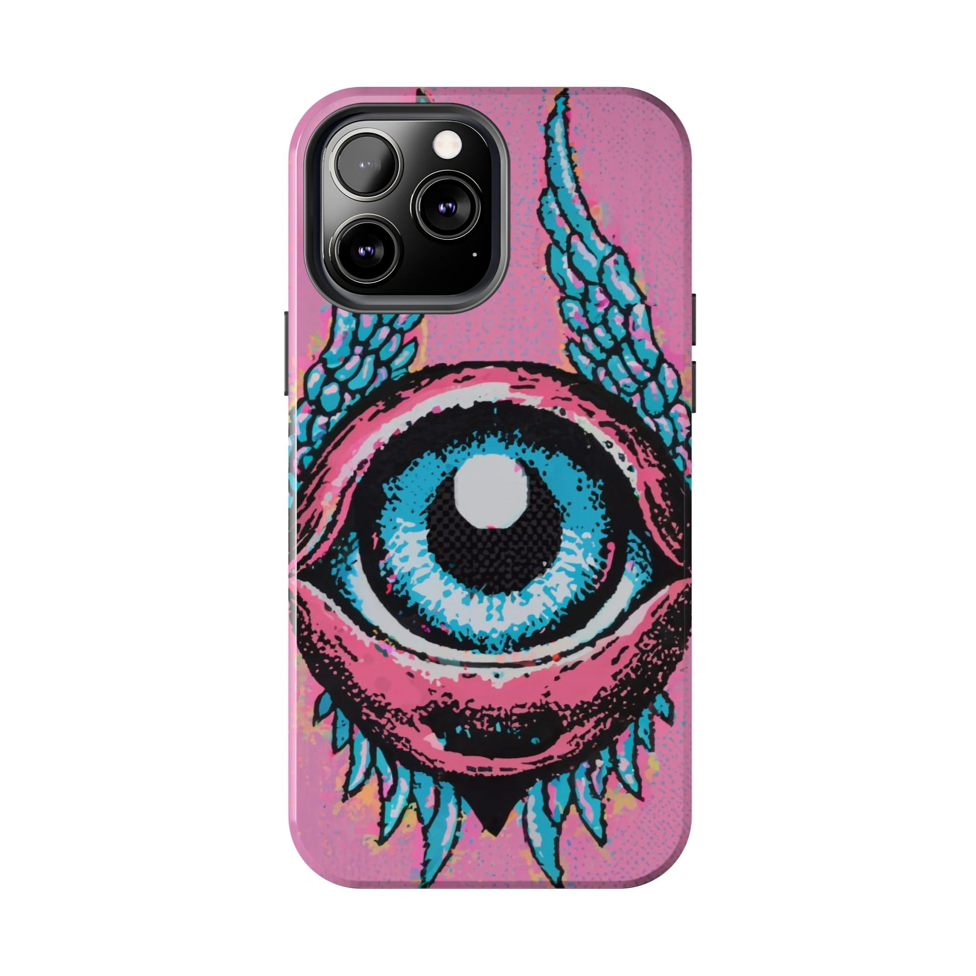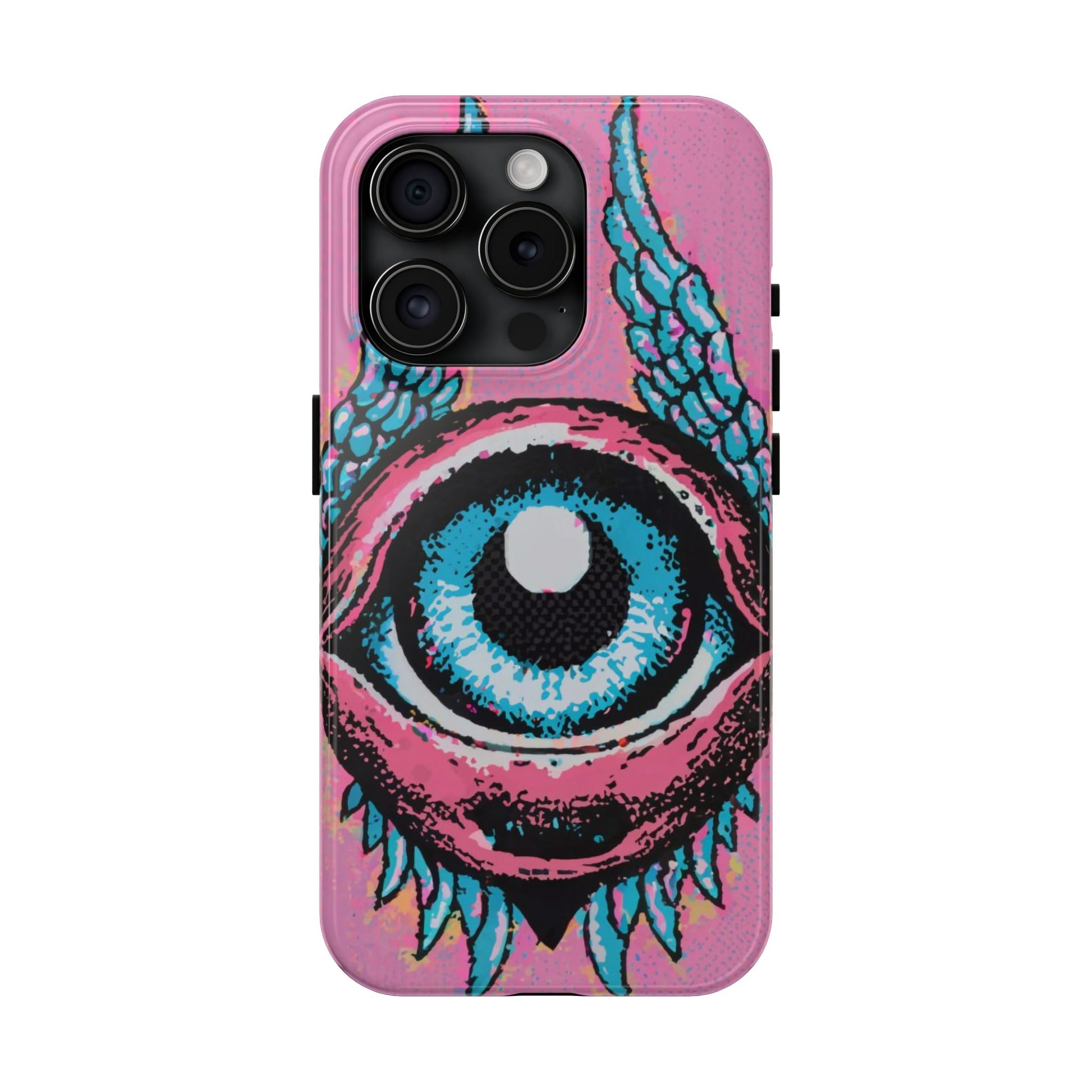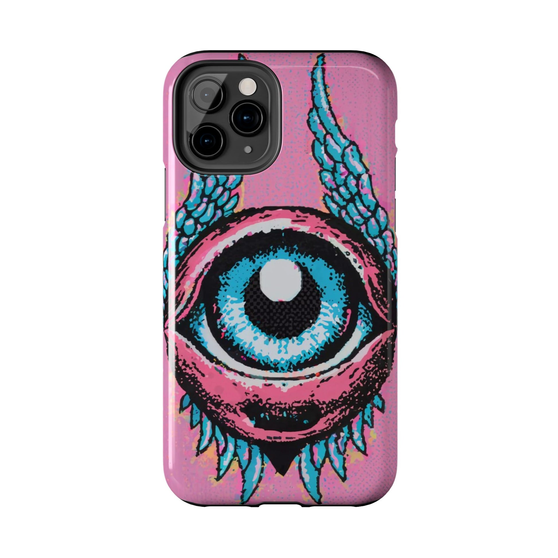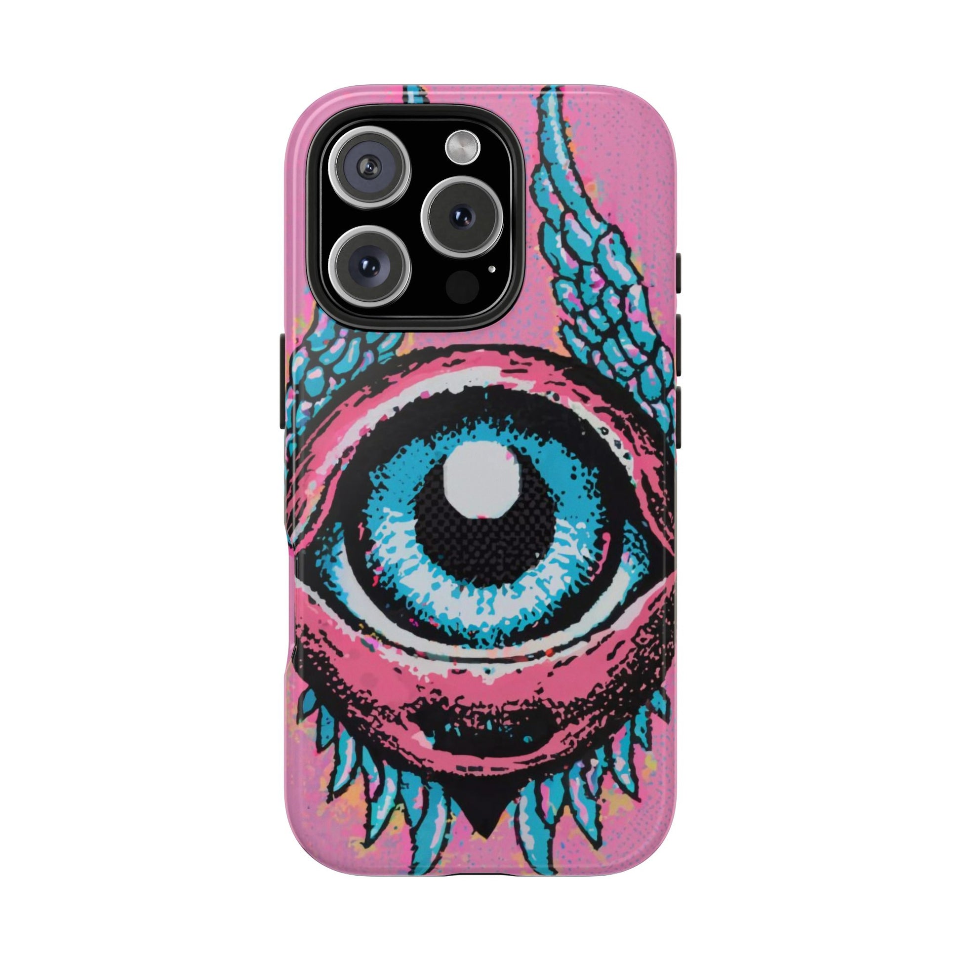 Add a touch of whimsical pop art to your iPhone with the "Halftone Horizon Eyeball iPhone Case." This striking design features a vibrant blue eyeball framed by soft pink eyelids, flanked by dynamic blue wings, all set against a bright pink background with bold halftone detailing.Unique Design: A captivating mix of retro pop art and surreal creativity.Unmatched Protection: Built tough to keep your iPhone safe from bumps, drops, and scratches.Effortless Usability: Precise cutouts and compatibility with wireless charging make it as functional as it is fashionable.Turn heads and protect your device in style with the "Halftone Horizon Eyeball iPhone Case."