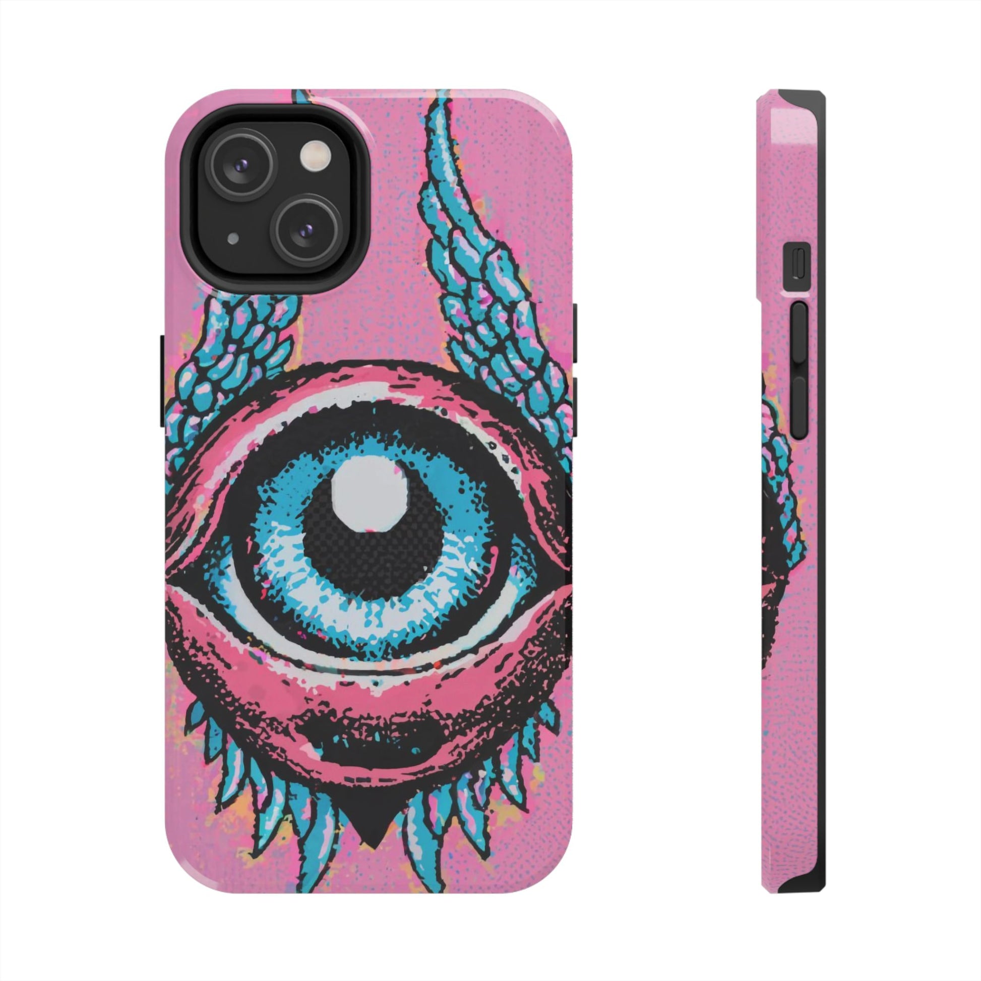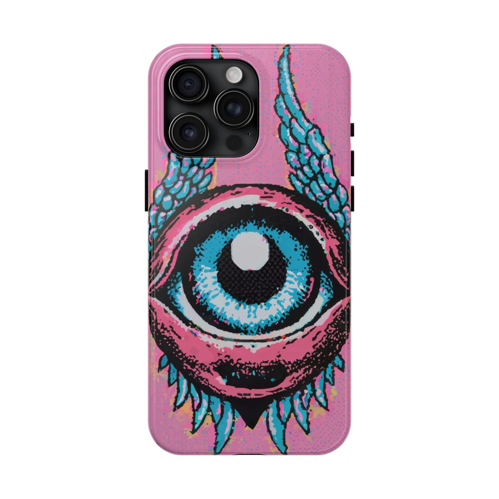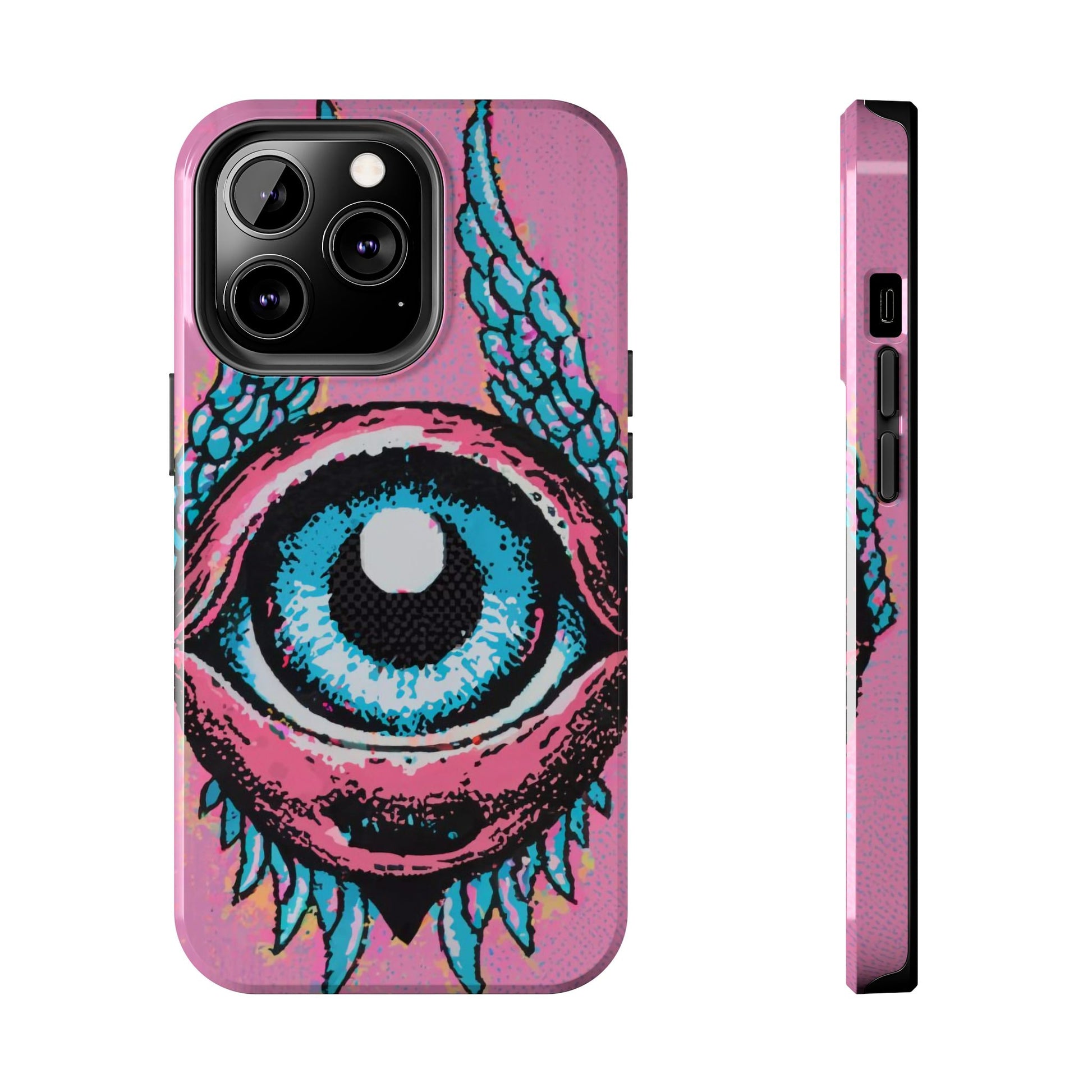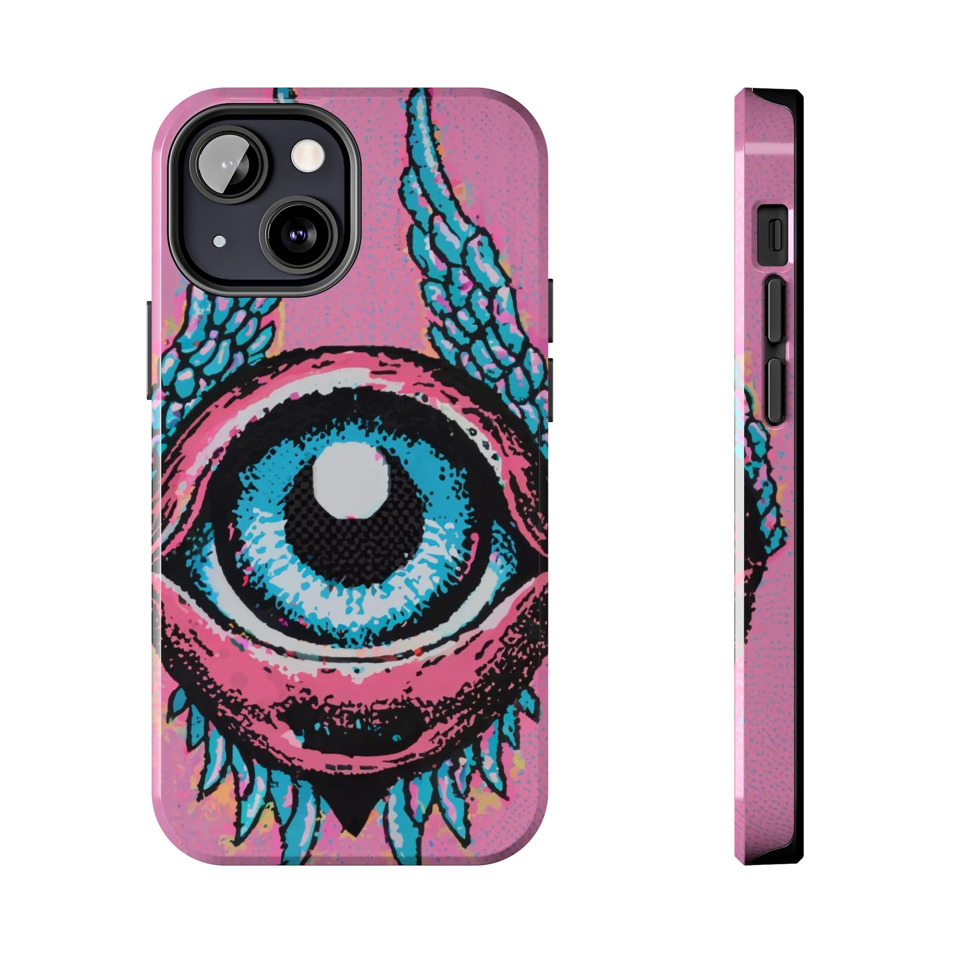 Add a touch of whimsical pop art to your iPhone with the "Halftone Horizon Eyeball iPhone Case." This striking design features a vibrant blue eyeball framed by soft pink eyelids, flanked by dynamic blue wings, all set against a bright pink background with bold halftone detailing.Unique Design: A captivating mix of retro pop art and surreal creativity.Unmatched Protection: Built tough to keep your iPhone safe from bumps, drops, and scratches.Effortless Usability: Precise cutouts and compatibility with wireless charging make it as functional as it is fashionable.Turn heads and protect your device in style with the "Halftone Horizon Eyeball iPhone Case."