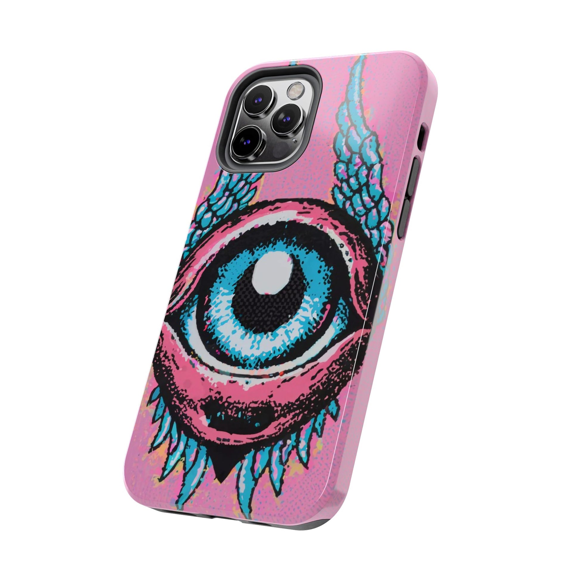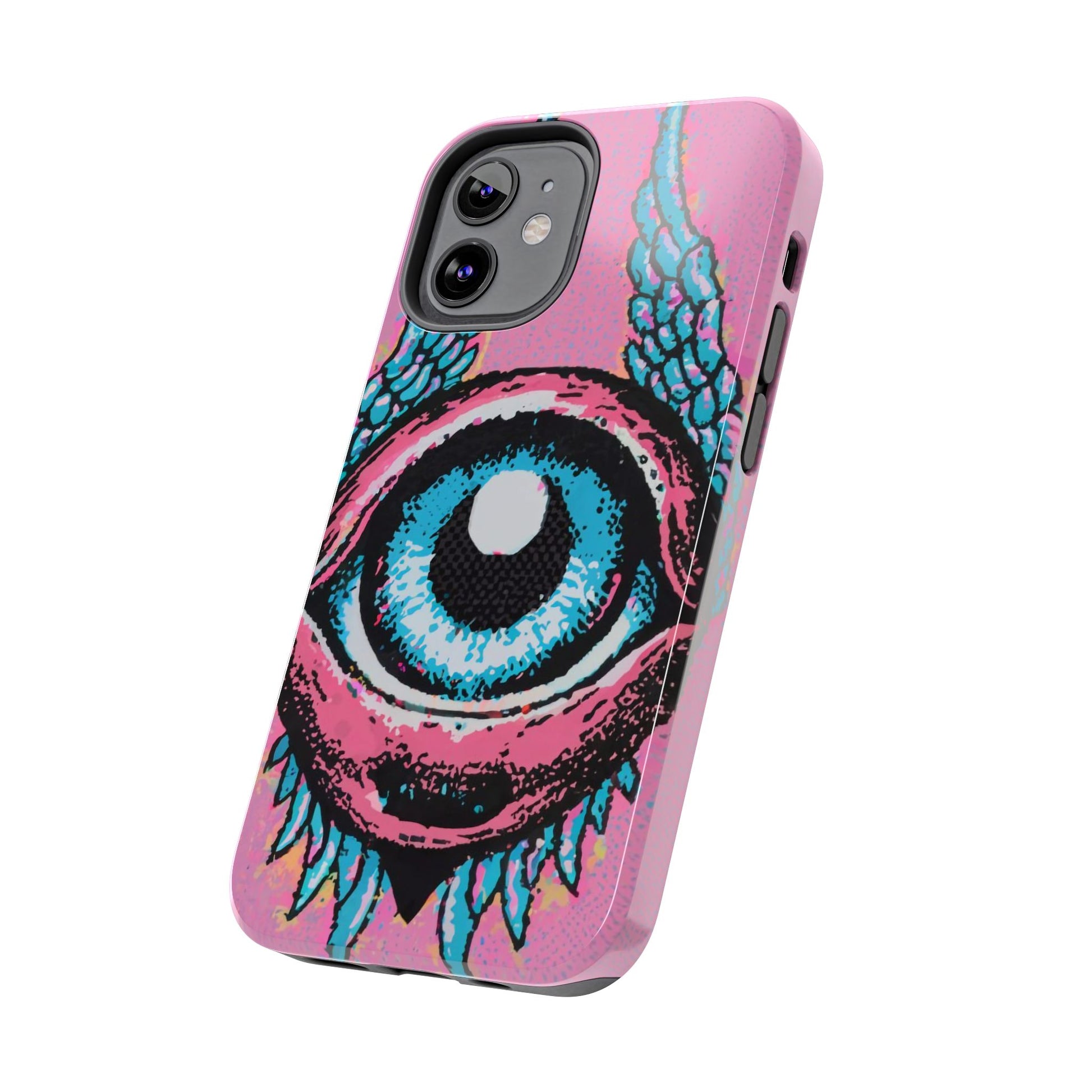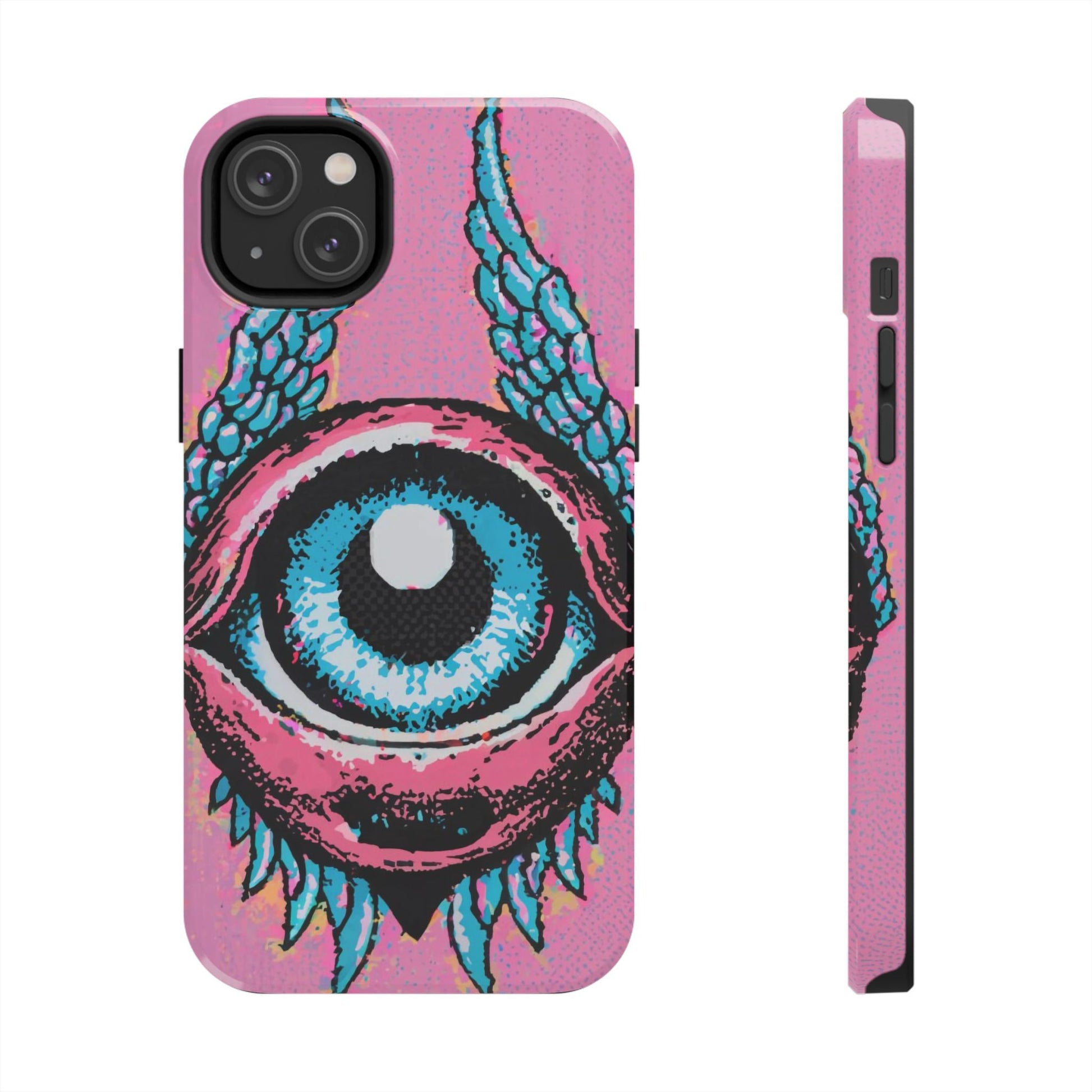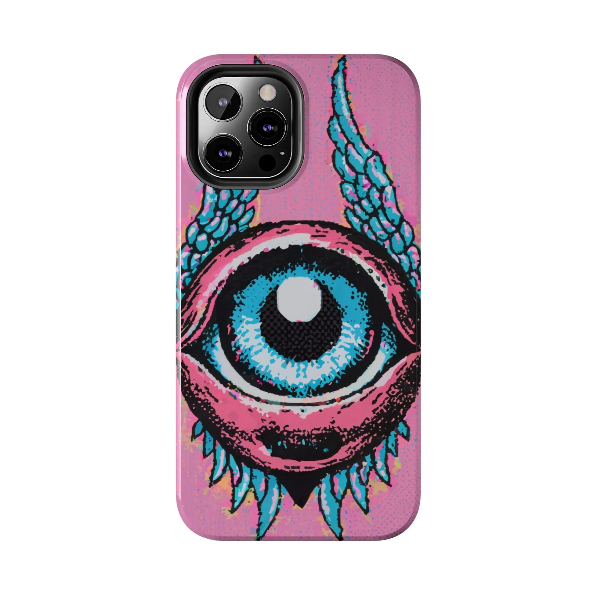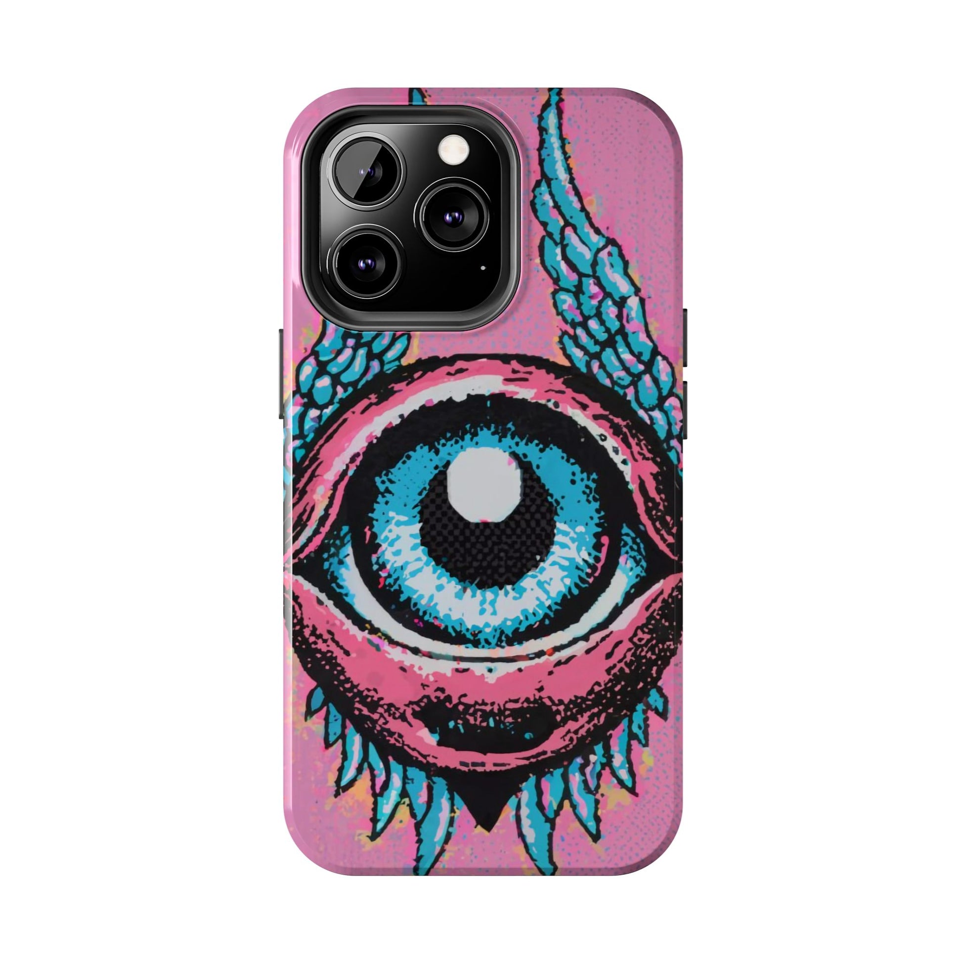 Add a touch of whimsical pop art to your iPhone with the "Halftone Horizon Eyeball iPhone Case." This striking design features a vibrant blue eyeball framed by soft pink eyelids, flanked by dynamic blue wings, all set against a bright pink background with bold halftone detailing.Unique Design: A captivating mix of retro pop art and surreal creativity.Unmatched Protection: Built tough to keep your iPhone safe from bumps, drops, and scratches.Effortless Usability: Precise cutouts and compatibility with wireless charging make it as functional as it is fashionable.Turn heads and protect your device in style with the "Halftone Horizon Eyeball iPhone Case."