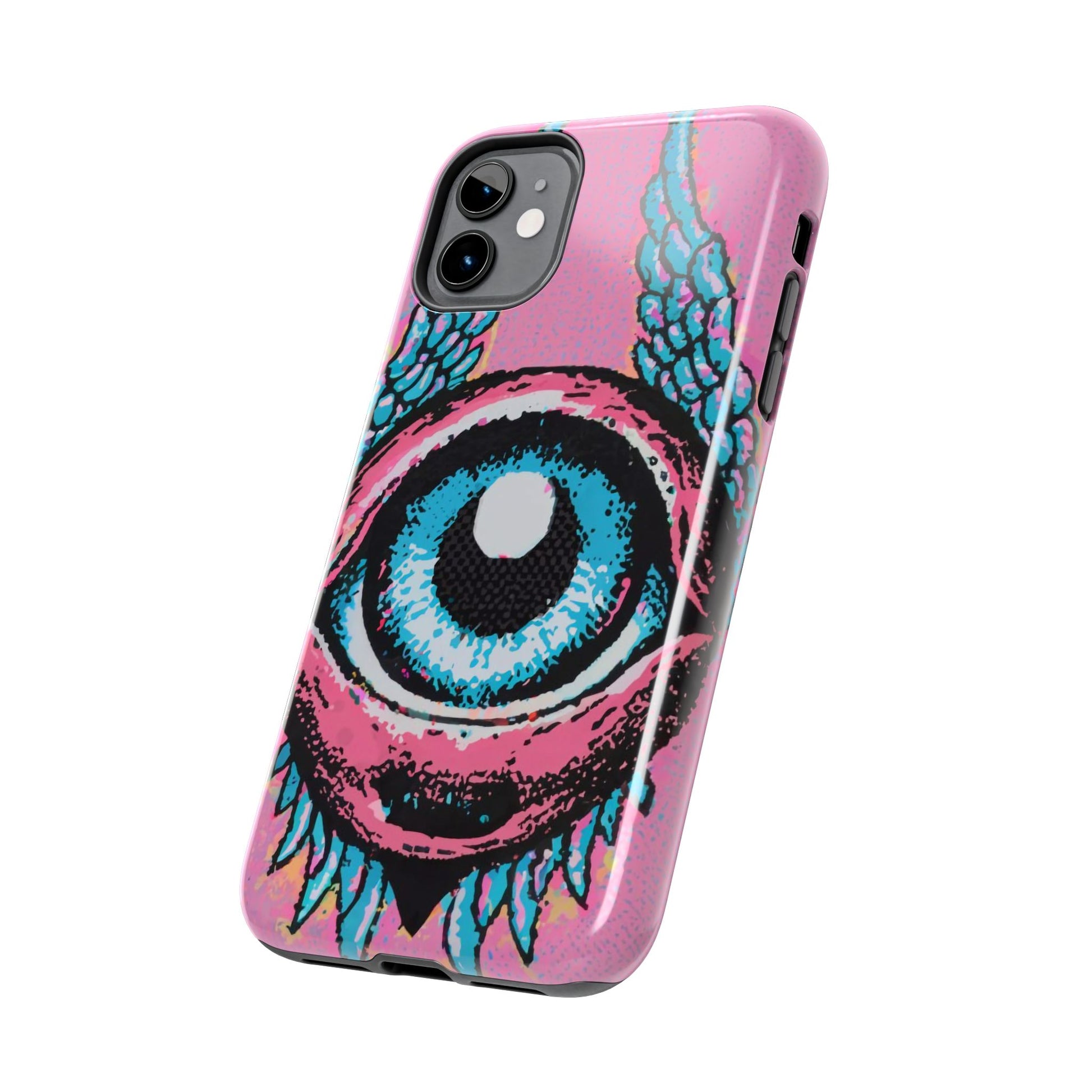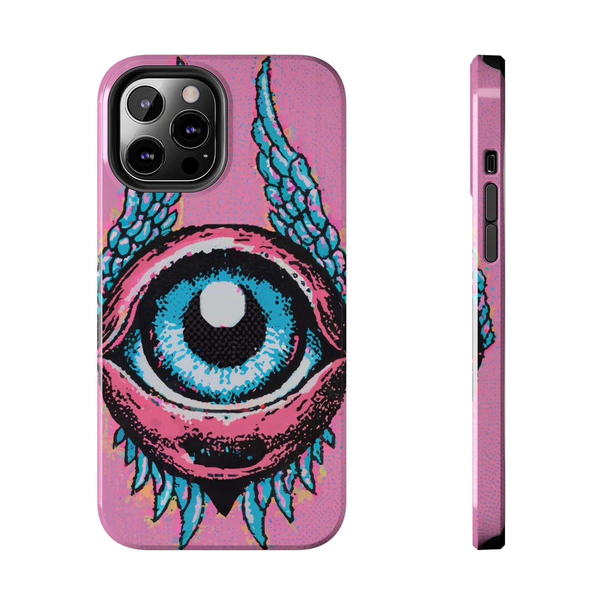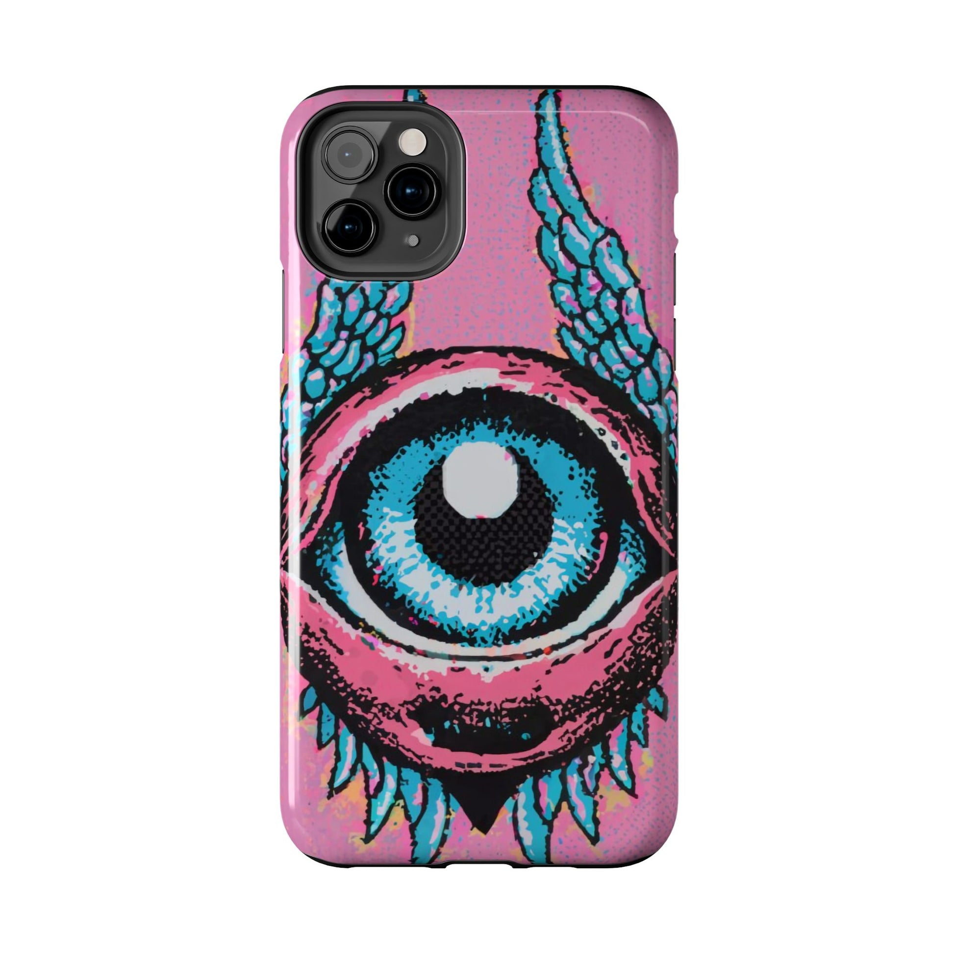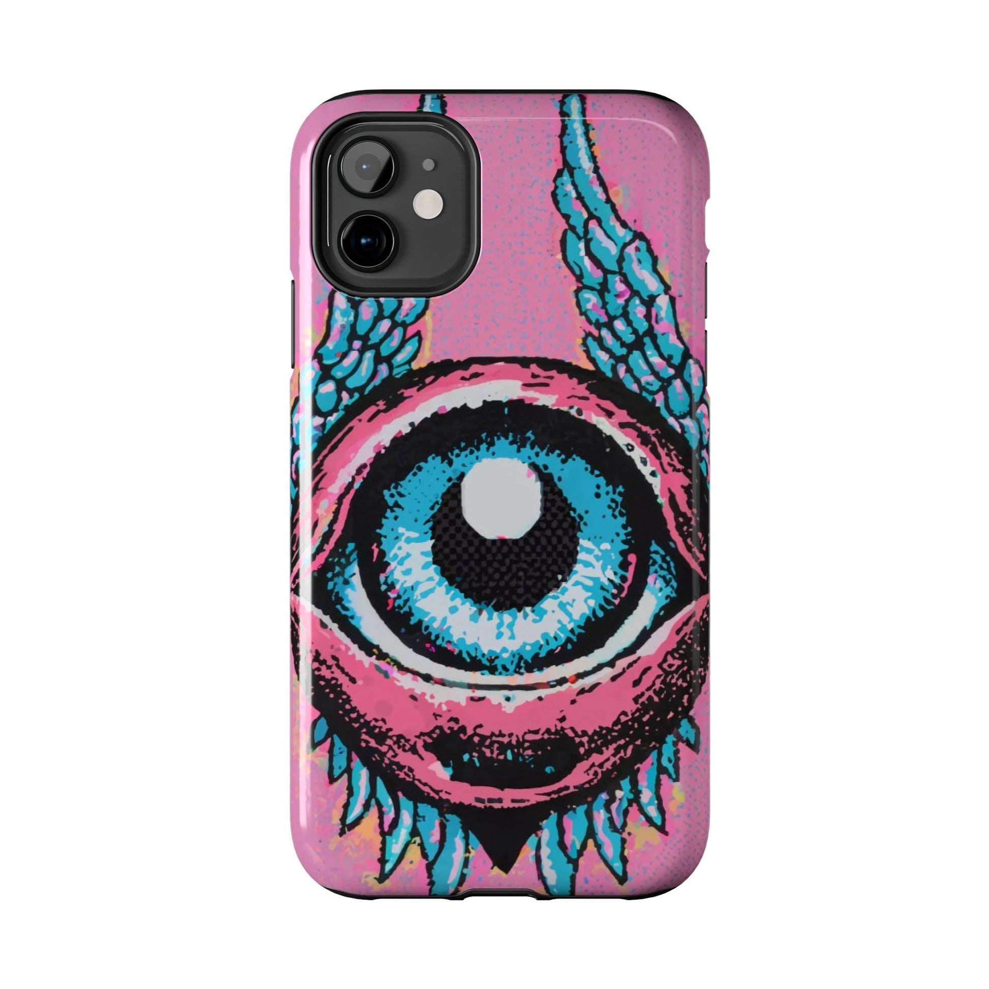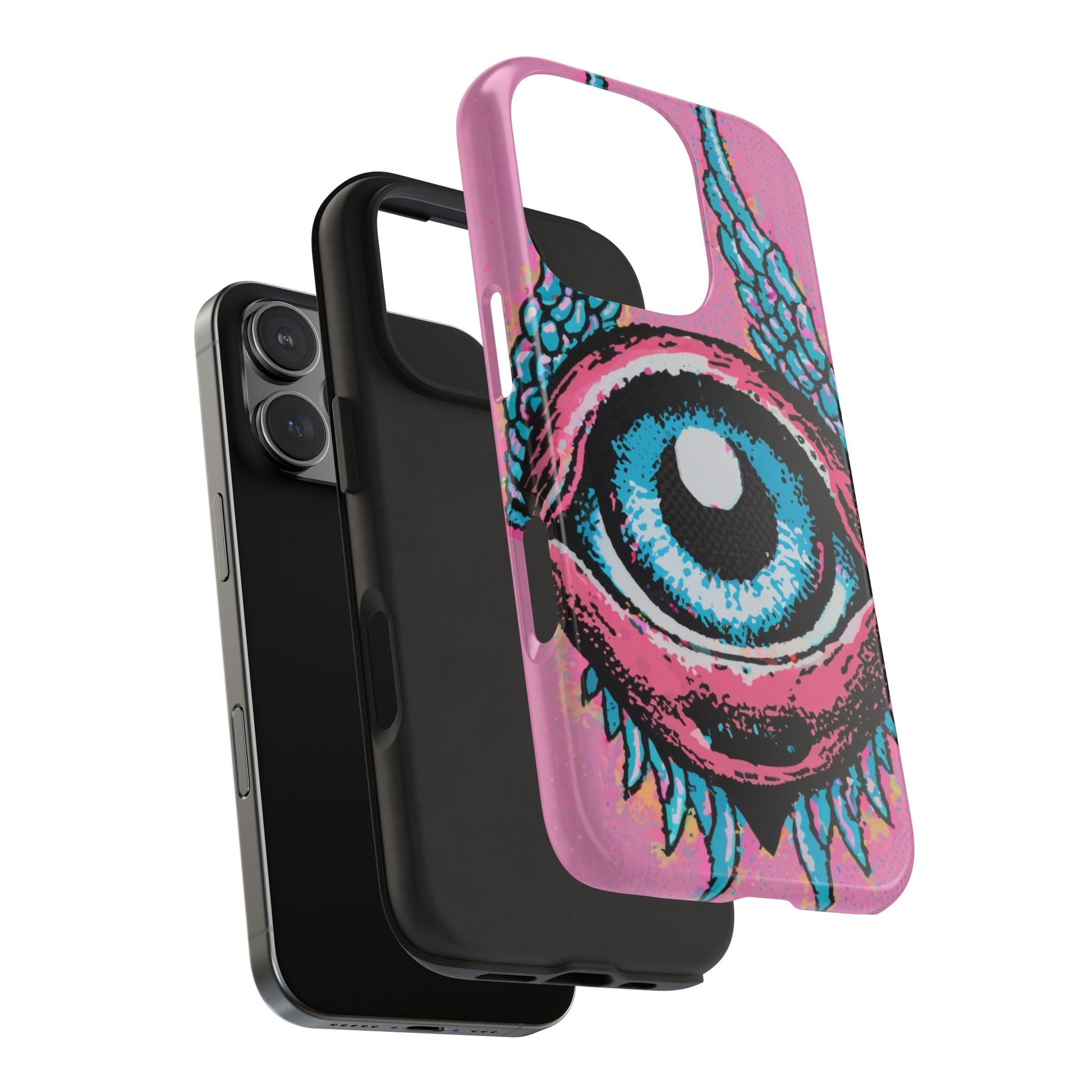 Add a touch of whimsical pop art to your iPhone with the "Halftone Horizon Eyeball iPhone Case." This striking design features a vibrant blue eyeball framed by soft pink eyelids, flanked by dynamic blue wings, all set against a bright pink background with bold halftone detailing.Unique Design: A captivating mix of retro pop art and surreal creativity.Unmatched Protection: Built tough to keep your iPhone safe from bumps, drops, and scratches.Effortless Usability: Precise cutouts and compatibility with wireless charging make it as functional as it is fashionable.Turn heads and protect your device in style with the "Halftone Horizon Eyeball iPhone Case."