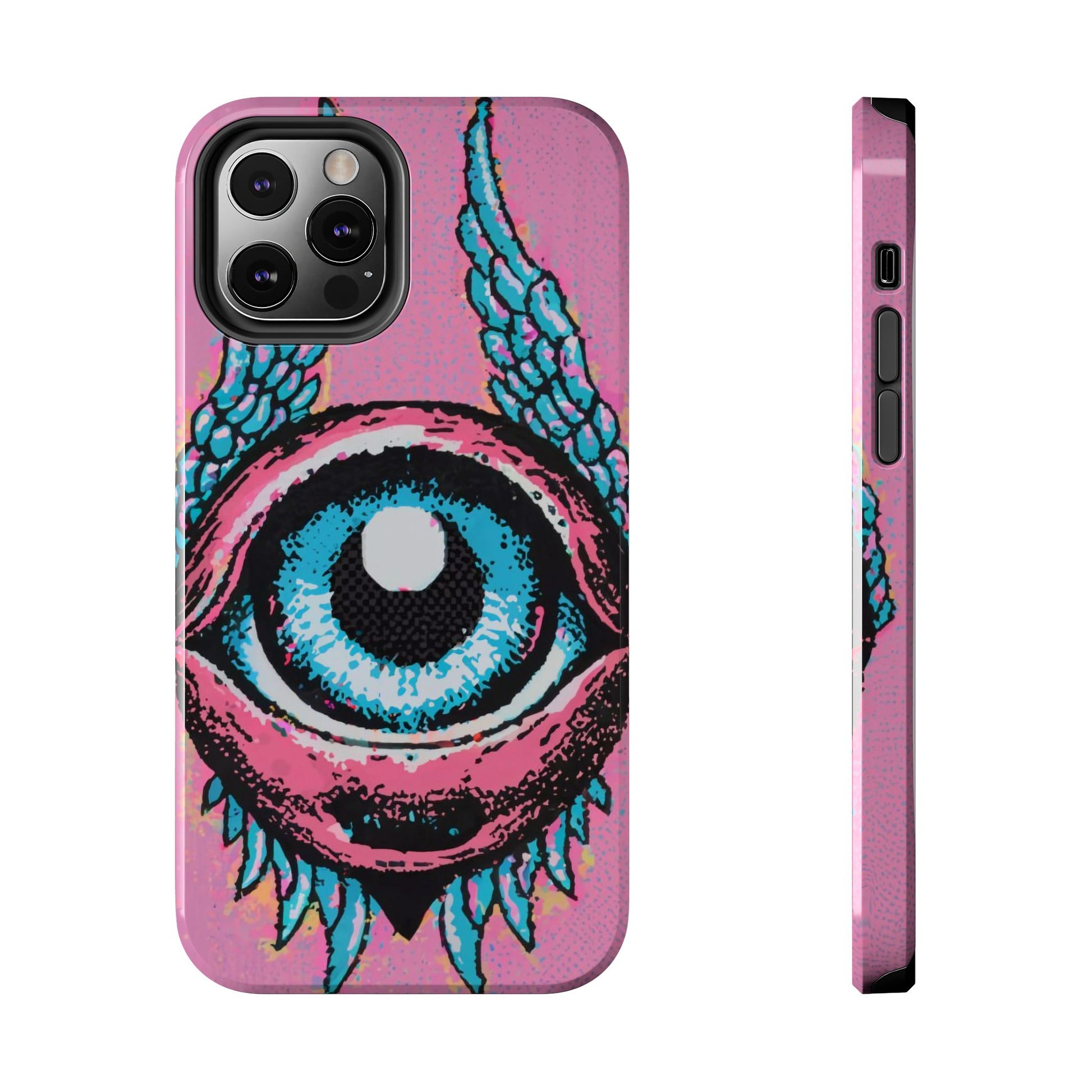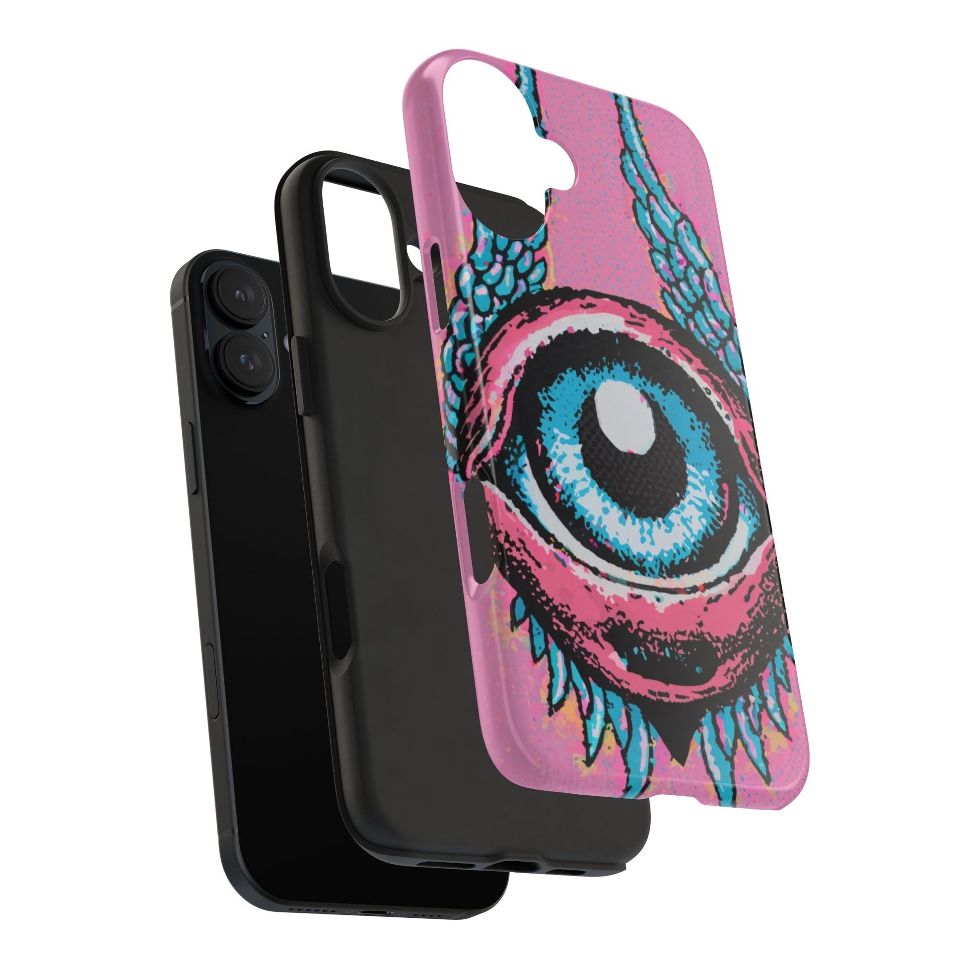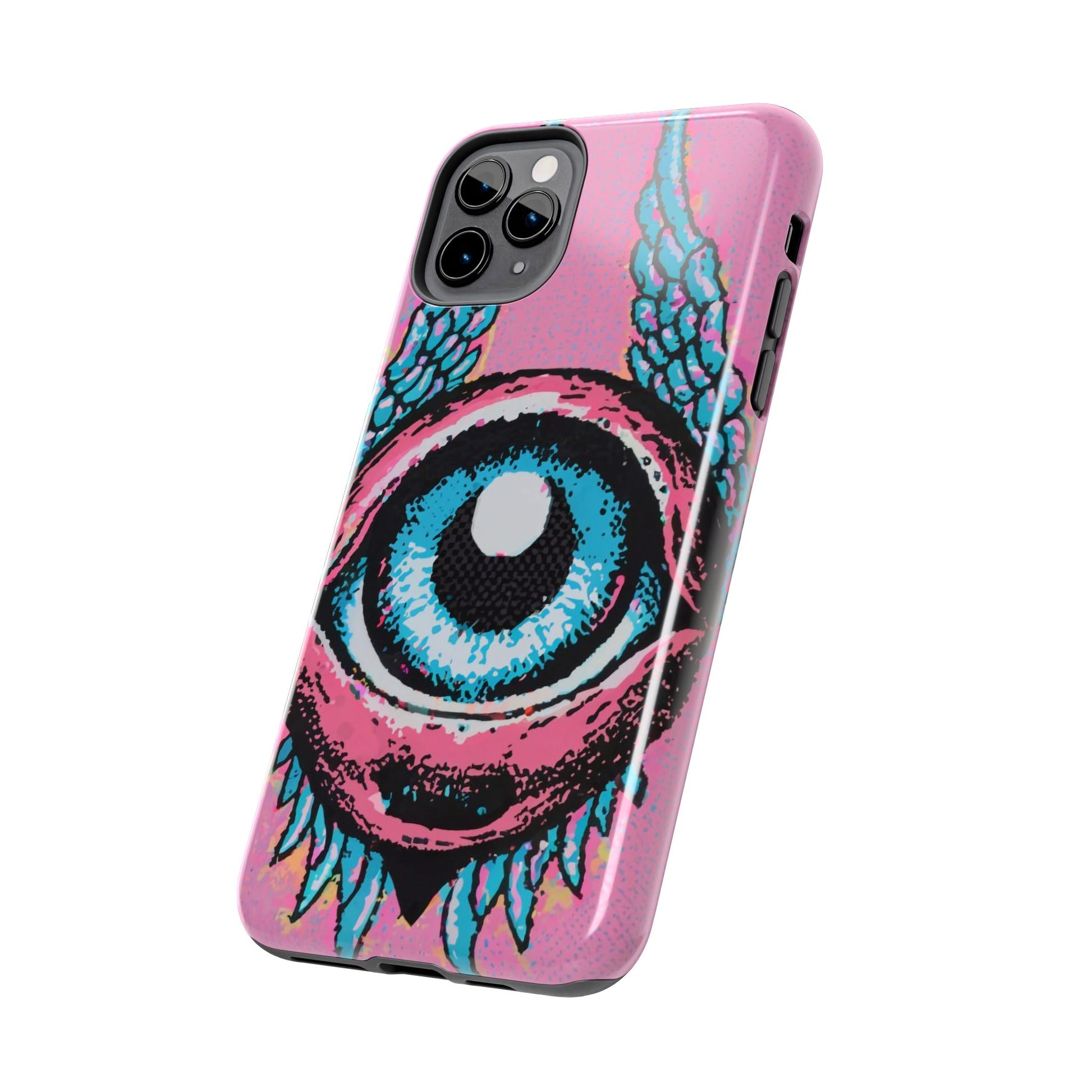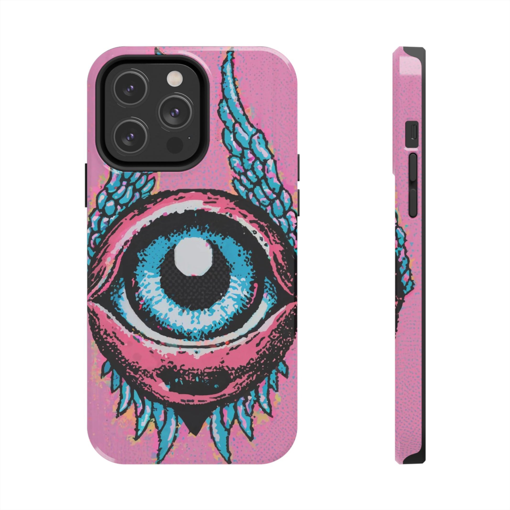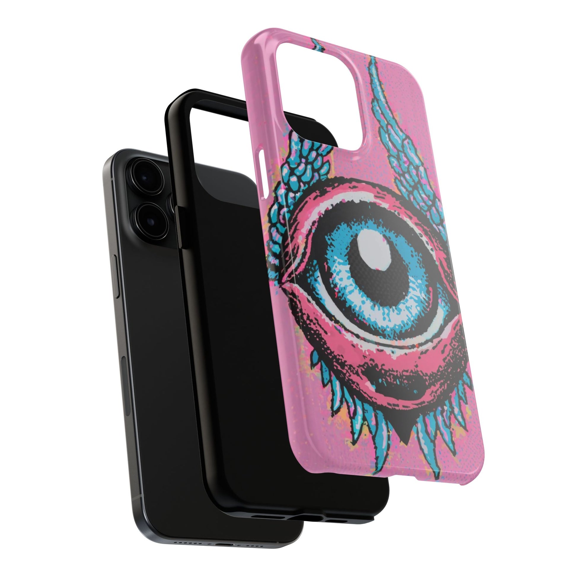 Add a touch of whimsical pop art to your iPhone with the "Halftone Horizon Eyeball iPhone Case." This striking design features a vibrant blue eyeball framed by soft pink eyelids, flanked by dynamic blue wings, all set against a bright pink background with bold halftone detailing.Unique Design: A captivating mix of retro pop art and surreal creativity.Unmatched Protection: Built tough to keep your iPhone safe from bumps, drops, and scratches.Effortless Usability: Precise cutouts and compatibility with wireless charging make it as functional as it is fashionable.Turn heads and protect your device in style with the "Halftone Horizon Eyeball iPhone Case."