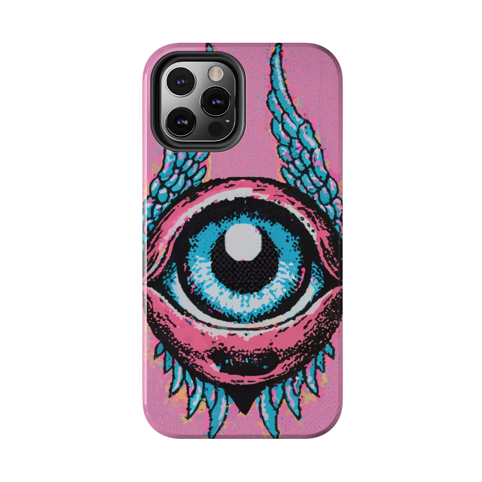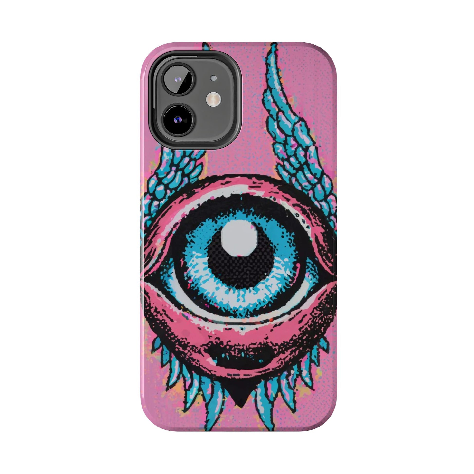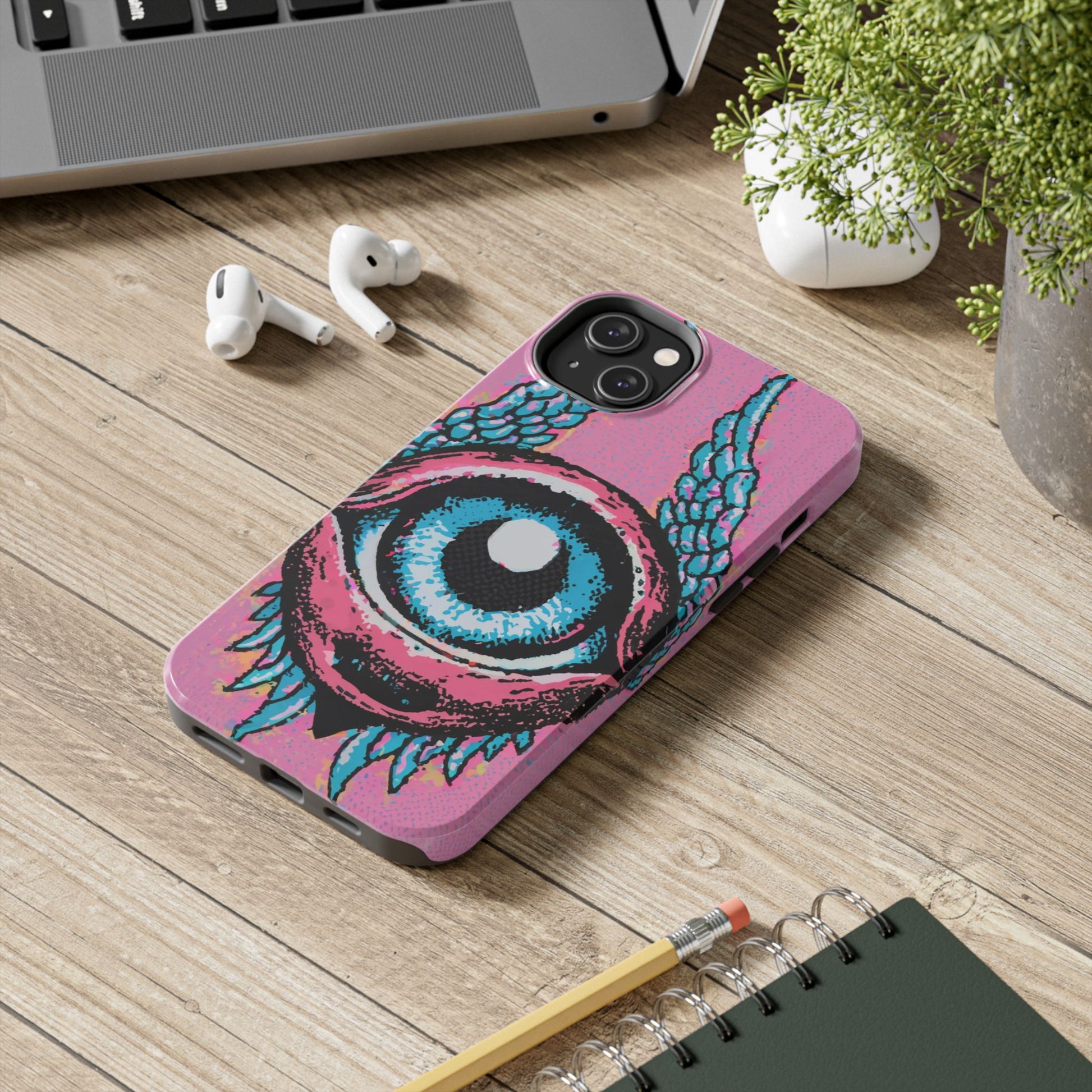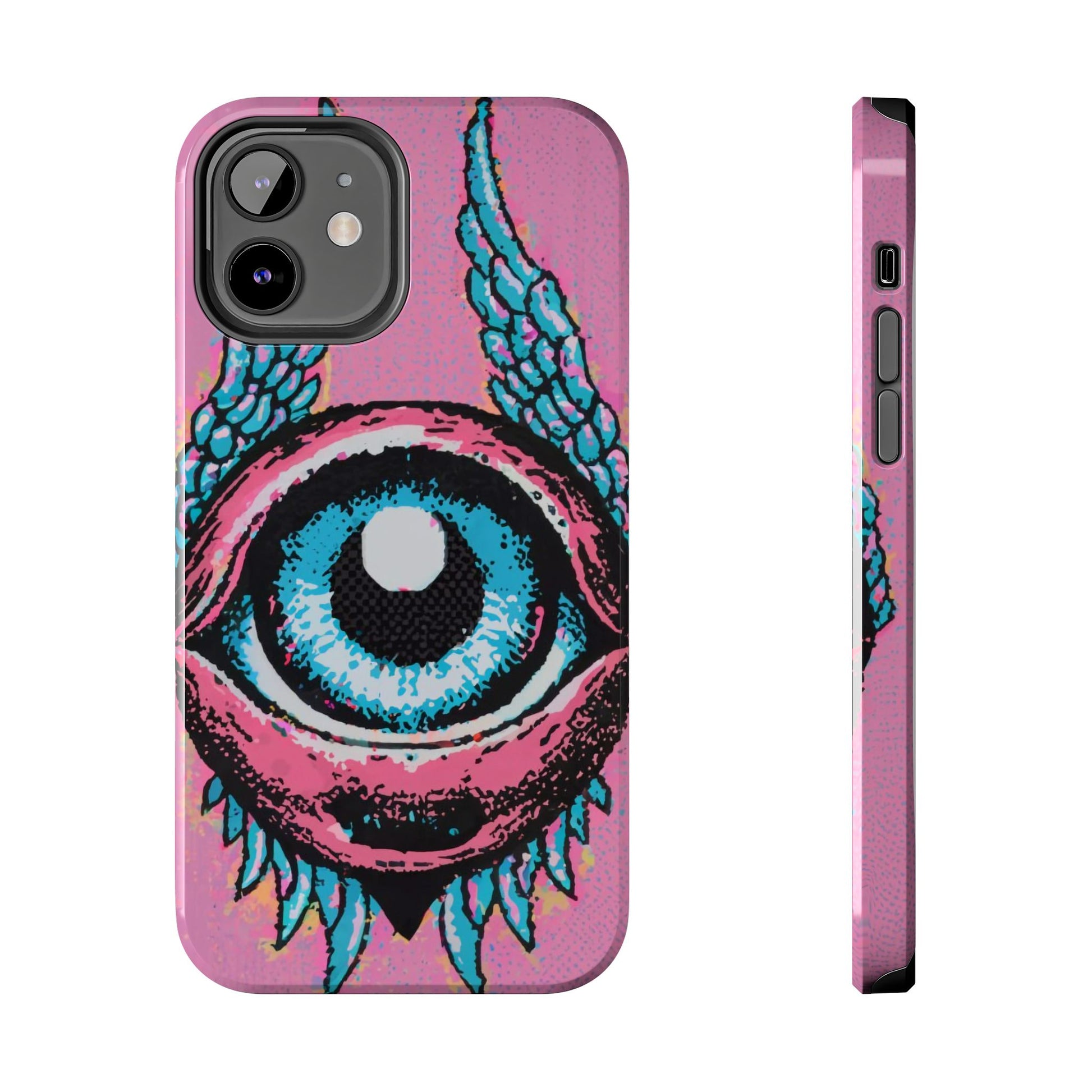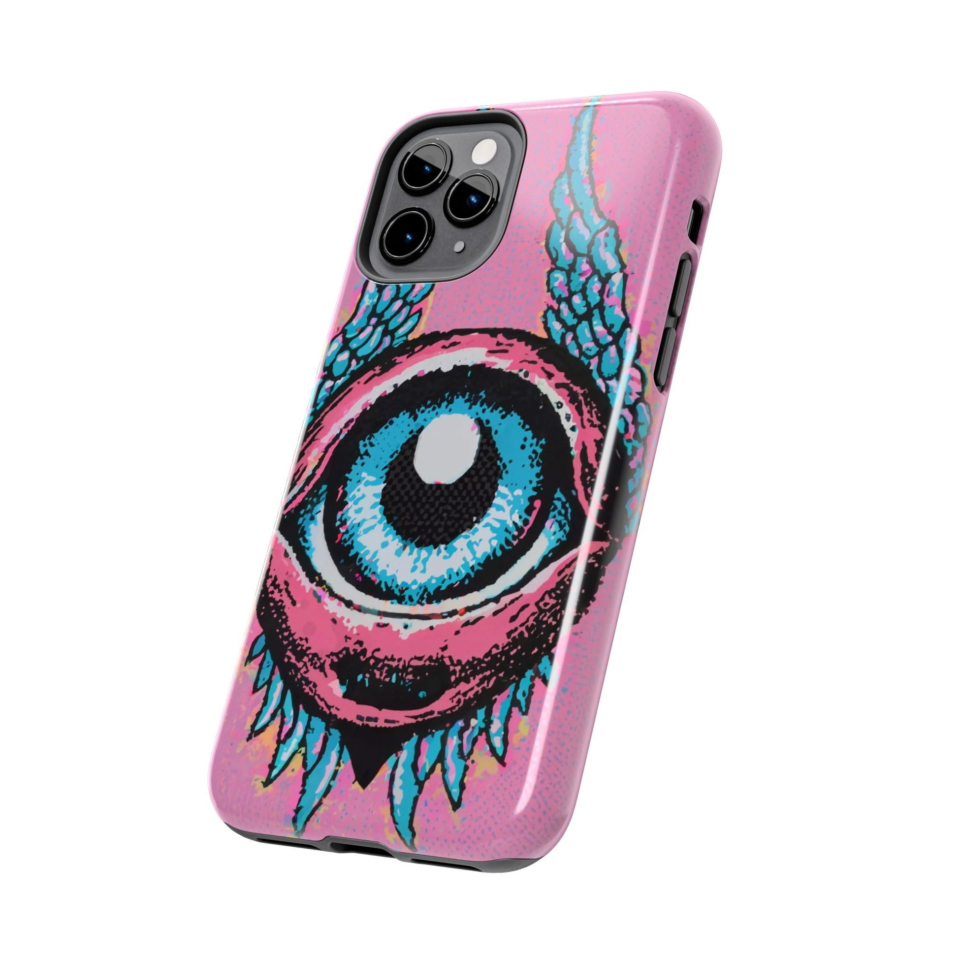 Add a touch of whimsical pop art to your iPhone with the "Halftone Horizon Eyeball iPhone Case." This striking design features a vibrant blue eyeball framed by soft pink eyelids, flanked by dynamic blue wings, all set against a bright pink background with bold halftone detailing.Unique Design: A captivating mix of retro pop art and surreal creativity.Unmatched Protection: Built tough to keep your iPhone safe from bumps, drops, and scratches.Effortless Usability: Precise cutouts and compatibility with wireless charging make it as functional as it is fashionable.Turn heads and protect your device in style with the "Halftone Horizon Eyeball iPhone Case."