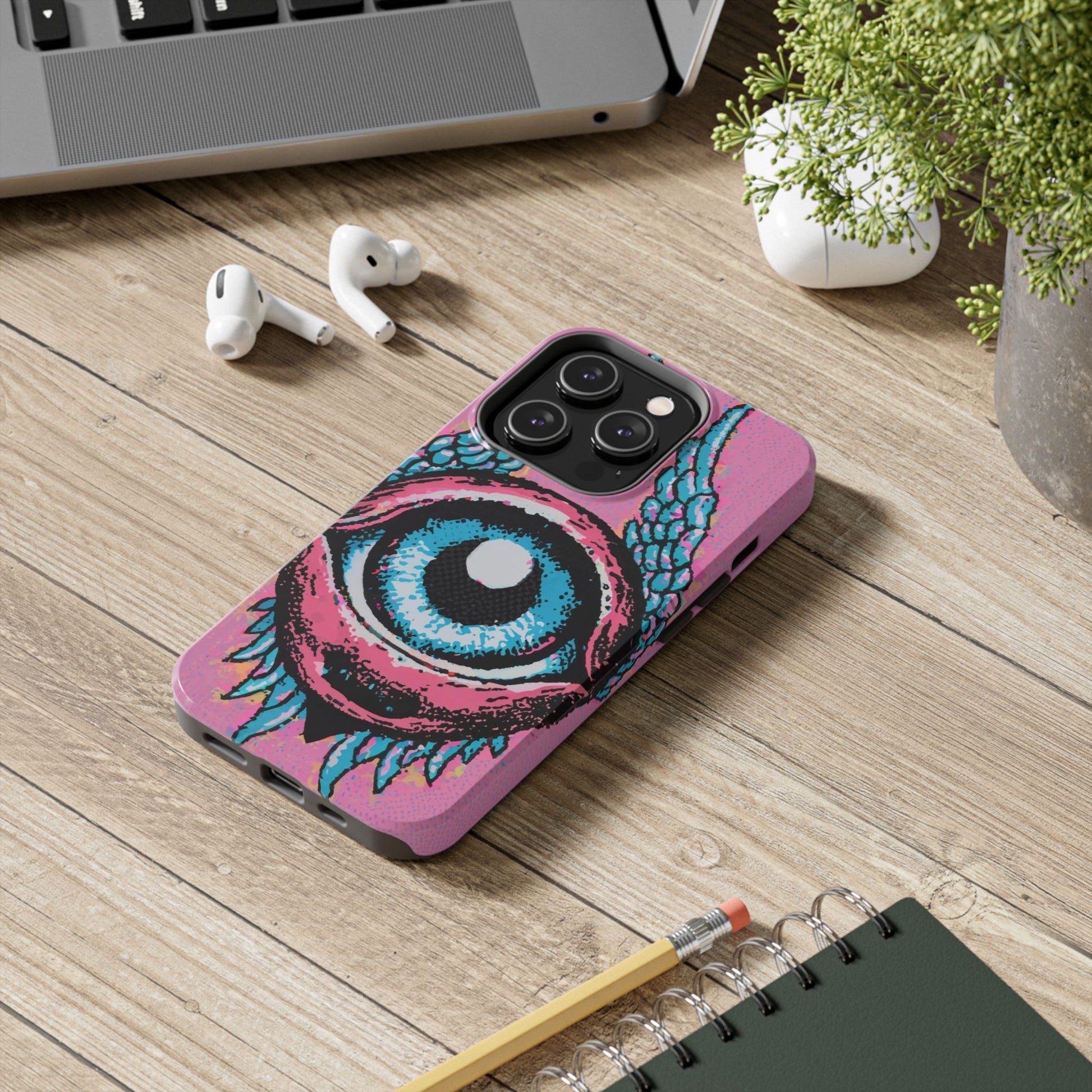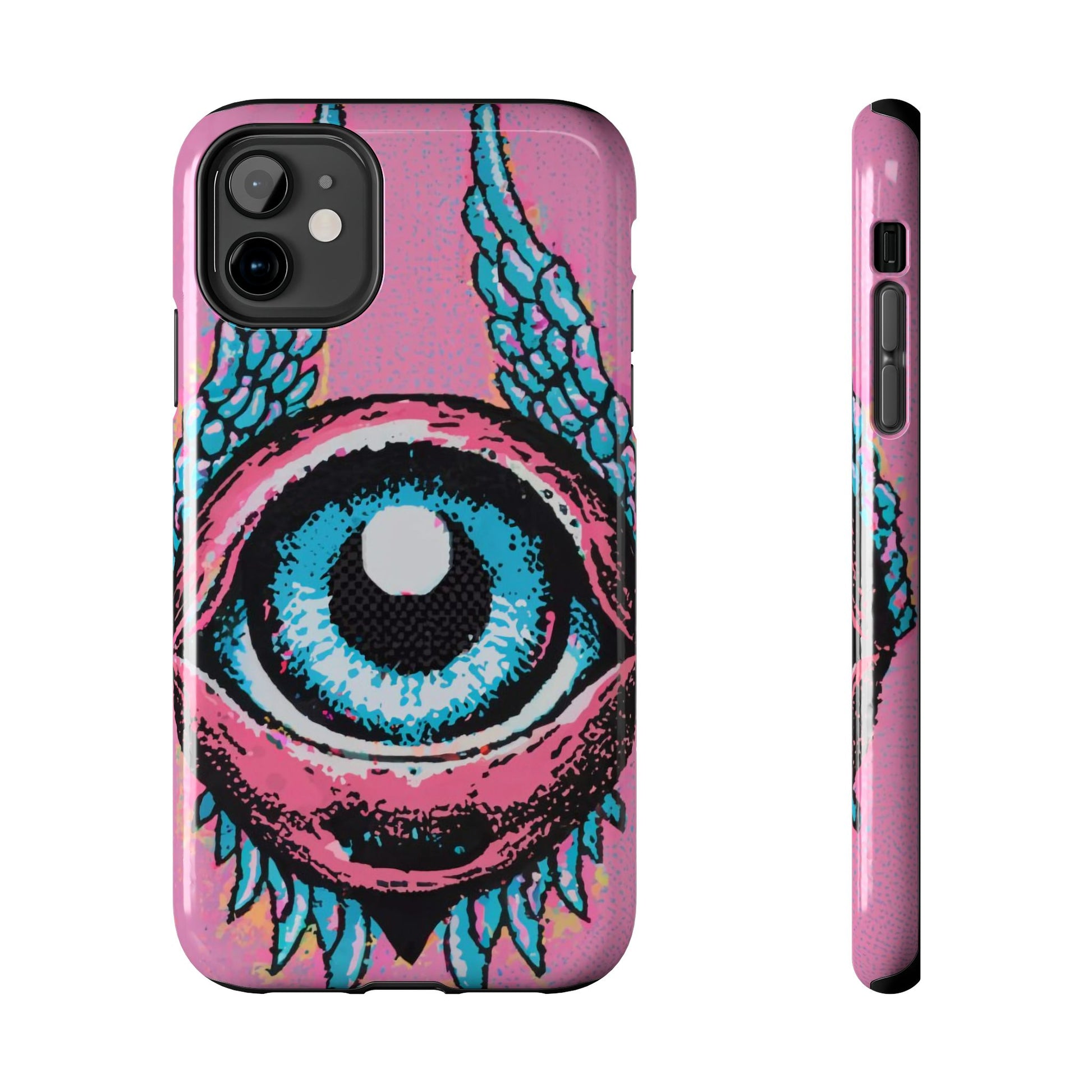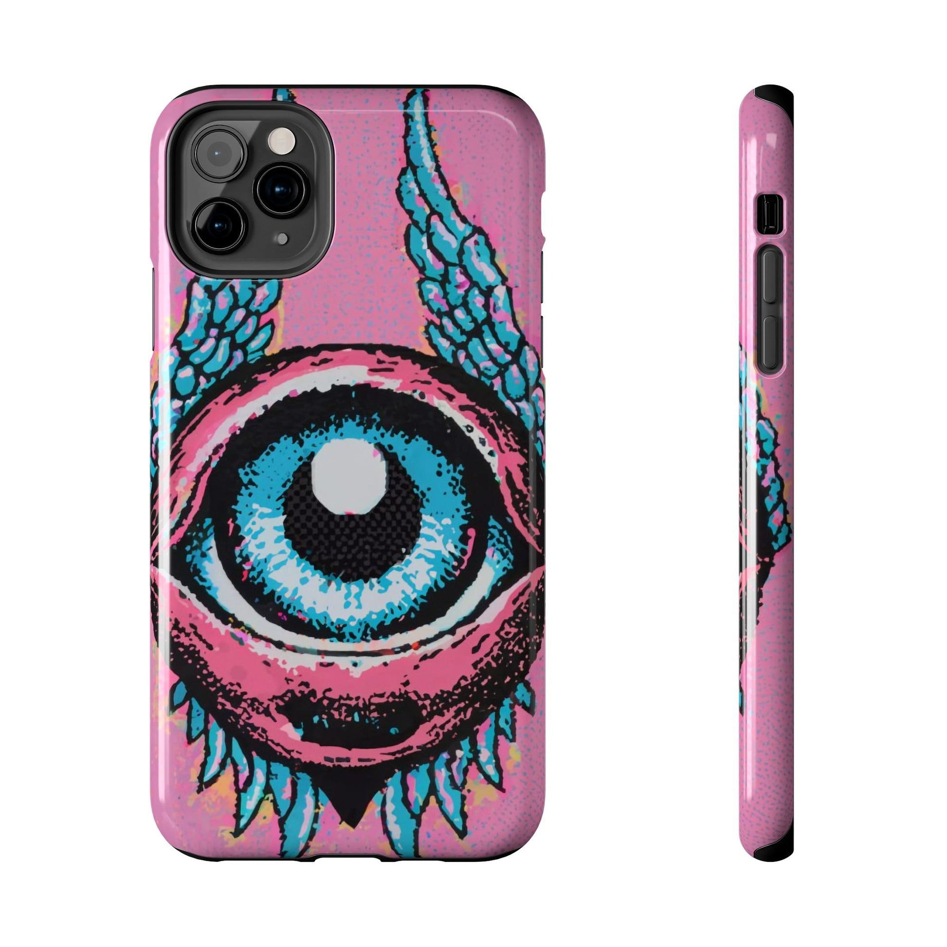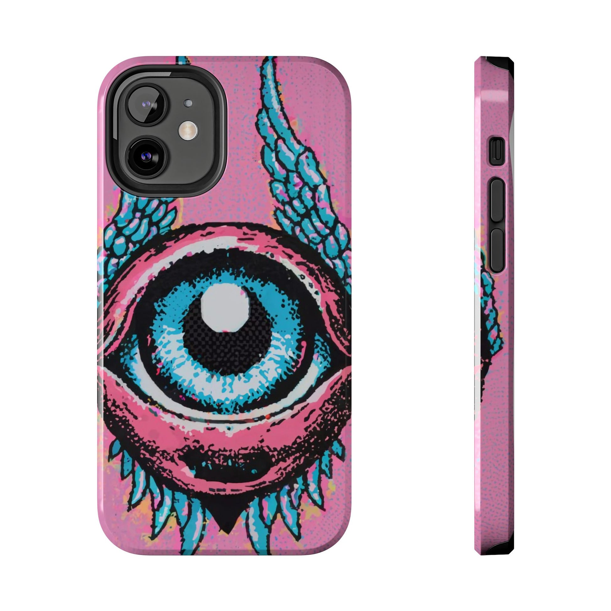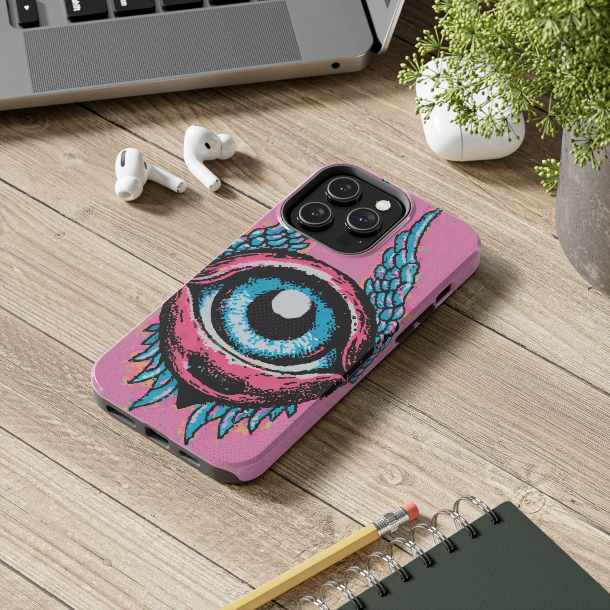 Add a touch of whimsical pop art to your iPhone with the "Halftone Horizon Eyeball iPhone Case." This striking design features a vibrant blue eyeball framed by soft pink eyelids, flanked by dynamic blue wings, all set against a bright pink background with bold halftone detailing.Unique Design: A captivating mix of retro pop art and surreal creativity.Unmatched Protection: Built tough to keep your iPhone safe from bumps, drops, and scratches.Effortless Usability: Precise cutouts and compatibility with wireless charging make it as functional as it is fashionable.Turn heads and protect your device in style with the "Halftone Horizon Eyeball iPhone Case."