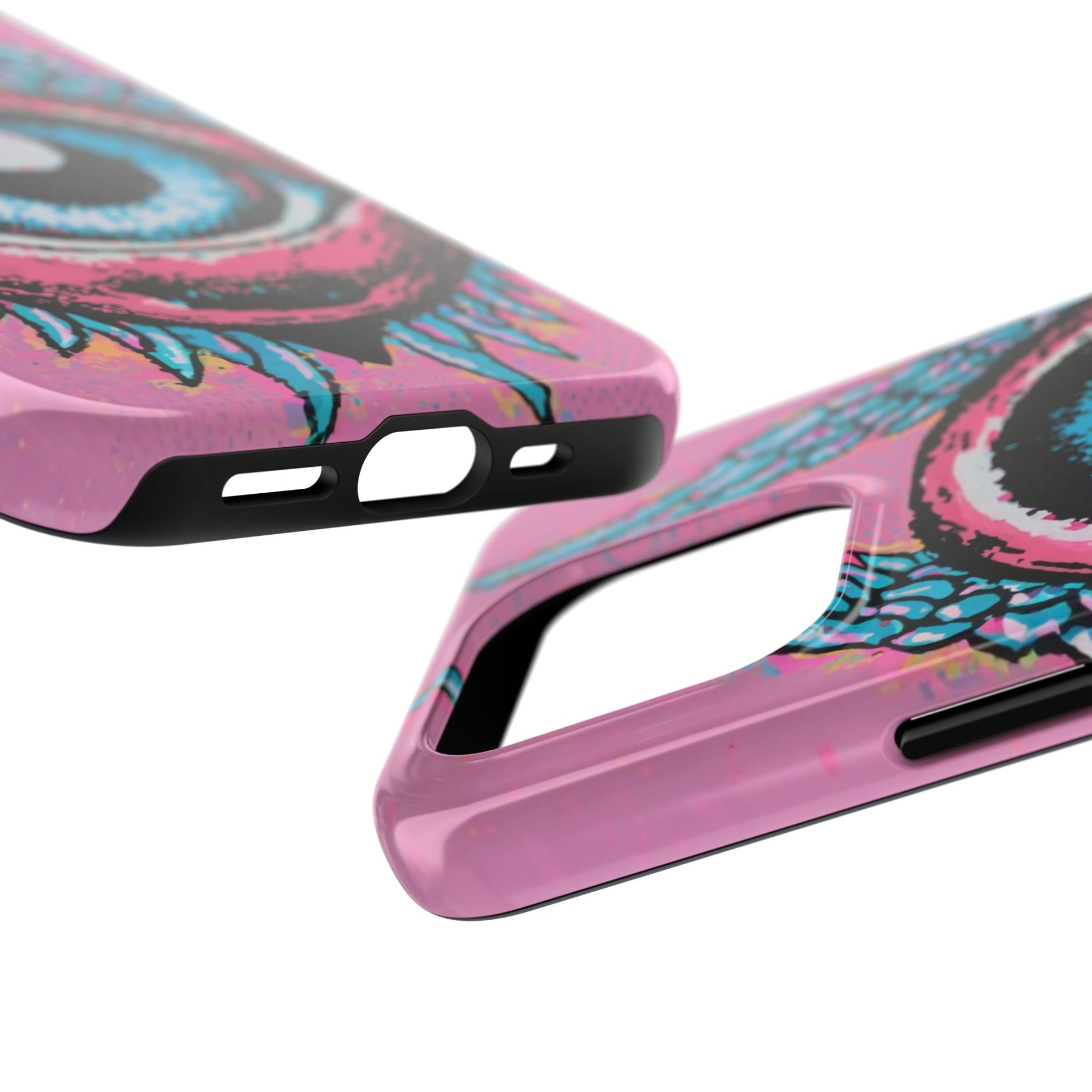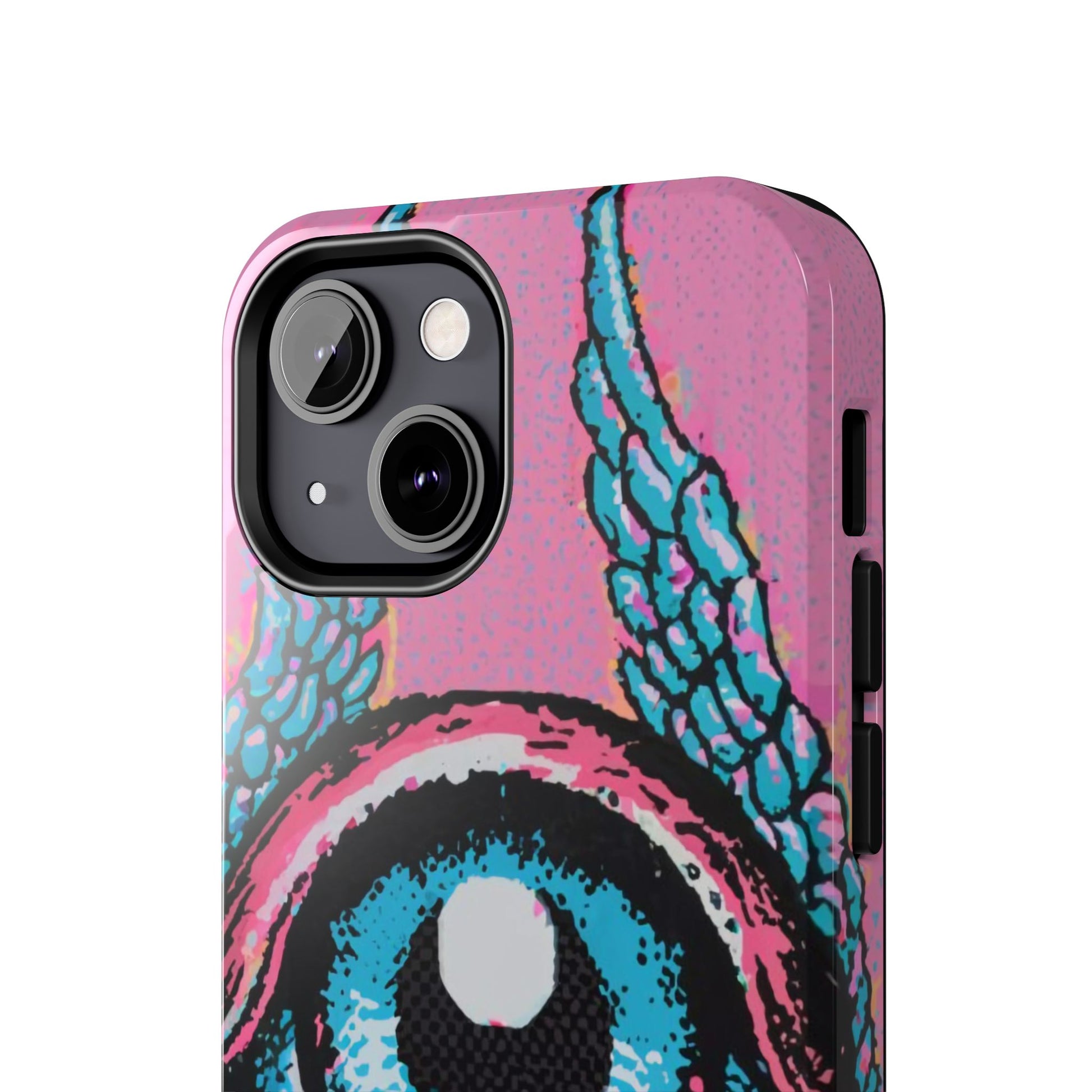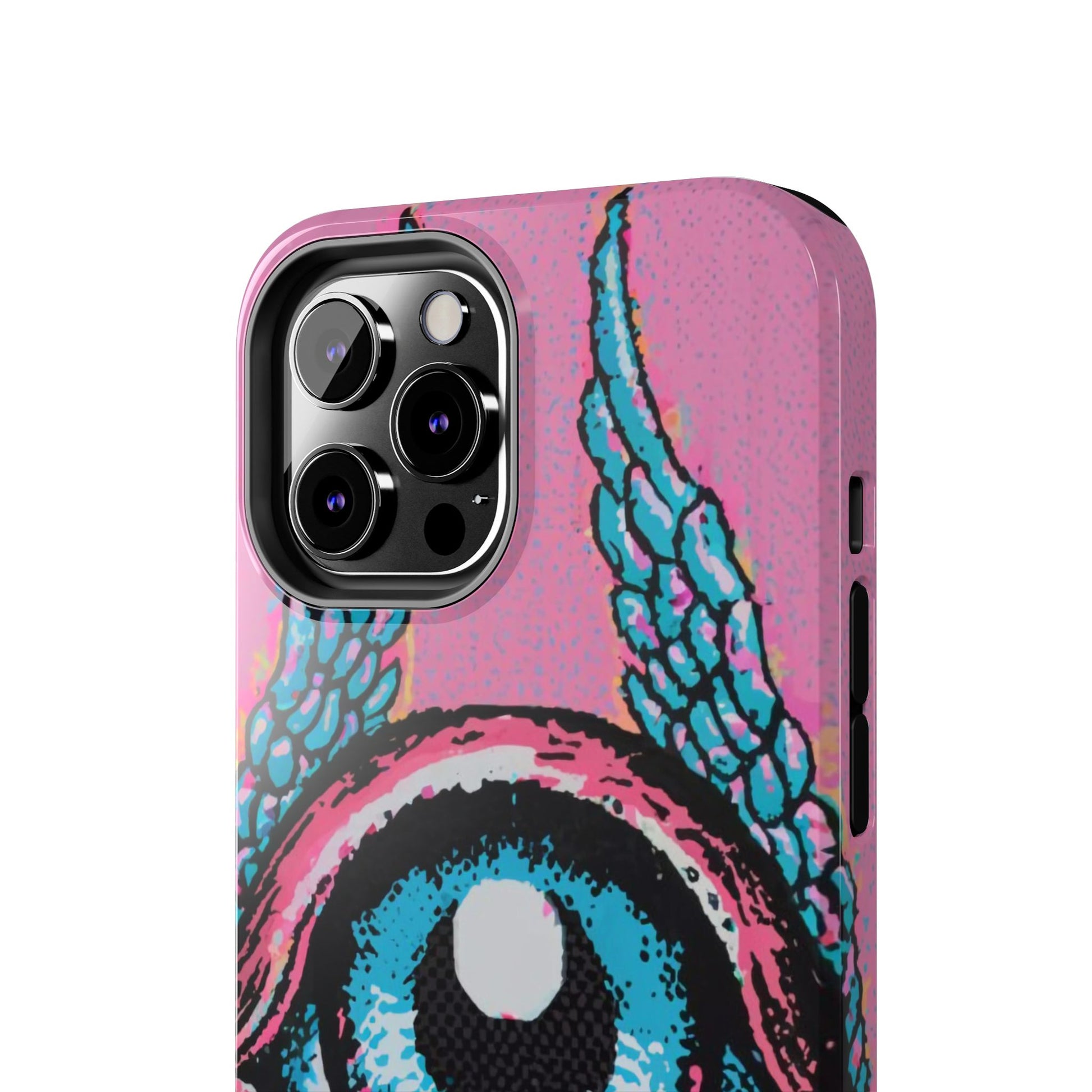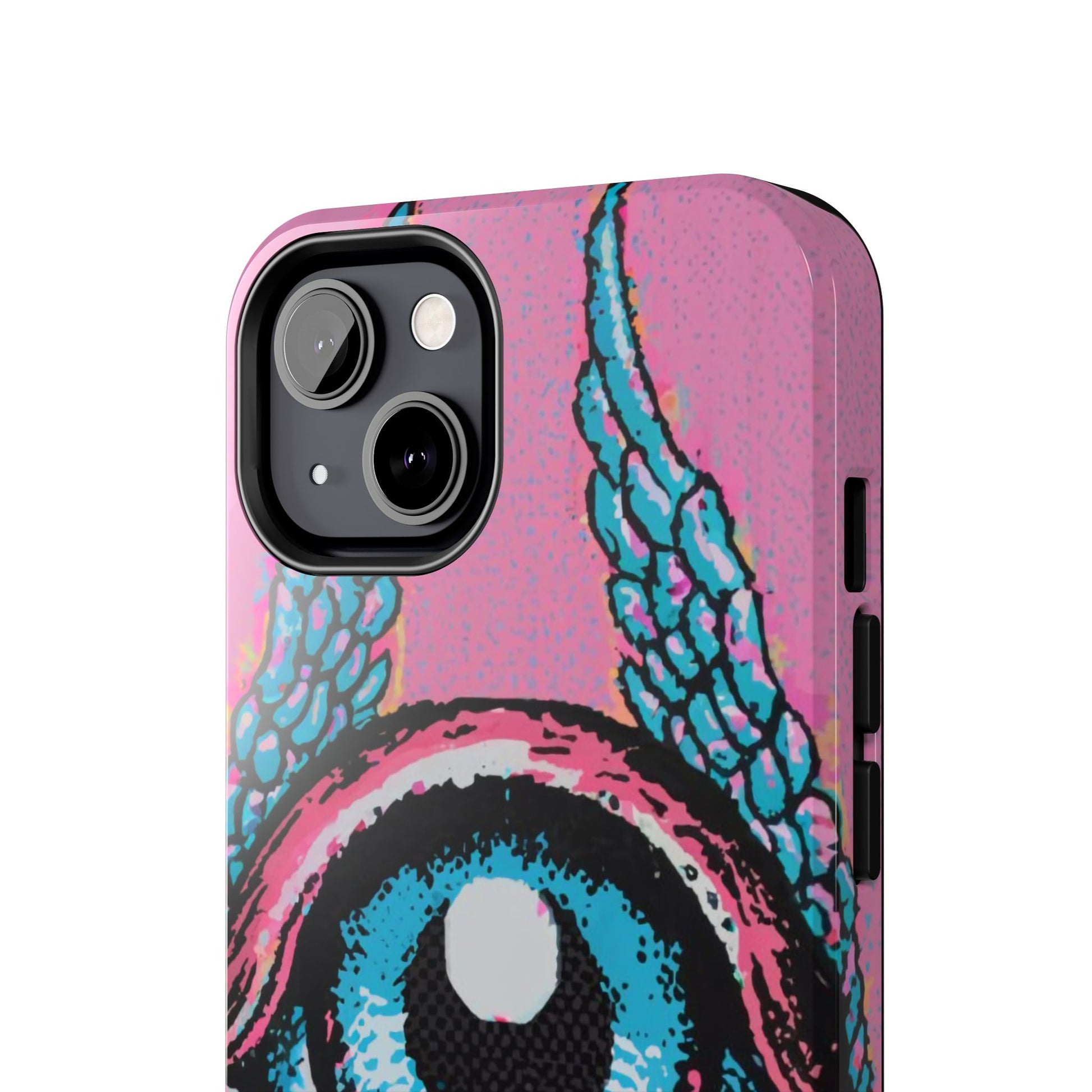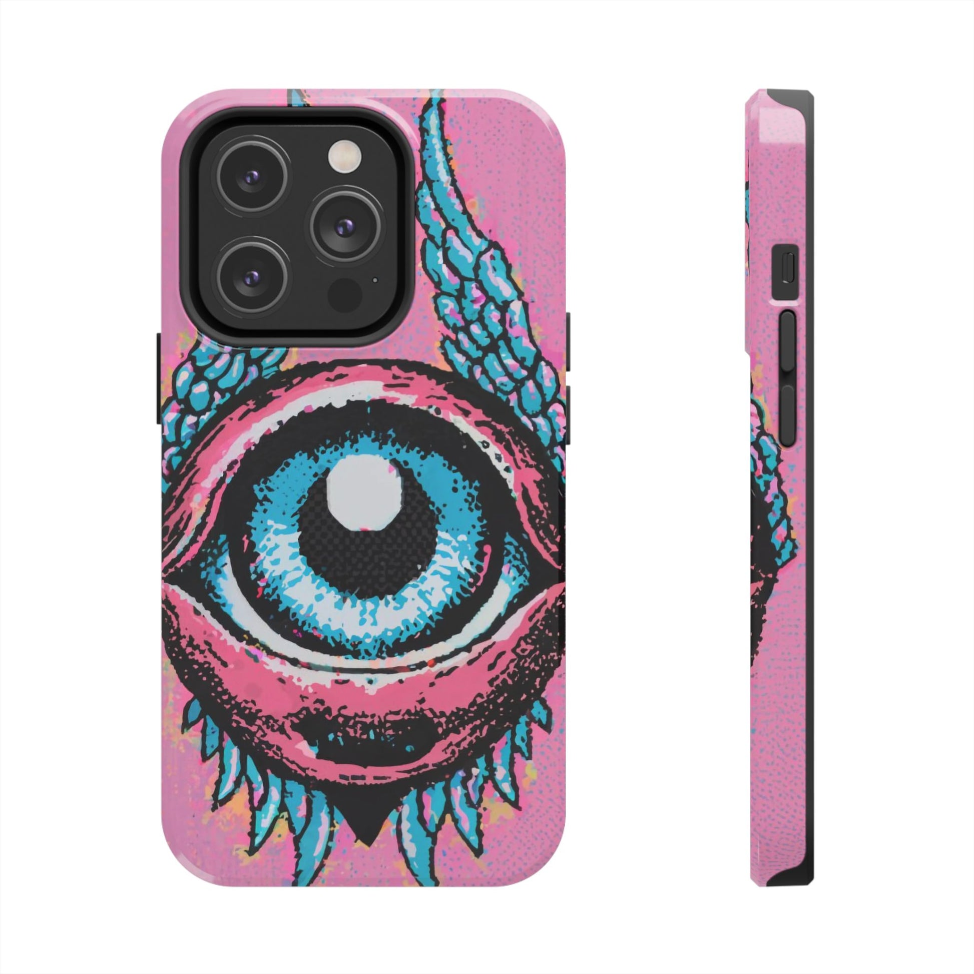 Add a touch of whimsical pop art to your iPhone with the "Halftone Horizon Eyeball iPhone Case." This striking design features a vibrant blue eyeball framed by soft pink eyelids, flanked by dynamic blue wings, all set against a bright pink background with bold halftone detailing.Unique Design: A captivating mix of retro pop art and surreal creativity.Unmatched Protection: Built tough to keep your iPhone safe from bumps, drops, and scratches.Effortless Usability: Precise cutouts and compatibility with wireless charging make it as functional as it is fashionable.Turn heads and protect your device in style with the "Halftone Horizon Eyeball iPhone Case."