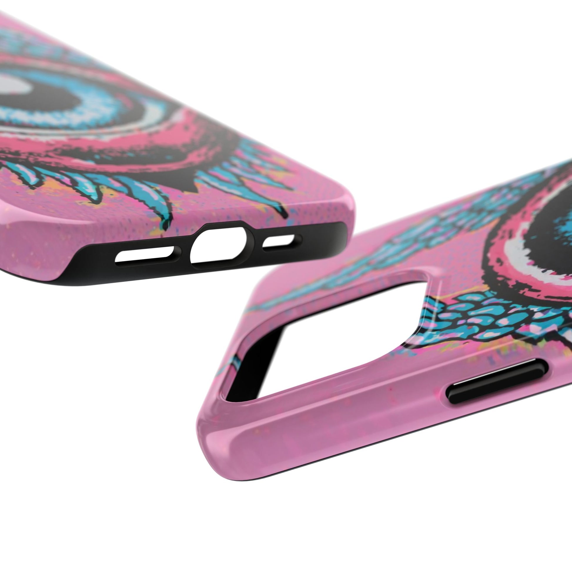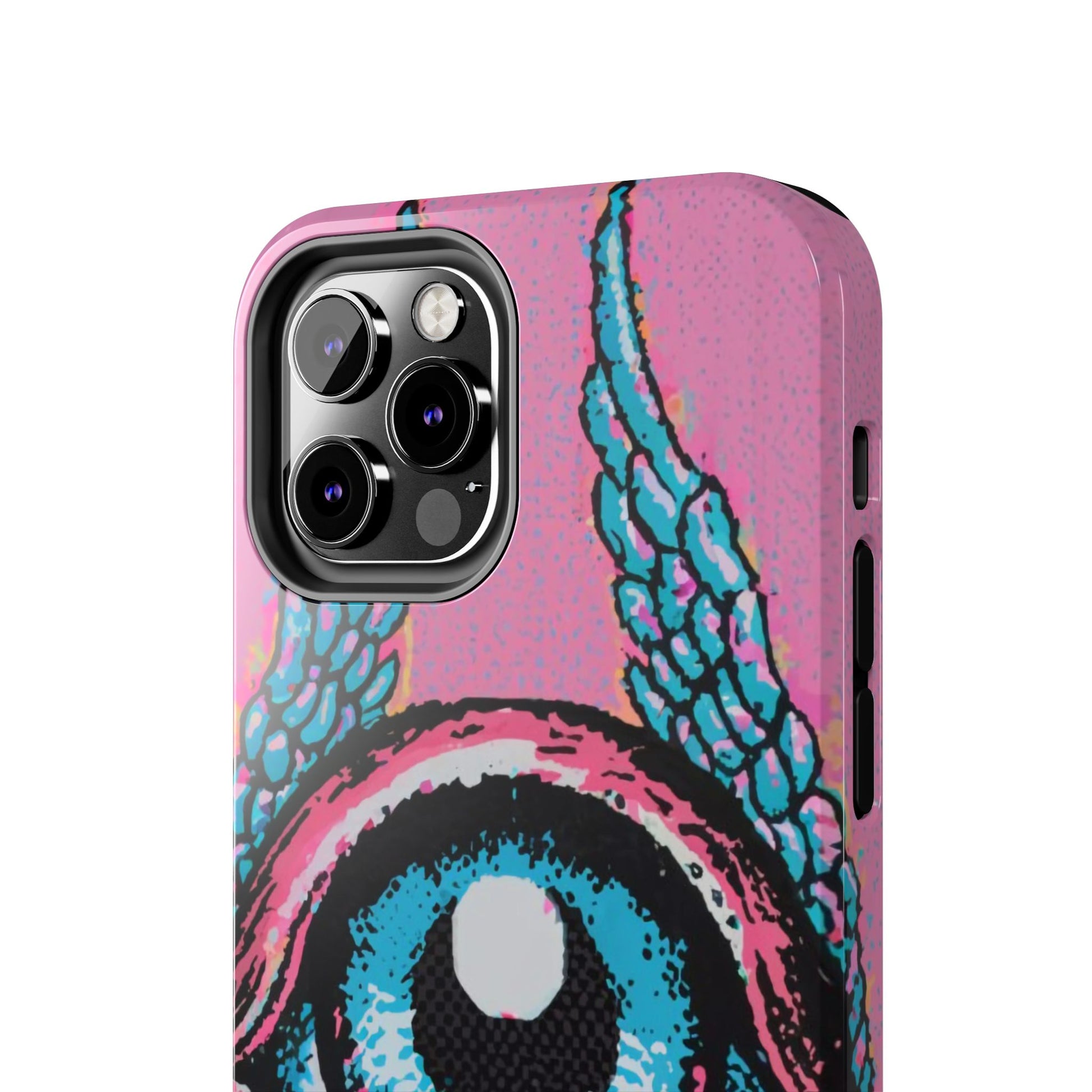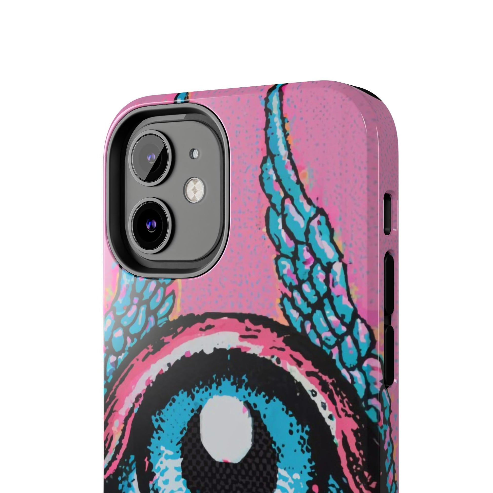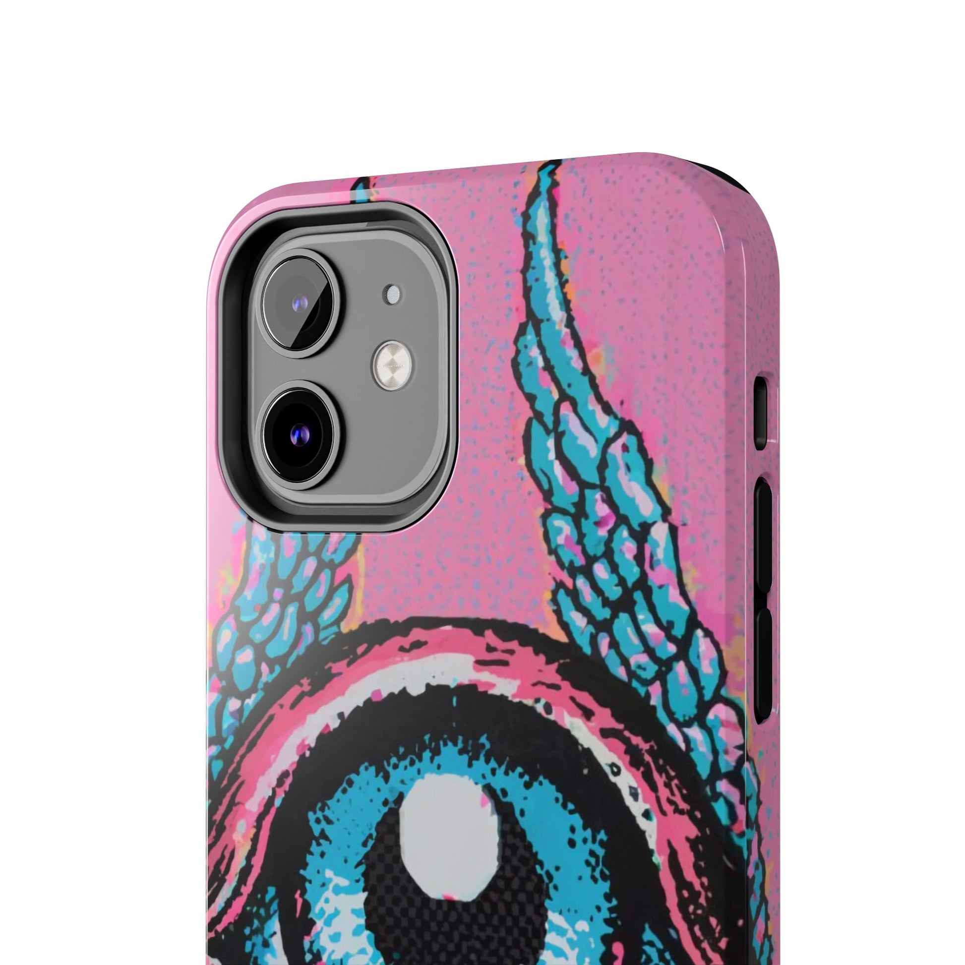 Add a touch of whimsical pop art to your iPhone with the "Halftone Horizon Eyeball iPhone Case." This striking design features a vibrant blue eyeball framed by soft pink eyelids, flanked by dynamic blue wings, all set against a bright pink background with bold halftone detailing.Unique Design: A captivating mix of retro pop art and surreal creativity.Unmatched Protection: Built tough to keep your iPhone safe from bumps, drops, and scratches.Effortless Usability: Precise cutouts and compatibility with wireless charging make it as functional as it is fashionable.Turn heads and protect your device in style with the "Halftone Horizon Eyeball iPhone Case."