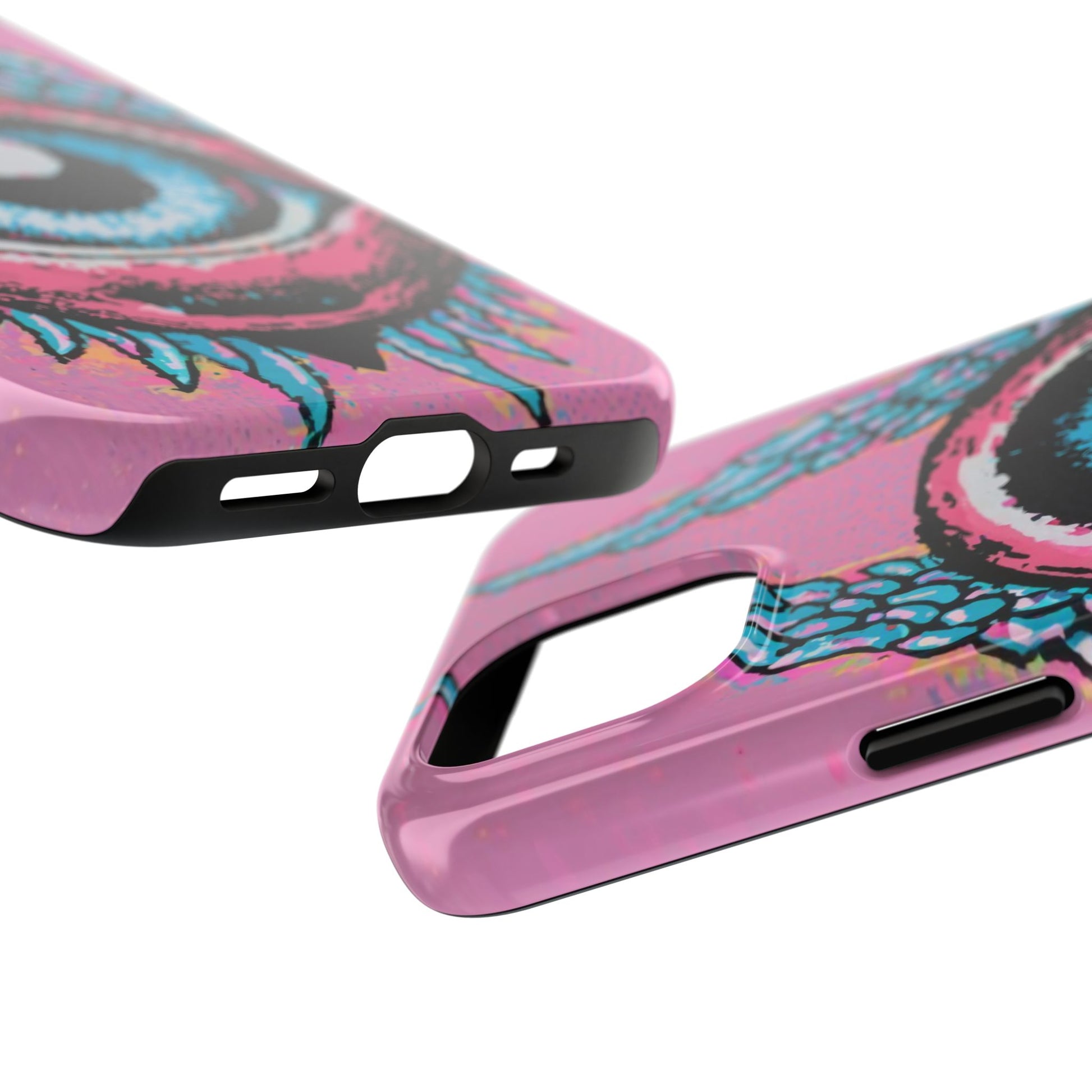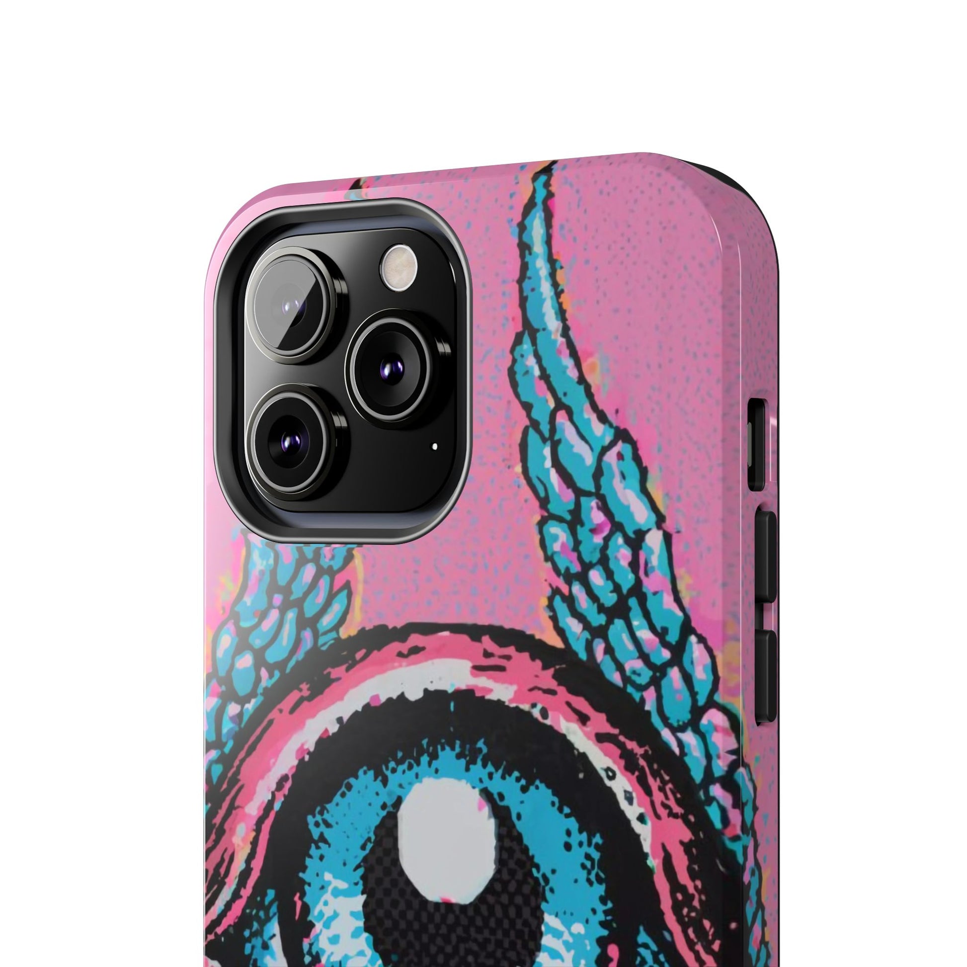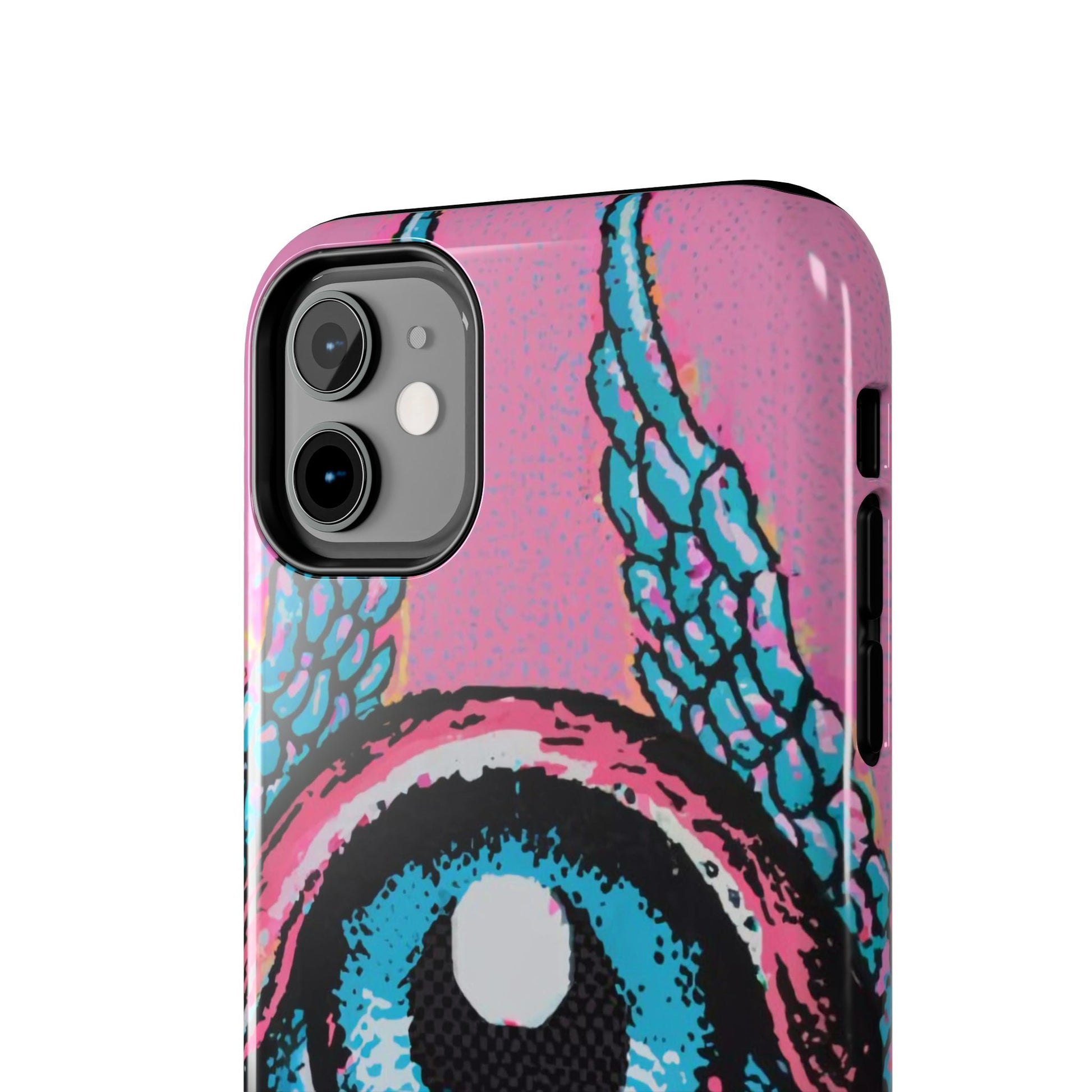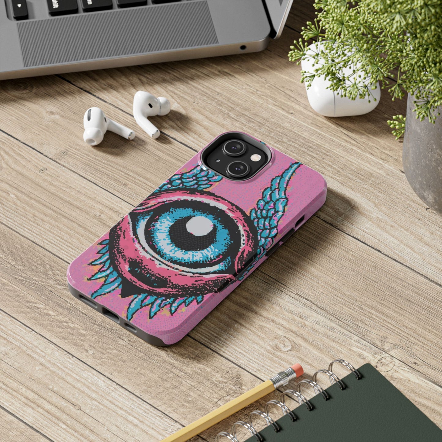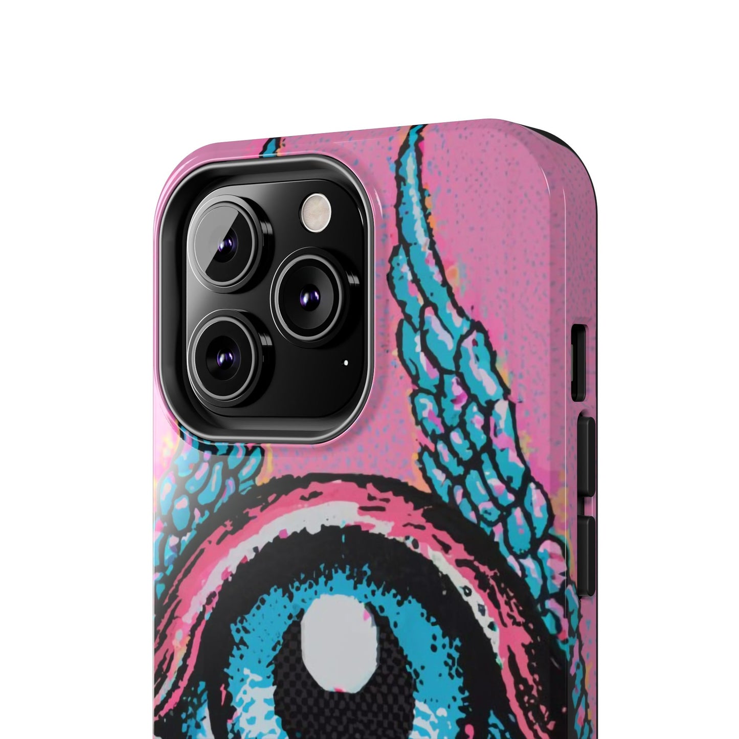 Add a touch of whimsical pop art to your iPhone with the "Halftone Horizon Eyeball iPhone Case." This striking design features a vibrant blue eyeball framed by soft pink eyelids, flanked by dynamic blue wings, all set against a bright pink background with bold halftone detailing.Unique Design: A captivating mix of retro pop art and surreal creativity.Unmatched Protection: Built tough to keep your iPhone safe from bumps, drops, and scratches.Effortless Usability: Precise cutouts and compatibility with wireless charging make it as functional as it is fashionable.Turn heads and protect your device in style with the "Halftone Horizon Eyeball iPhone Case."