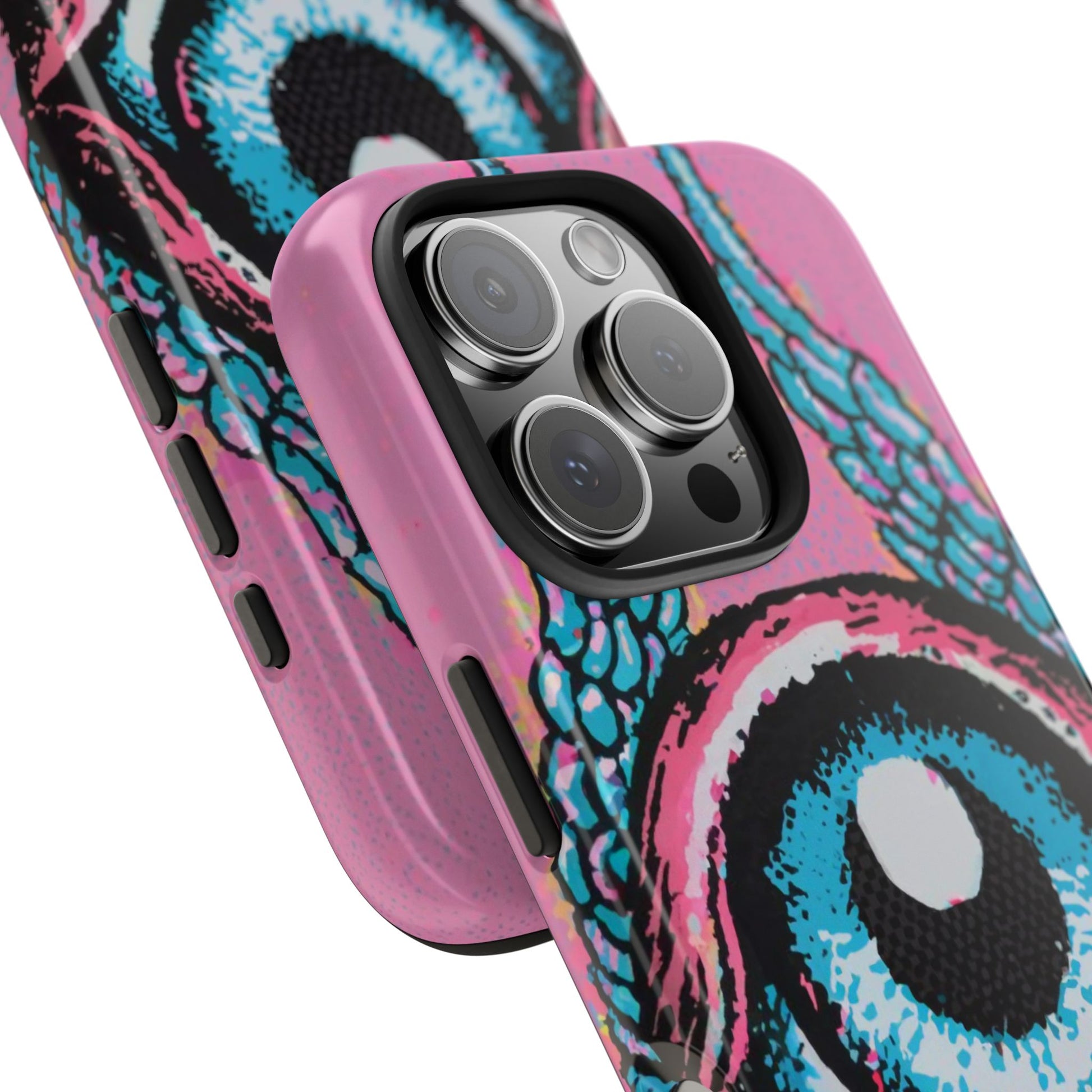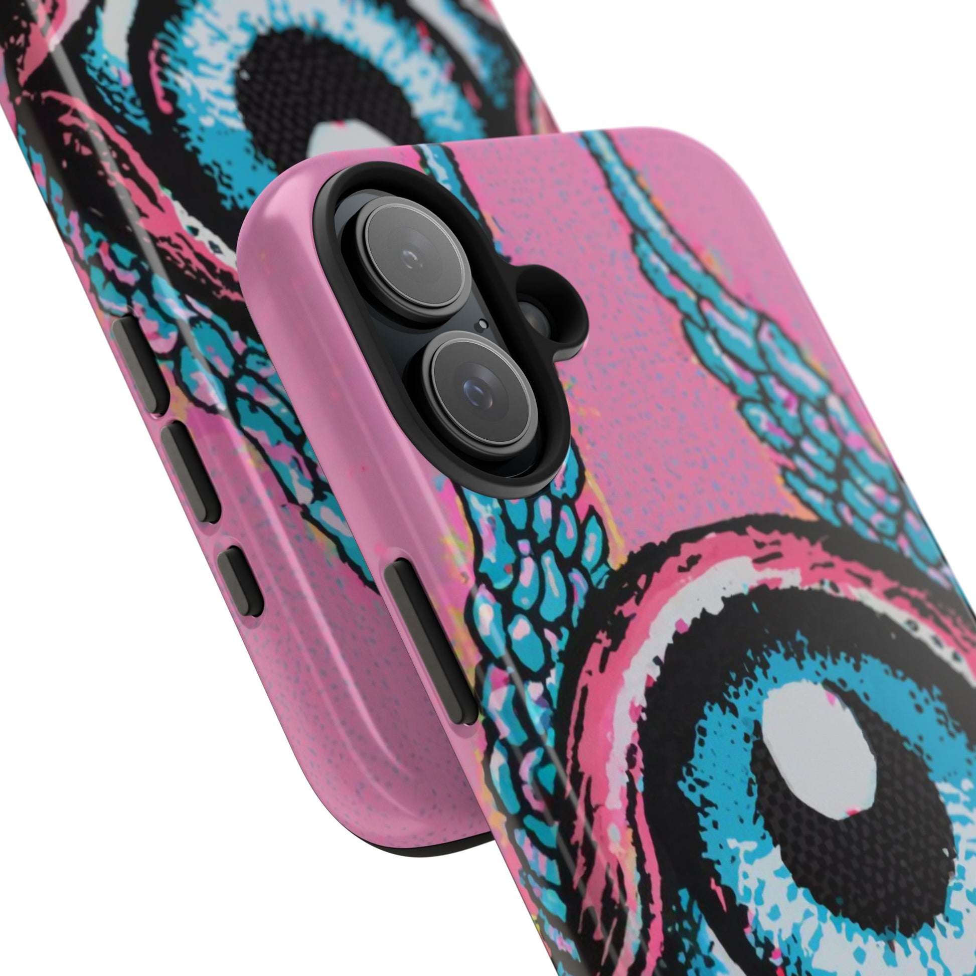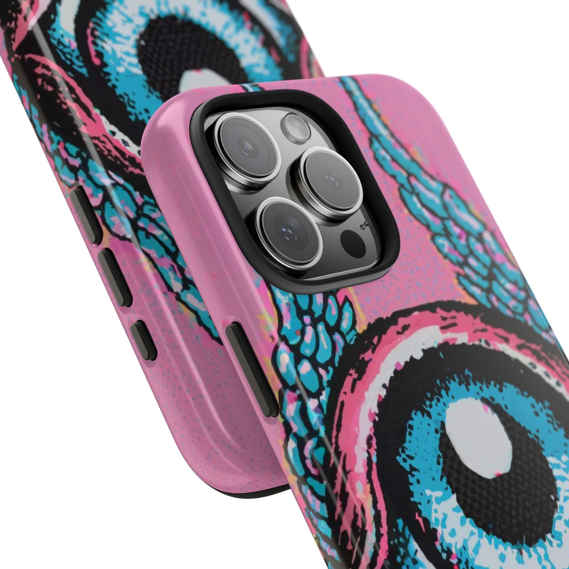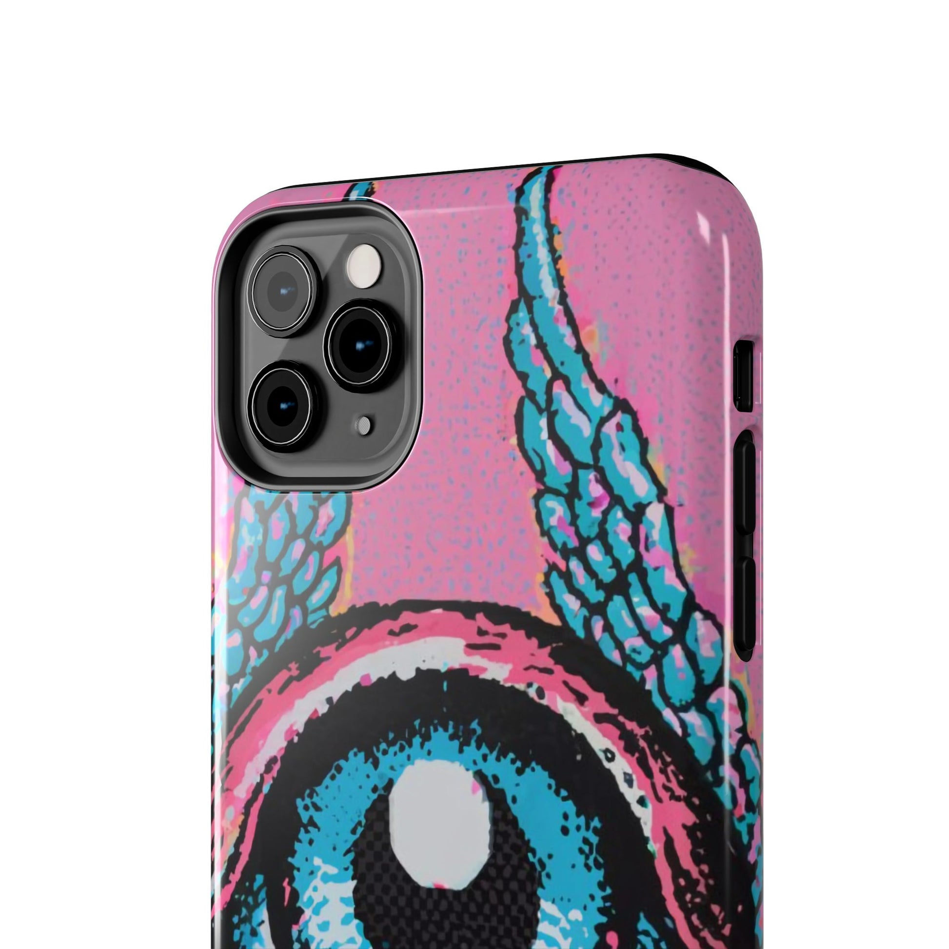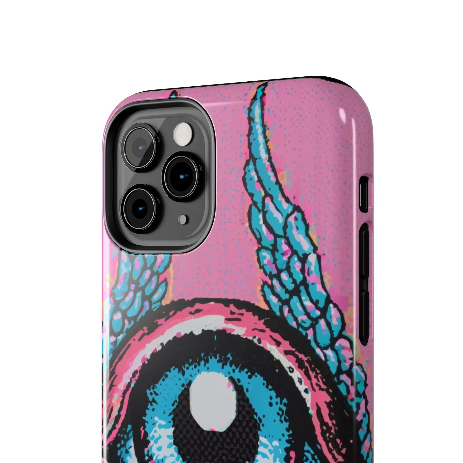 Add a touch of whimsical pop art to your iPhone with the "Halftone Horizon Eyeball iPhone Case." This striking design features a vibrant blue eyeball framed by soft pink eyelids, flanked by dynamic blue wings, all set against a bright pink background with bold halftone detailing.Unique Design: A captivating mix of retro pop art and surreal creativity.Unmatched Protection: Built tough to keep your iPhone safe from bumps, drops, and scratches.Effortless Usability: Precise cutouts and compatibility with wireless charging make it as functional as it is fashionable.Turn heads and protect your device in style with the "Halftone Horizon Eyeball iPhone Case."