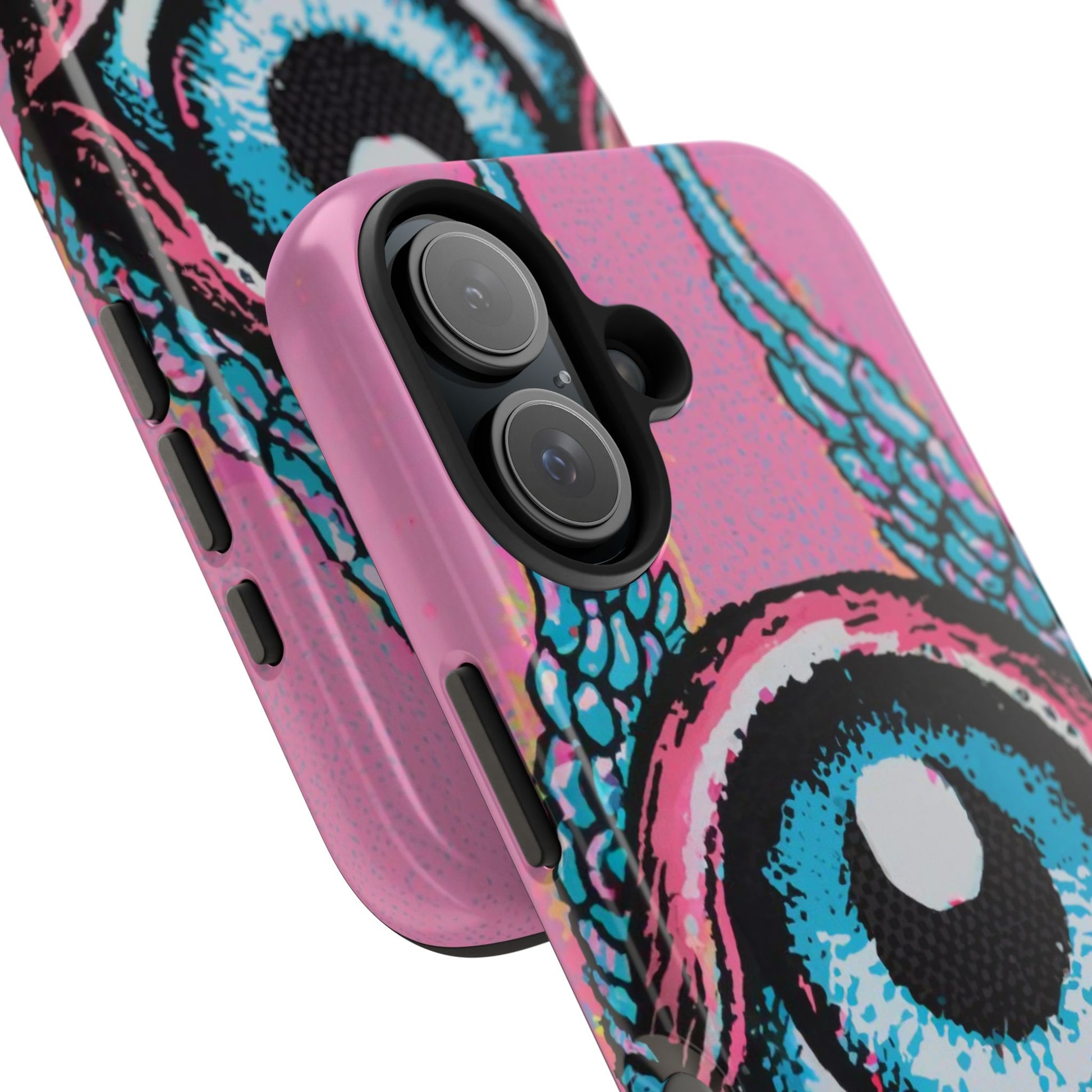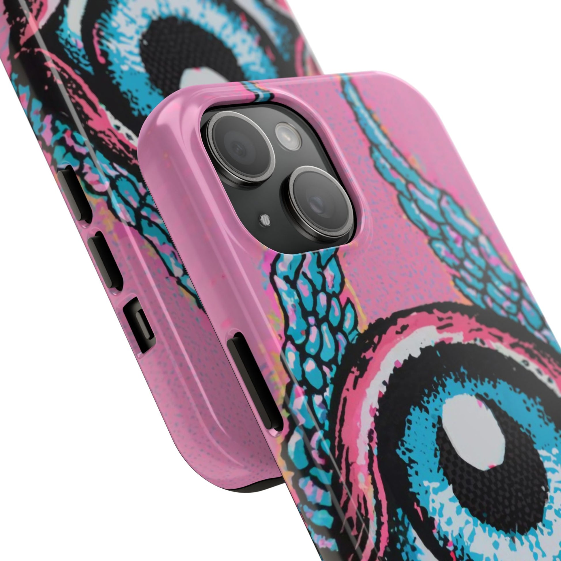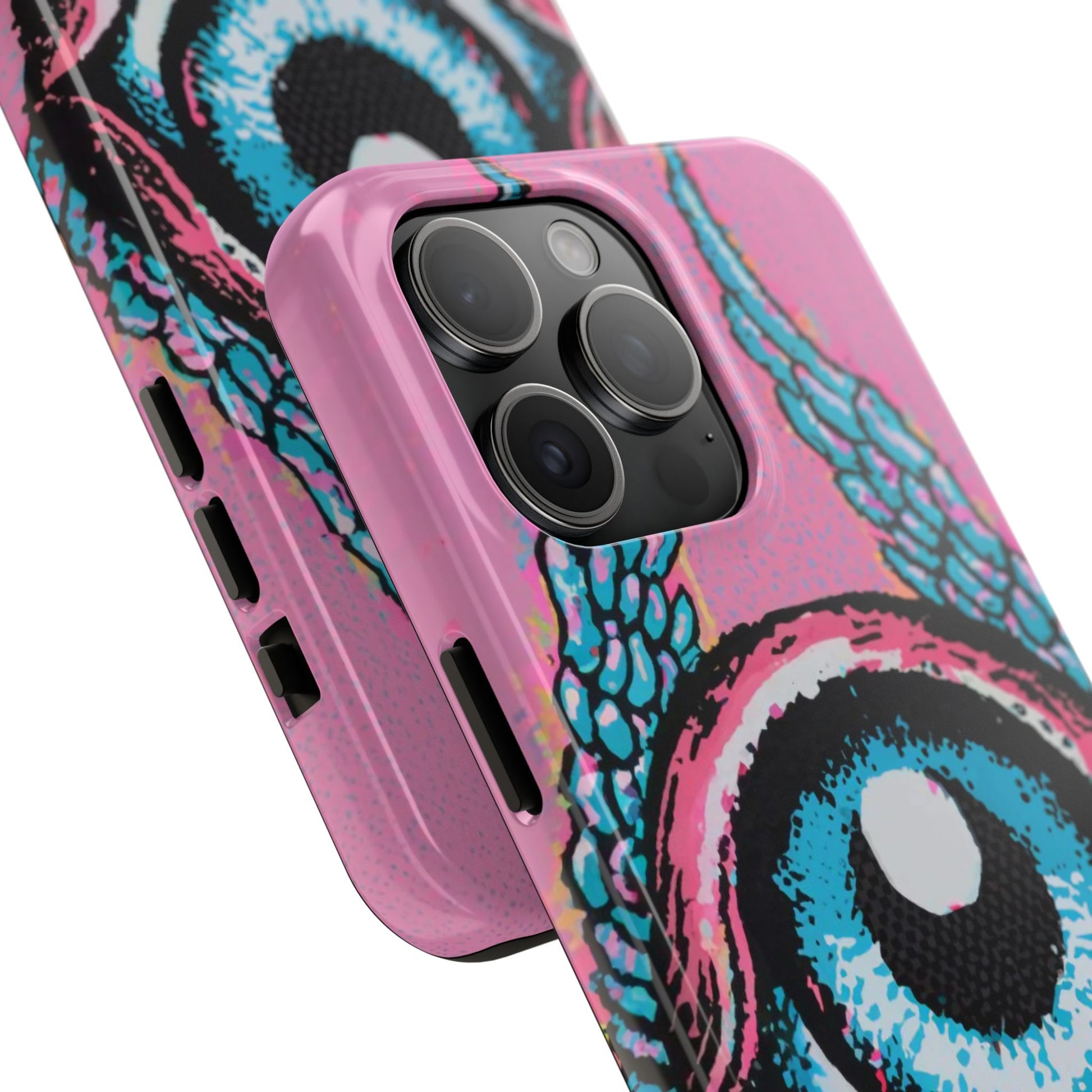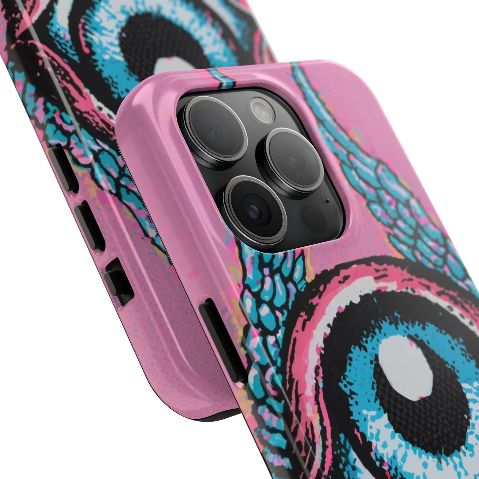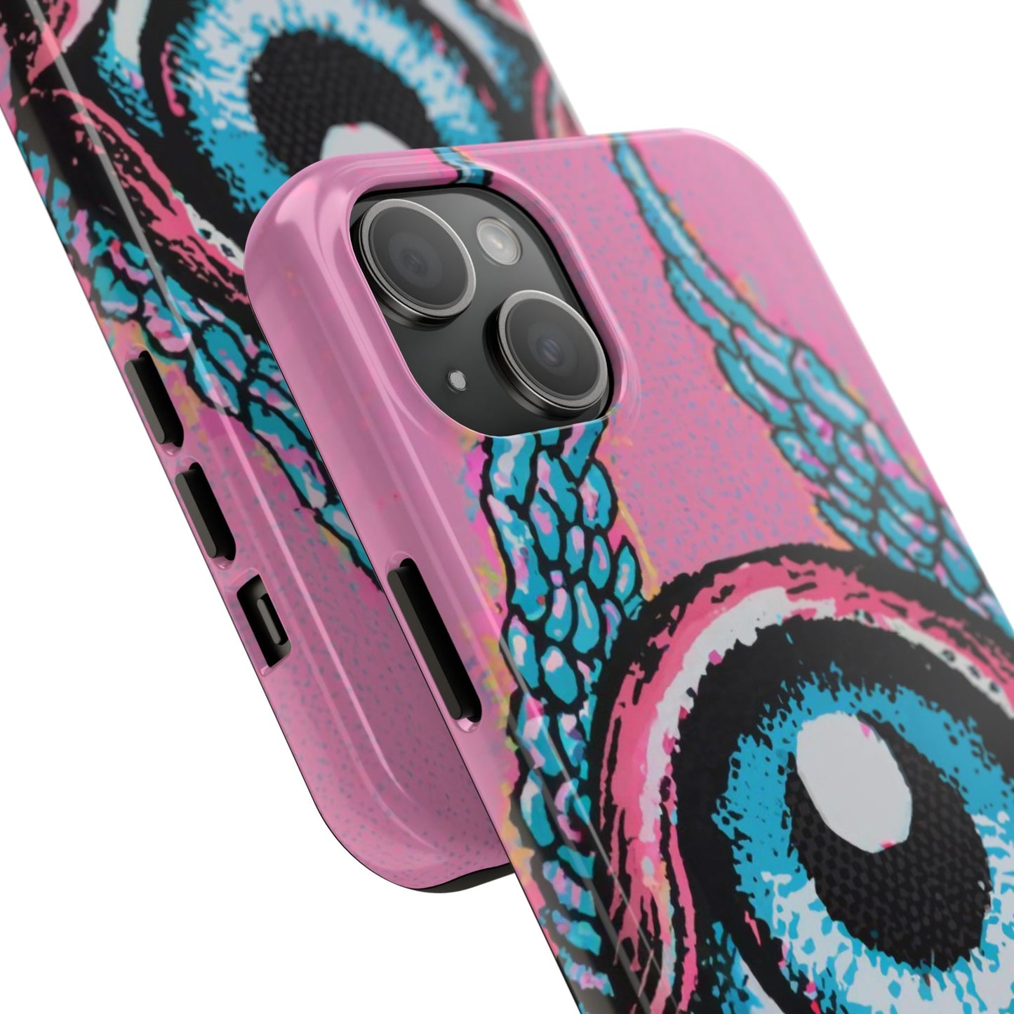 Add a touch of whimsical pop art to your iPhone with the "Halftone Horizon Eyeball iPhone Case." This striking design features a vibrant blue eyeball framed by soft pink eyelids, flanked by dynamic blue wings, all set against a bright pink background with bold halftone detailing.Unique Design: A captivating mix of retro pop art and surreal creativity.Unmatched Protection: Built tough to keep your iPhone safe from bumps, drops, and scratches.Effortless Usability: Precise cutouts and compatibility with wireless charging make it as functional as it is fashionable.Turn heads and protect your device in style with the "Halftone Horizon Eyeball iPhone Case."