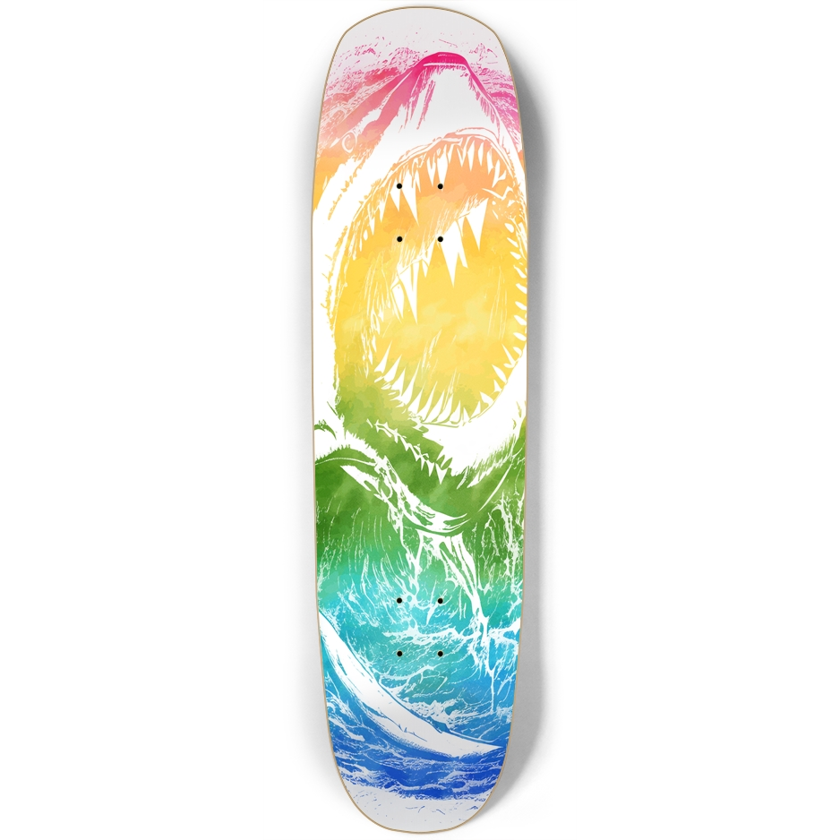 Crafted from premium 7-ply 100% Canadian maple wood, this skateboard is built to last. The deck's square nose shape provides added stability and control, making it perfect for cruising, carving, and hitting the park. And with high-resolution graphics, the colorful gradient behind the sketch of the shark attack is even more impressive in person.