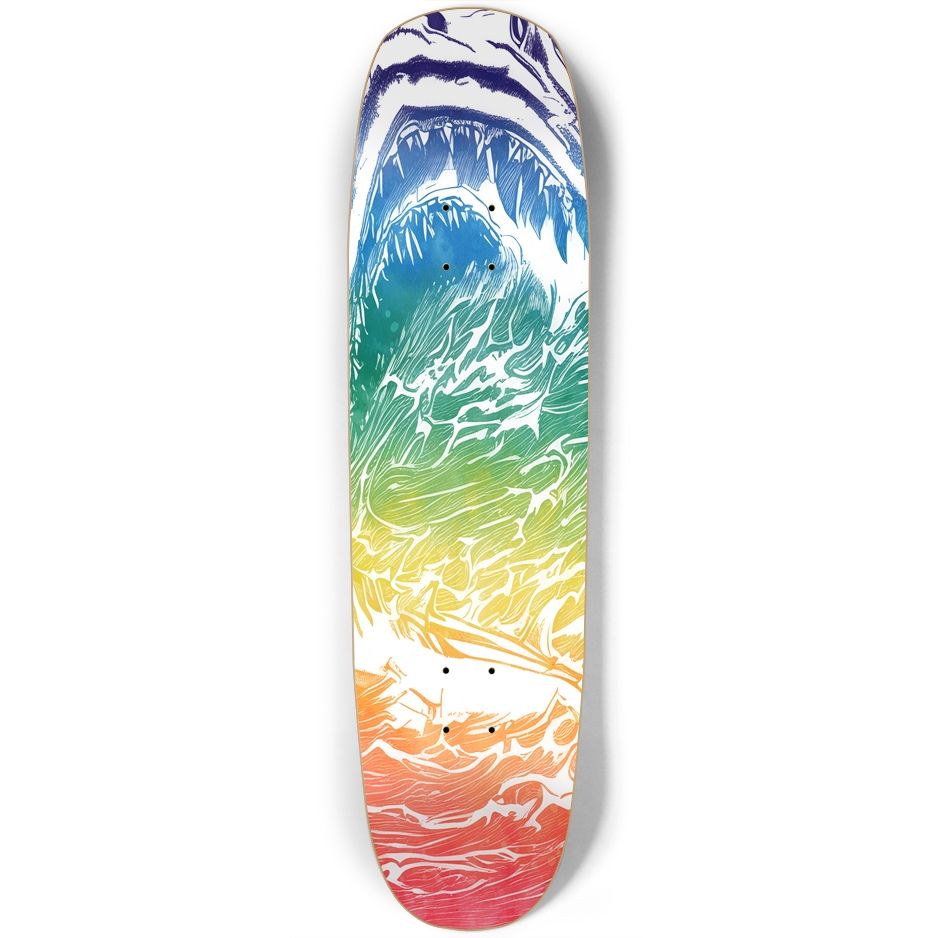 The colorful gradient background adds to the dynamic feel of the design, making it a true standout piece. The shark's teeth are bared and ready to strike, giving the board an edgy and fierce look.