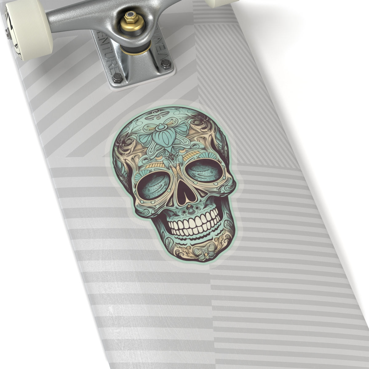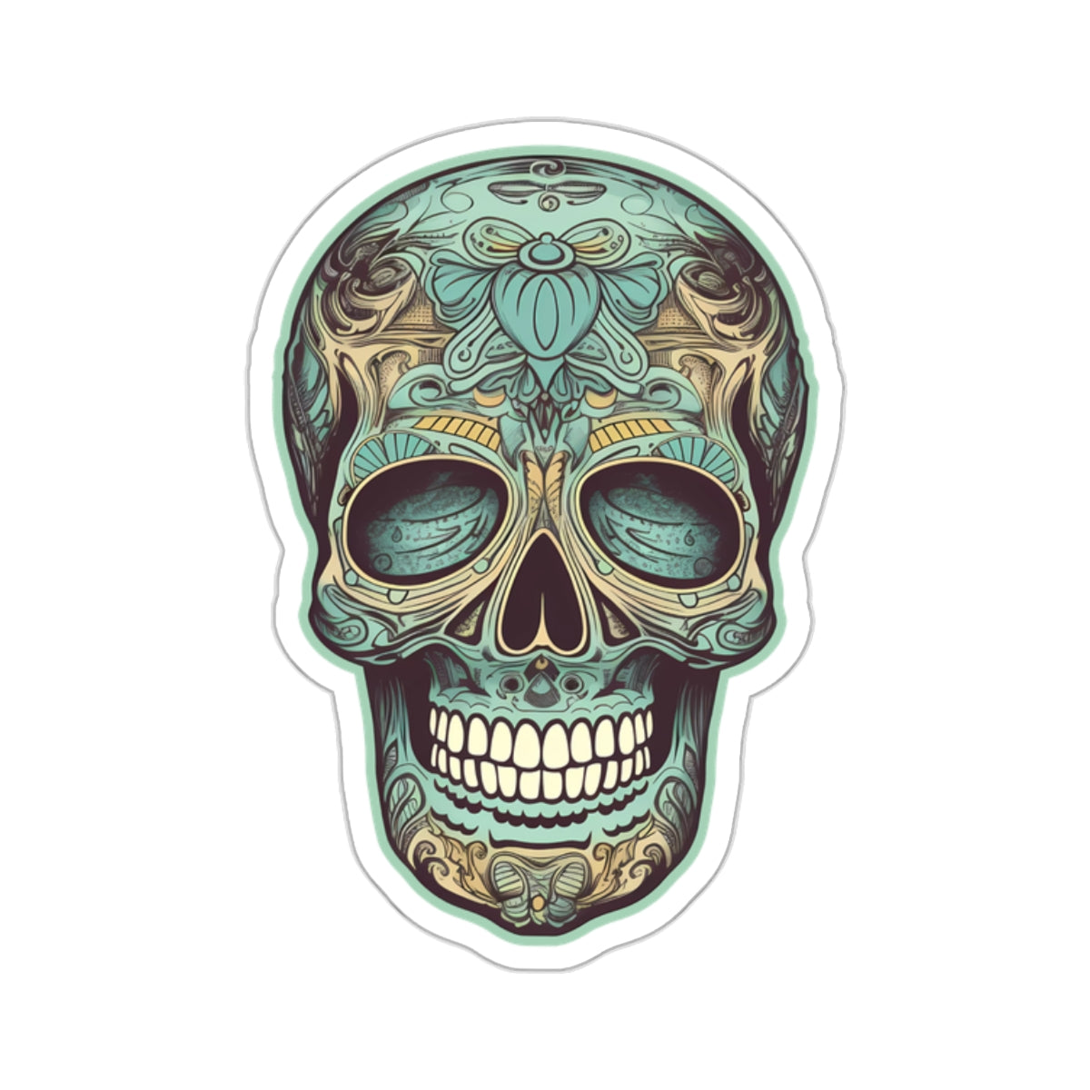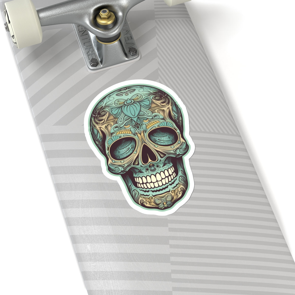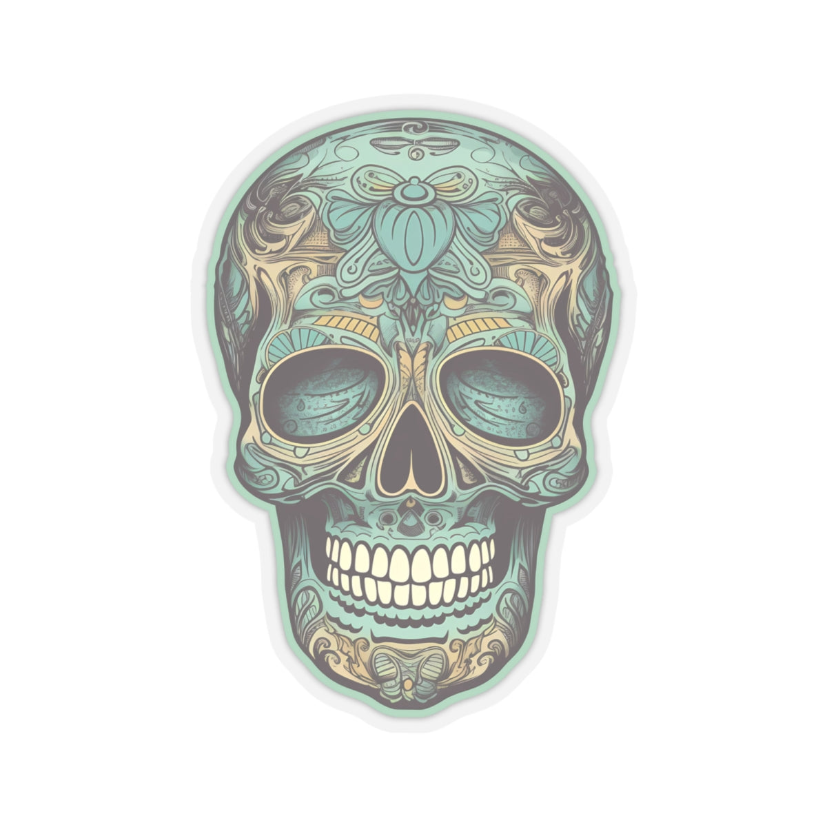 Add a touch of elegance to your belongings with our Ornate Aqua Teal Skull Sticker! This captivating sticker features a light tan skull