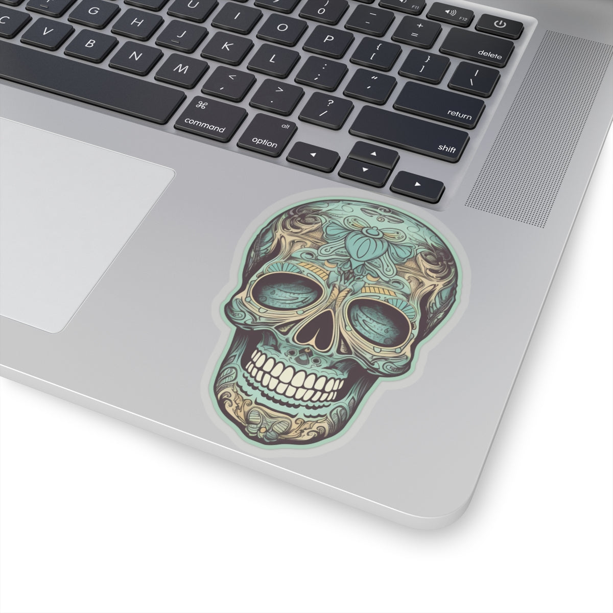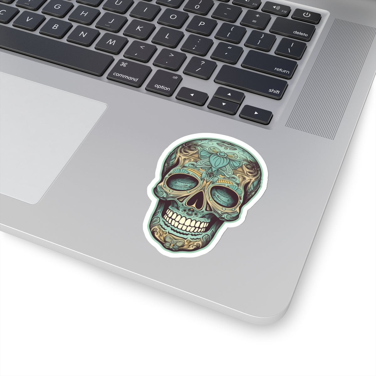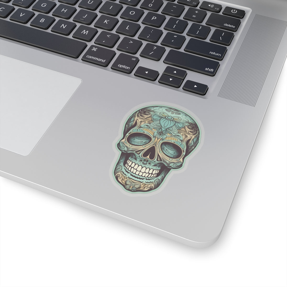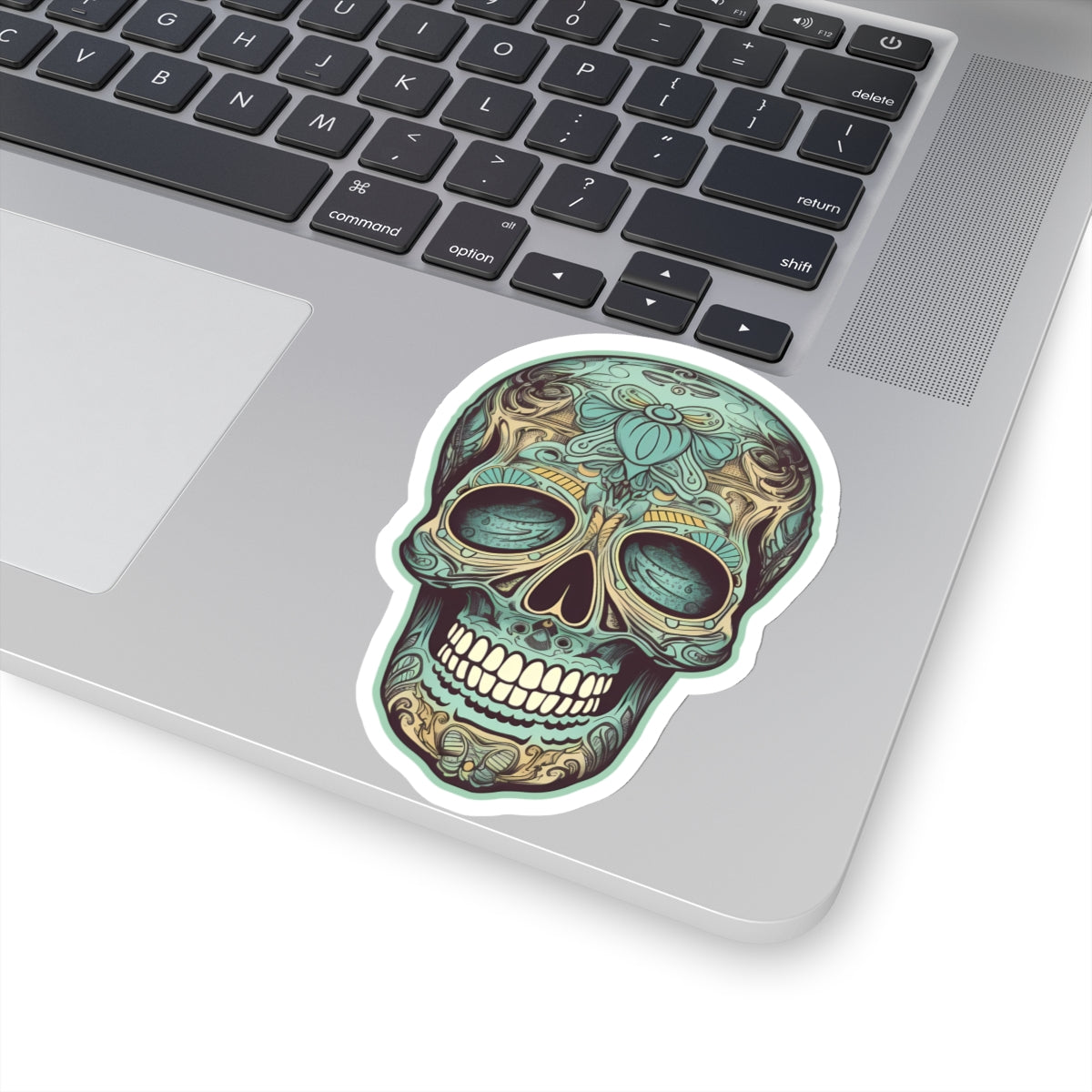 Add a touch of elegance to your belongings with our Ornate Aqua Teal Skull Sticker! This captivating sticker features a light tan skull