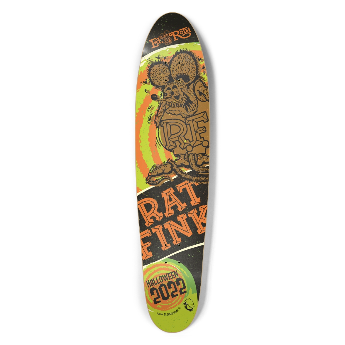 Unleash spooky vibes with the Rat Fink Halloween Longboard 2022 Edition! Made from 7-ply 100% Canadian maple, this deck showcases Rat Fink with swirling background art, blending style and durability. Perfect for carving, cruising, or displaying as wall art, this collector's piece is a must-have for fans of Ed Roth's iconic creation. Ride in style or hang it high—this longboard delivers on all fronts!