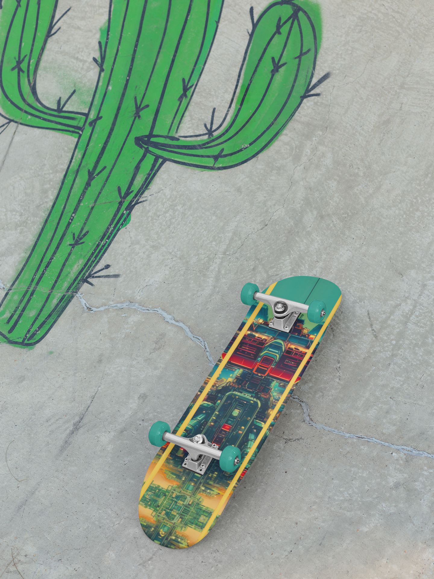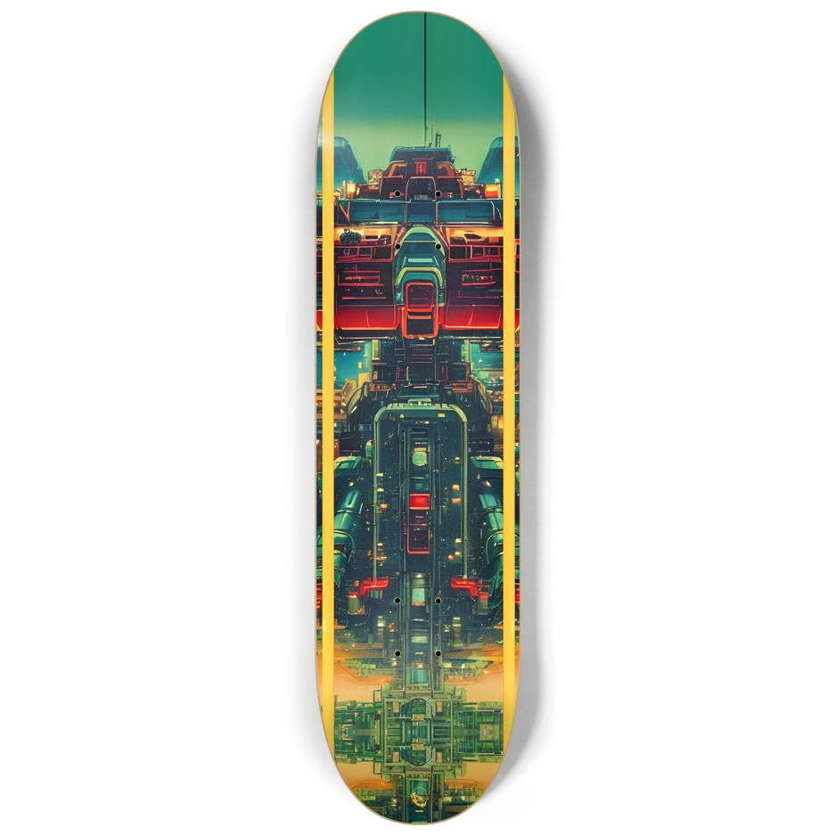 The skateboard's design is inspired by a futuristic robot, featuring a colorful and eye-catching palette of hues that is reminiscent of the iconic Voltron and Transformers. The bright colors and intricate design are sure to turn heads on the streets and at the skatepark.