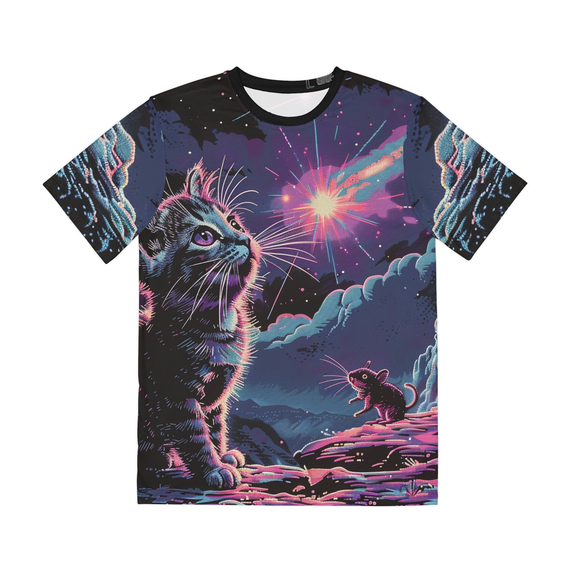 Step into a world of wonder with our Starry Night Kitty & Mouse Tee, featuring an enchanting scene of a kitty and a mouse gazing up into space at a purplish starry background with a shooting star, printed all over the tee. Crafted from premium microfiber-knit fabric, this tee offers a luxurious feel perfect for everyday comfort. Made from 100% polyester, it ensures durability and breathability, while its whimsical design adds a touch of magic to your wardrobe. This tee is Tagless and true to size and guarantees a comfortable fit for any occasion. Whether you're stargazing or going about your day, our Starry Night Tee promises to bring a sense of cosmic wonder to your style. Embrace the celestial charm - shop now and elevate your wardrobe with a touch of magic!