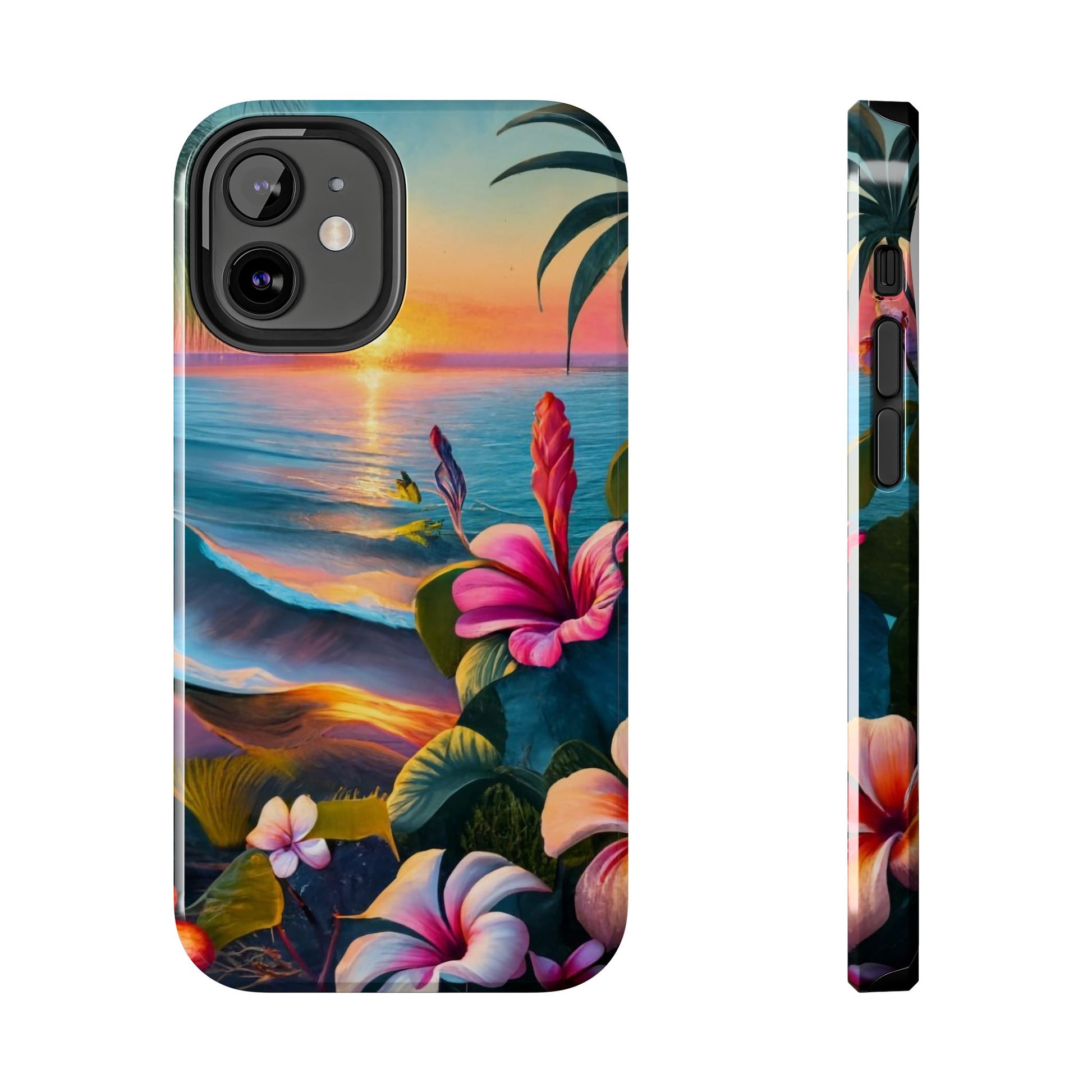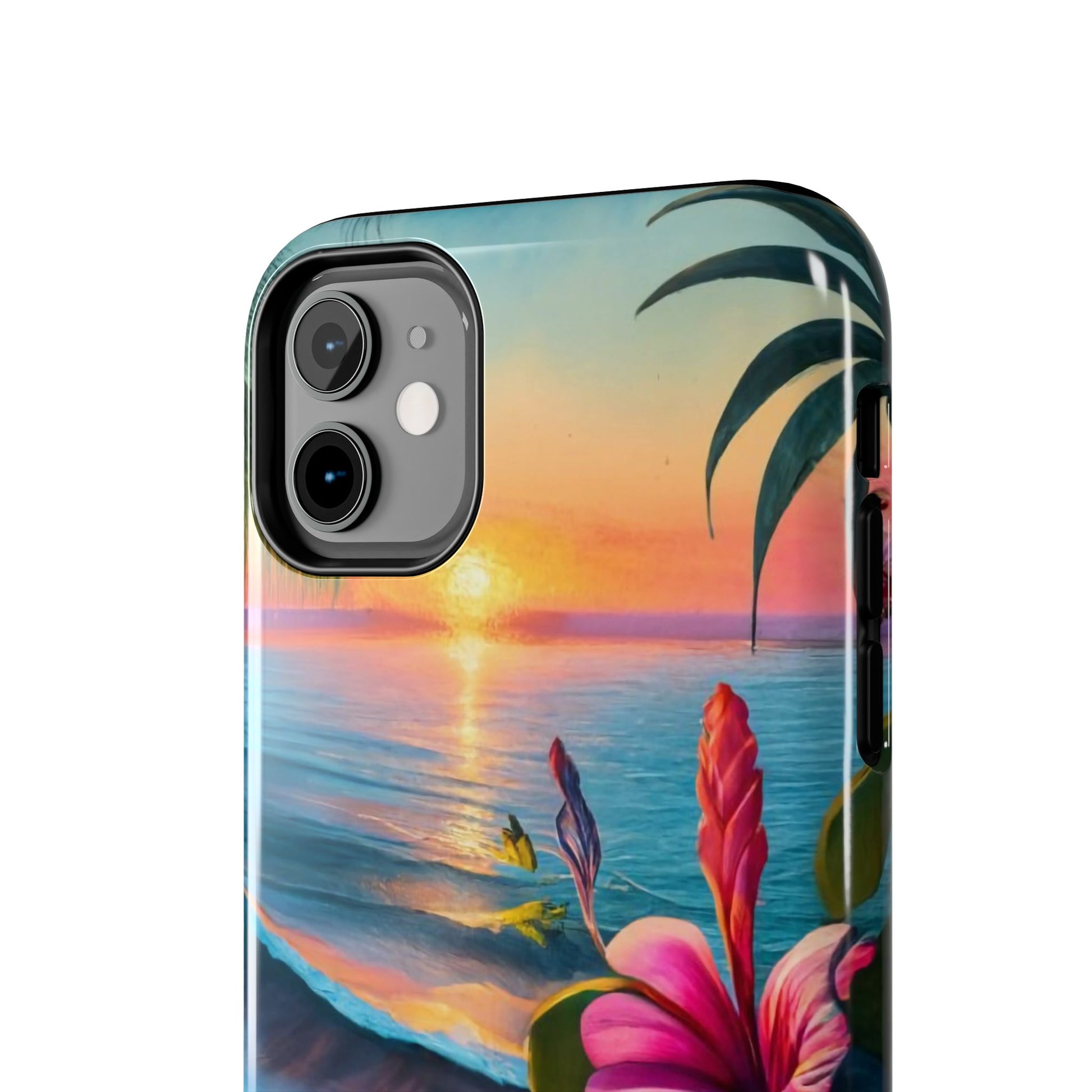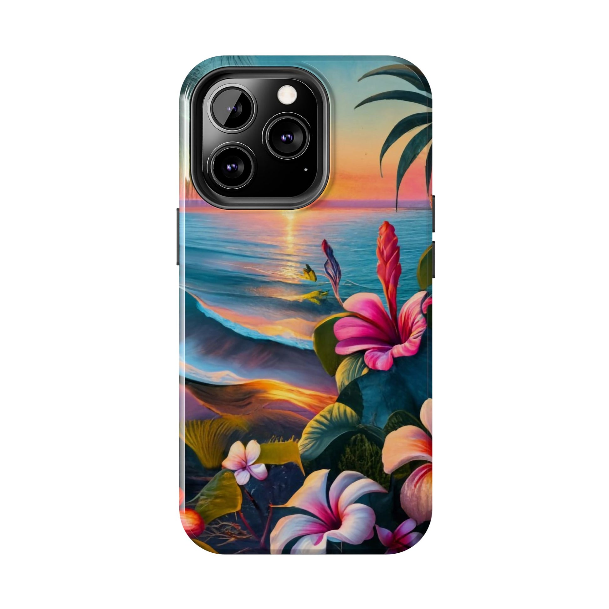 Transport yourself to a tropical paradise with our Sunset Beach Hibiscus Palms Tough Phone Case, featuring a captivating artwork of a serene beach scene at sunset. Adorned with swaying palm trees, gentle waves, and vibrant hibiscus flowers, this scene evokes the tranquility and beauty of a tropical getaway.Crafted with a 2-piece design for enhanced protection, this case features a polycarbonate shell and TPU lining for durability. The interior rubber liner adds an extra layer of defense, ensuring your device stays safe from everyday bumps and drops.Compatible with iPhone 11, 12, 13, 14, 15, and more, our case supports wireless charging for added convenience (excluding MagSafe). Bring the serenity of a tropical sunset to your phone with our Sunset Beach Hibiscus Palms Tough Phone Case. Shop now and protect your device with style!