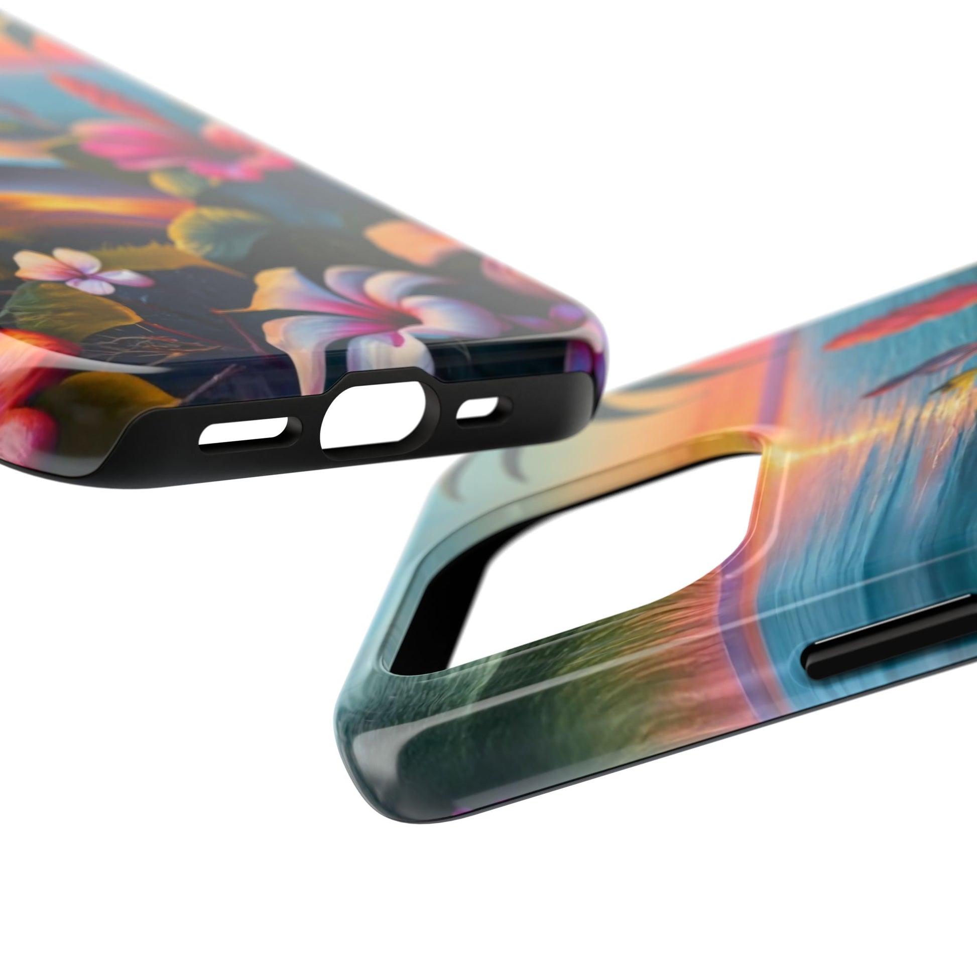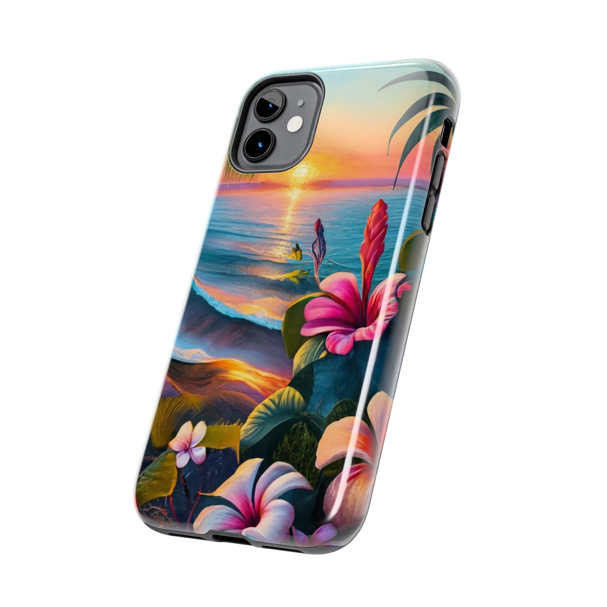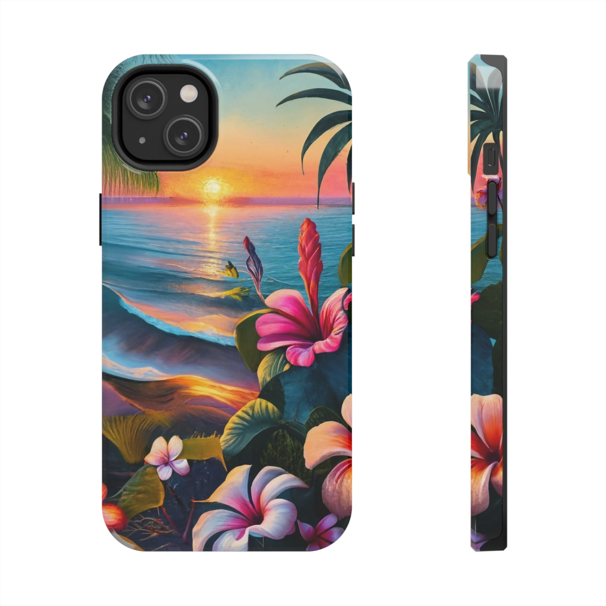 Transport yourself to a tropical paradise with our Sunset Beach Hibiscus Palms Tough Phone Case, featuring a captivating artwork of a serene beach scene at sunset. Adorned with swaying palm trees, gentle waves, and vibrant hibiscus flowers, this scene evokes the tranquility and beauty of a tropical getaway.Crafted with a 2-piece design for enhanced protection, this case features a polycarbonate shell and TPU lining for durability. The interior rubber liner adds an extra layer of defense, ensuring your device stays safe from everyday bumps and drops.Compatible with iPhone 11, 12, 13, 14, 15, and more, our case supports wireless charging for added convenience (excluding MagSafe). Bring the serenity of a tropical sunset to your phone with our Sunset Beach Hibiscus Palms Tough Phone Case. Shop now and protect your device with style!