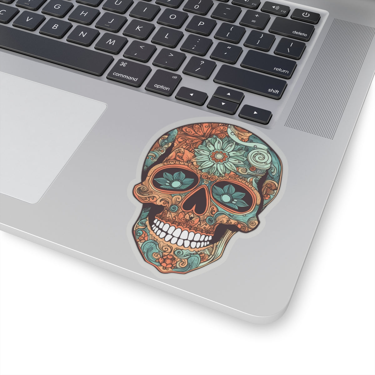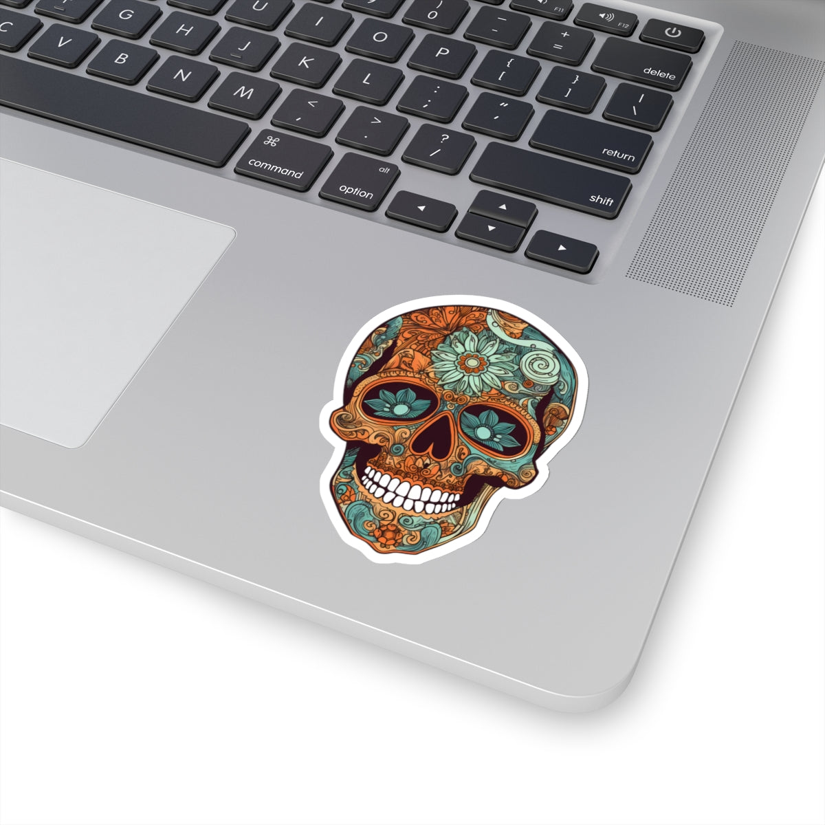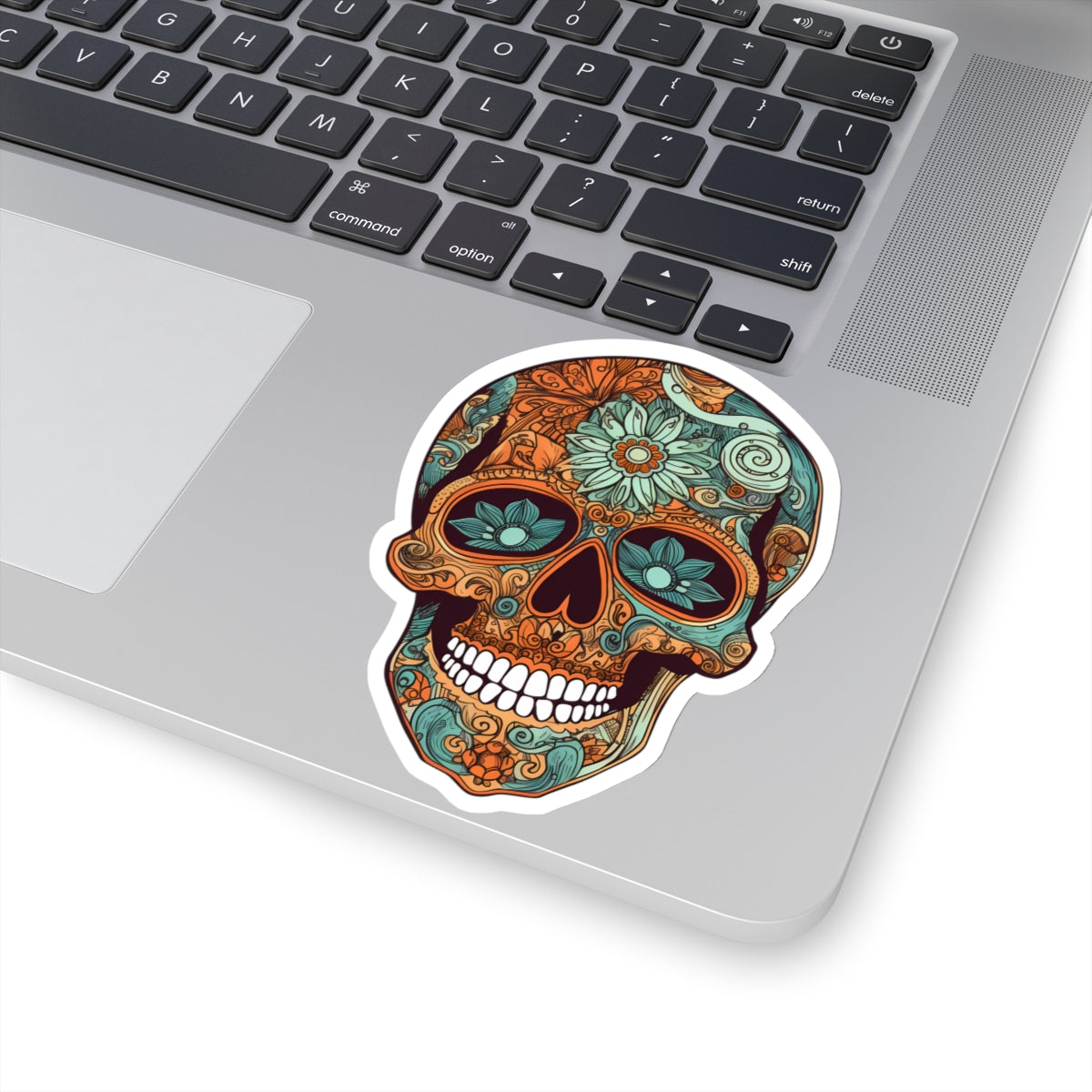 striking oranges and teals with intricate floral patterns adorning the skull. Perfect for adding a pop of color to laptops, notebooks, and