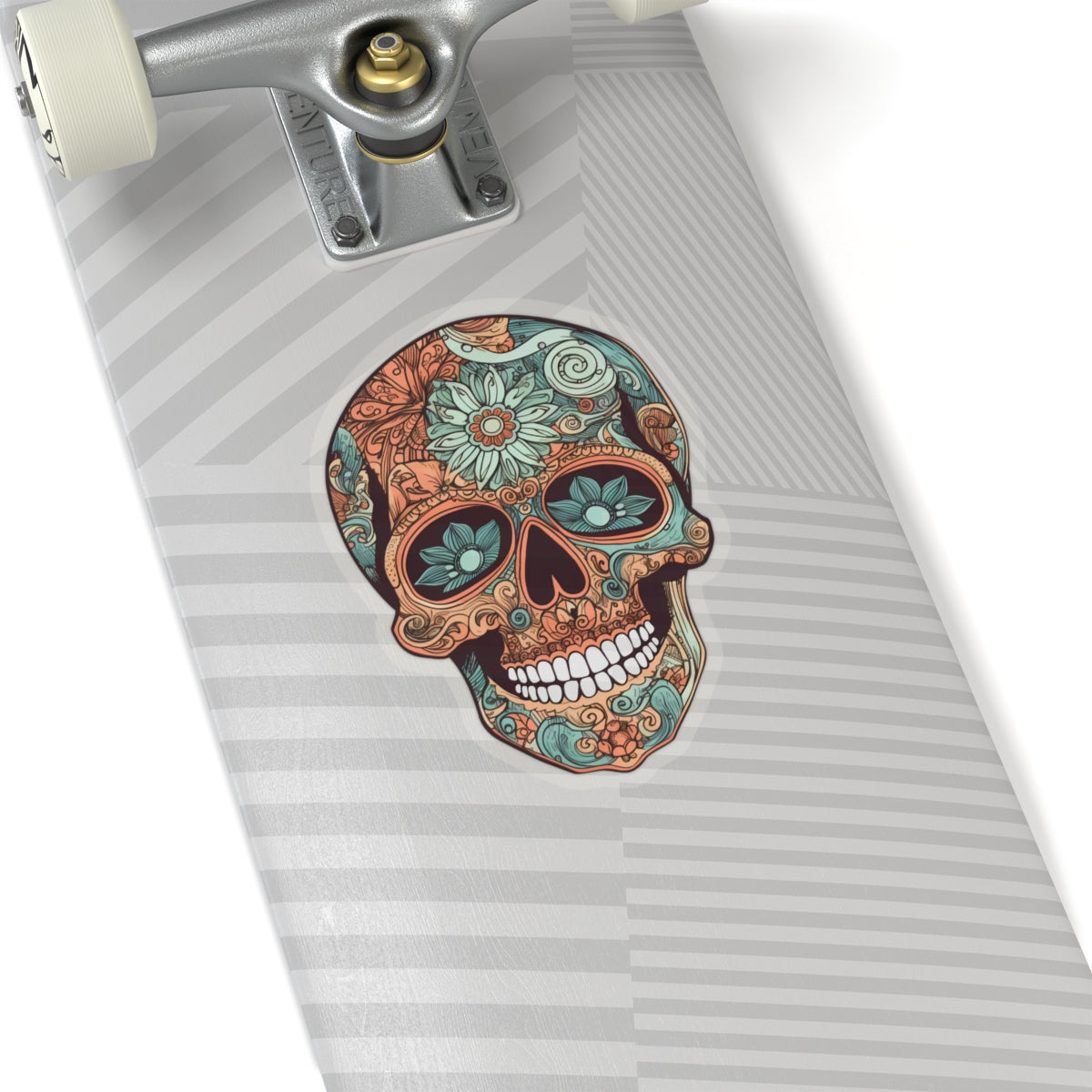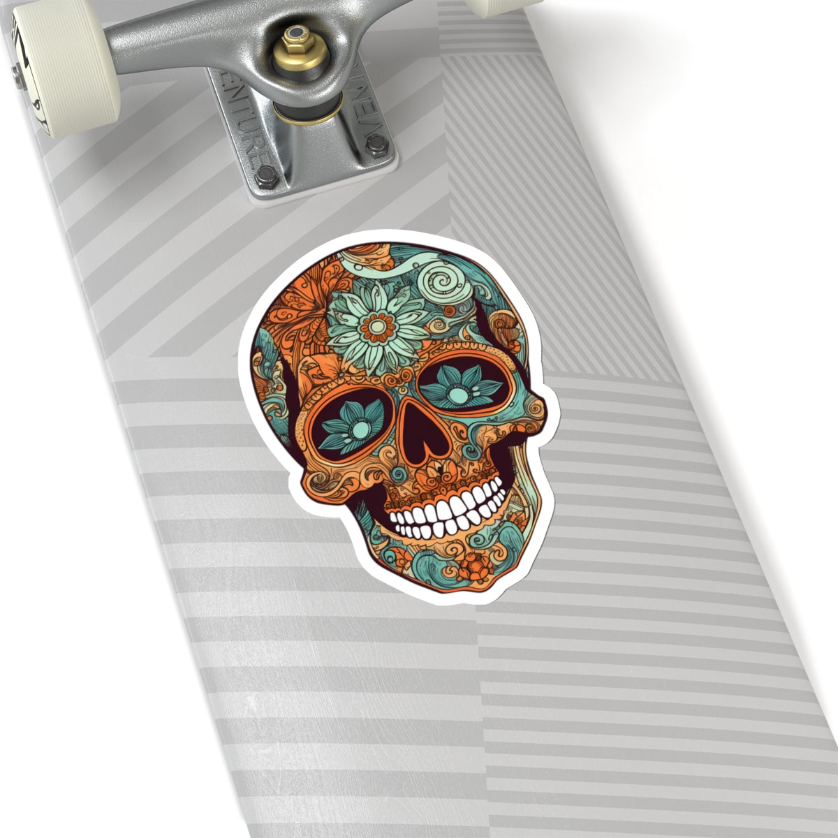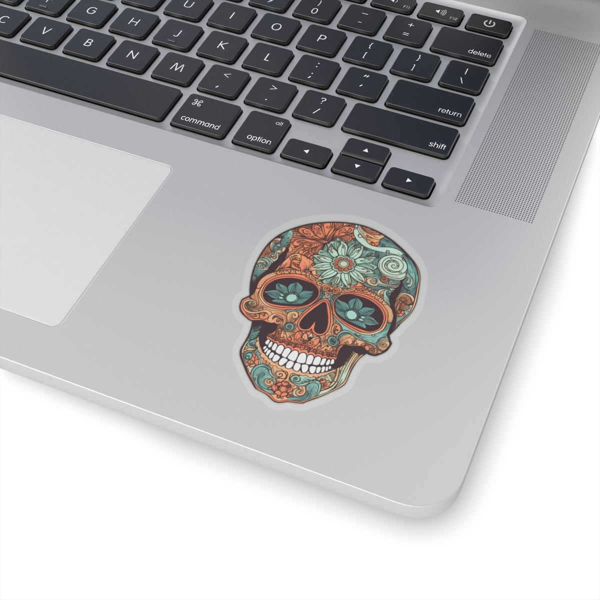 striking oranges and teals with intricate floral patterns adorning the skull. Perfect for adding a pop of color to laptops, notebooks, and