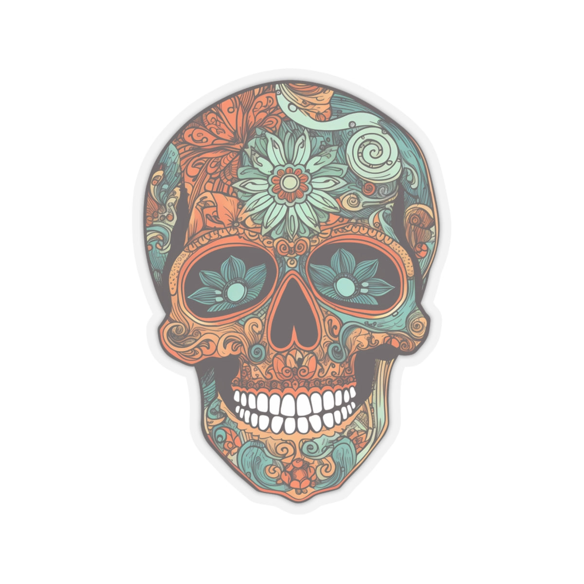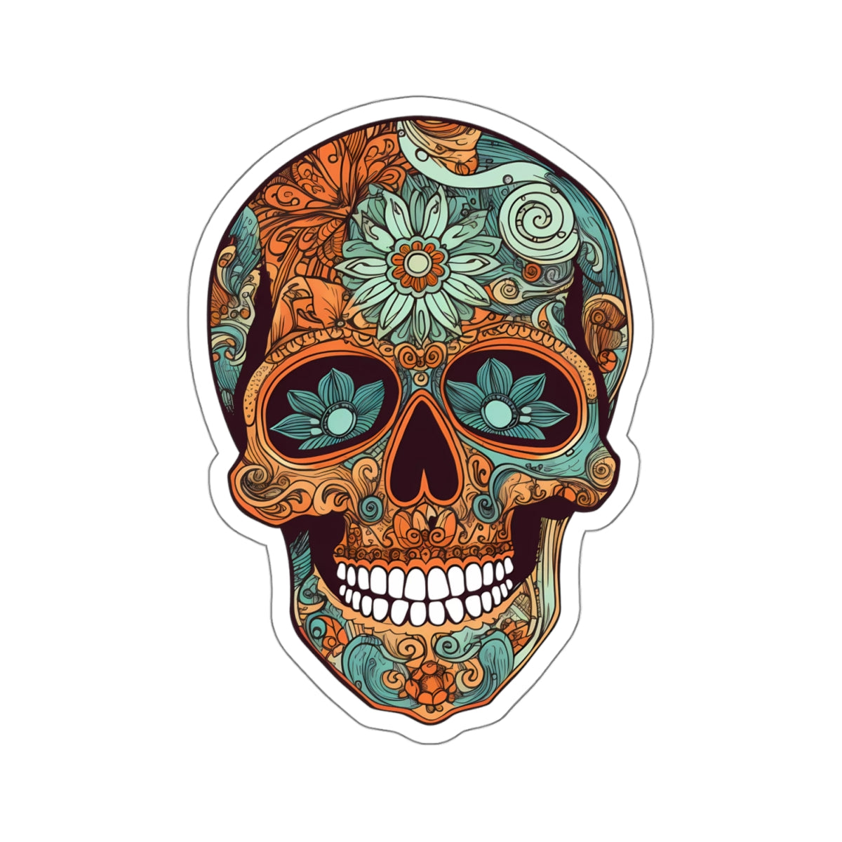 Embrace vibrant hues with our Teal and Orange Sugar Skull Sticker! Inspired by the traditional sugar skull design, this sticker features