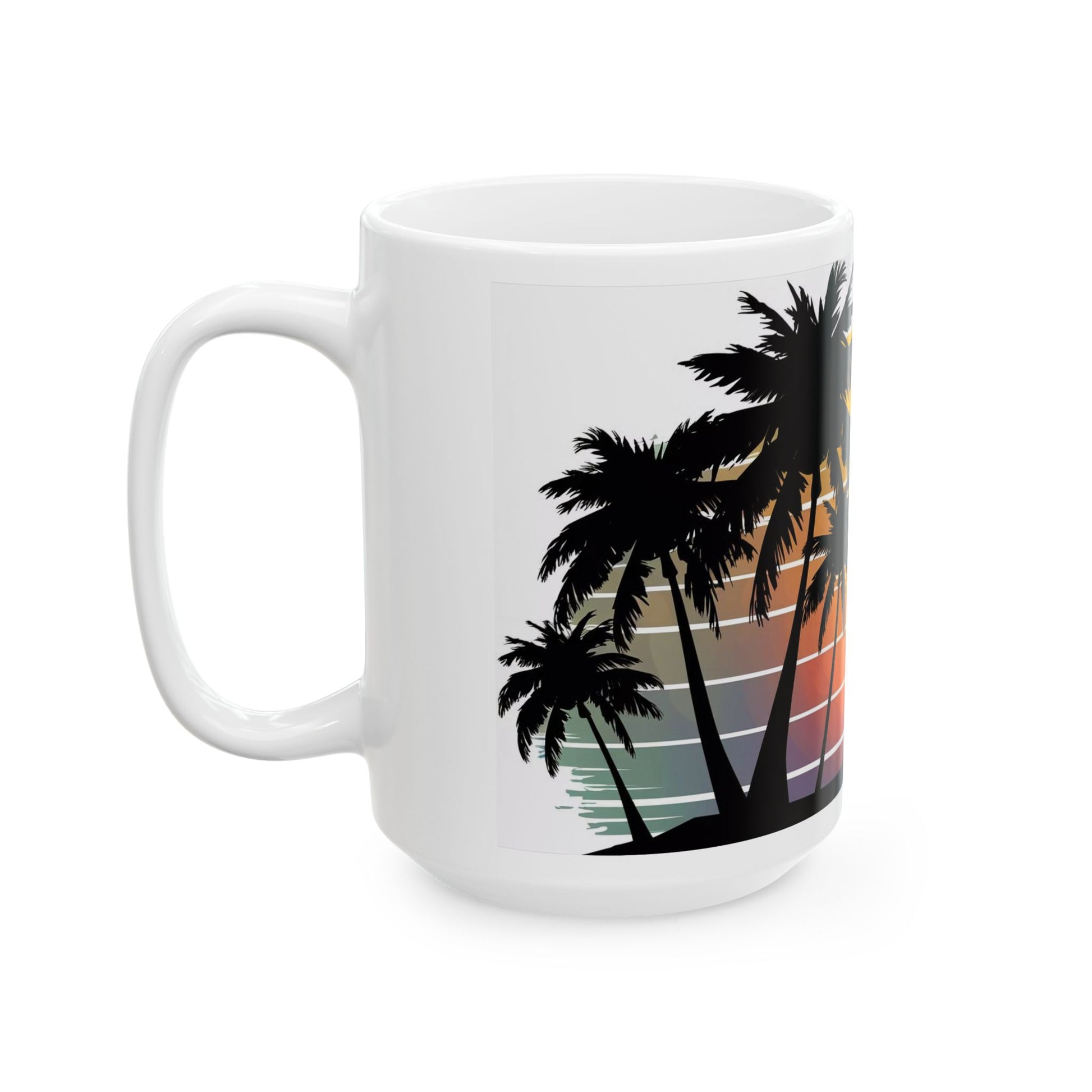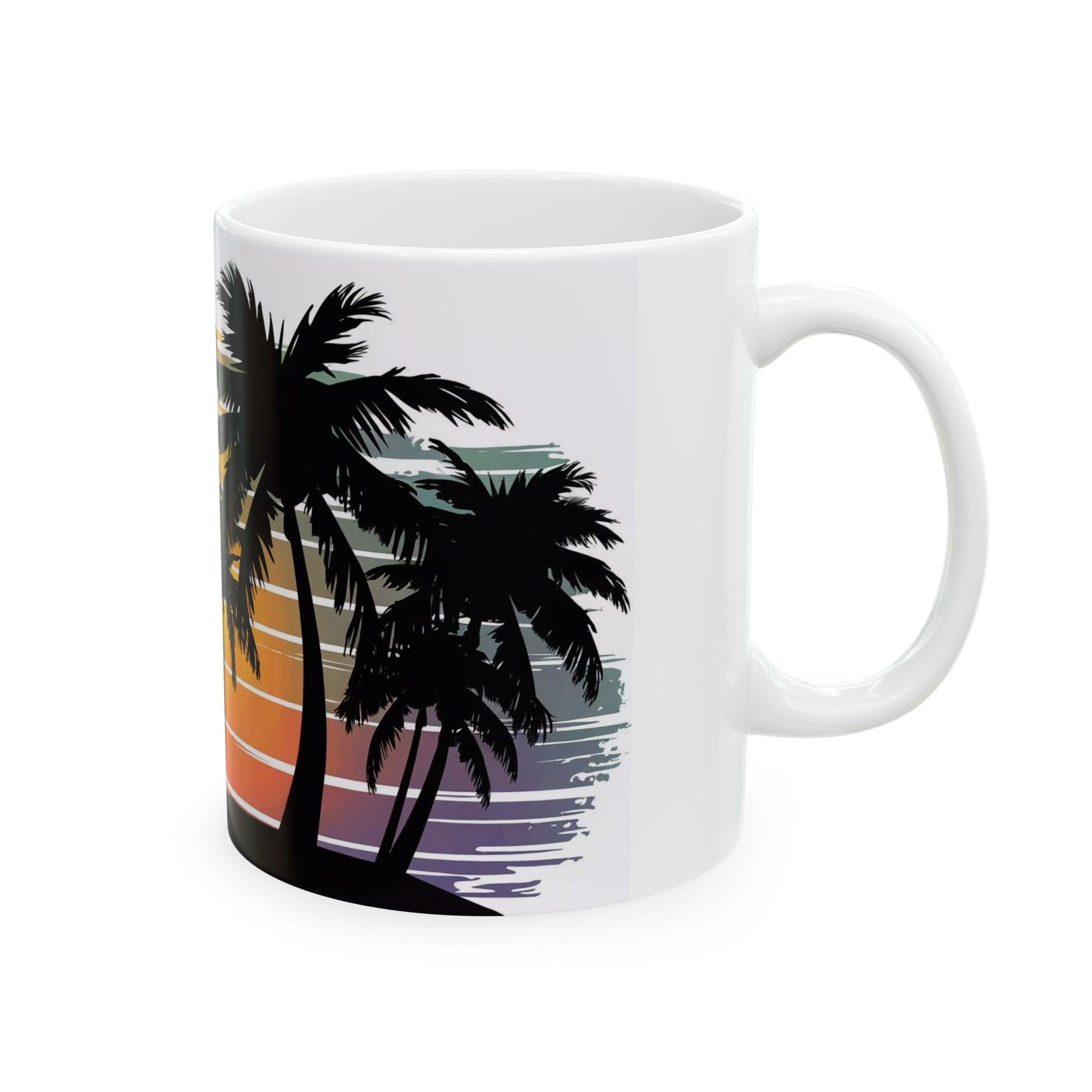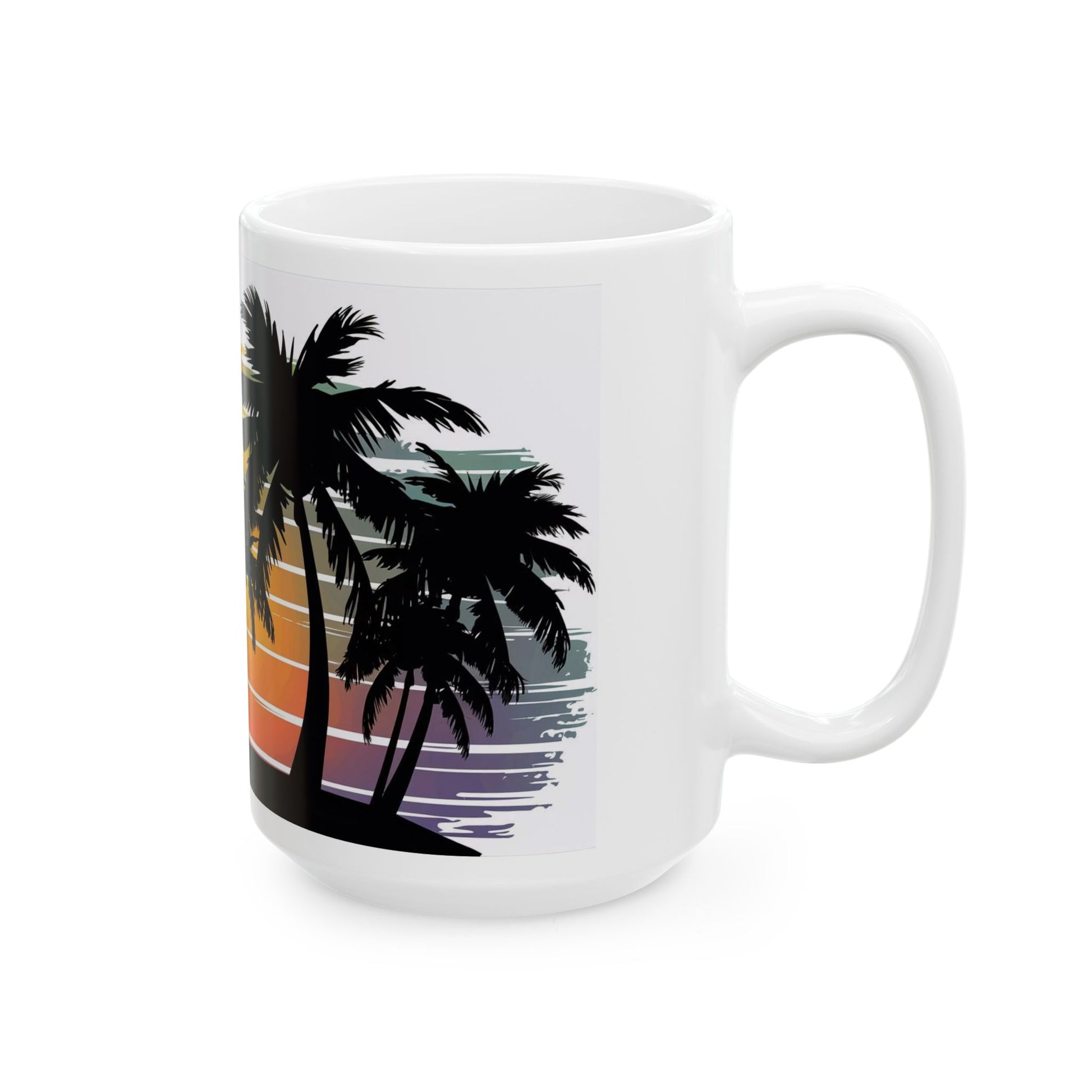 Sip your favorite drink in style with this ceramic coffee mug showcasing a breathtaking gradient sunset in greens, blues, purples, oranges, and yellows. Black palm trees and a serene beach silhouette complete the tropical vibe. Crafted from durable white ceramic, this mug is available in 11oz and 15oz sizes and is BPA and lead-free. Microwave and dishwasher safe, it’s as practical as it is stunning. The vivid colors make every sip feel like a beach getaway – a perfect gift for sunset and coffee lovers alike!