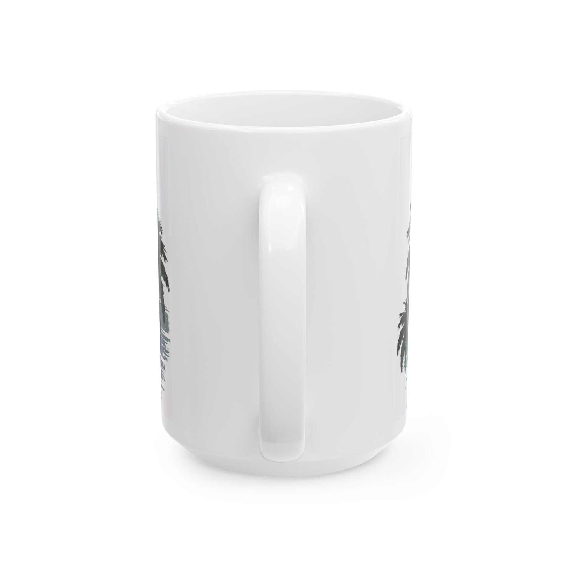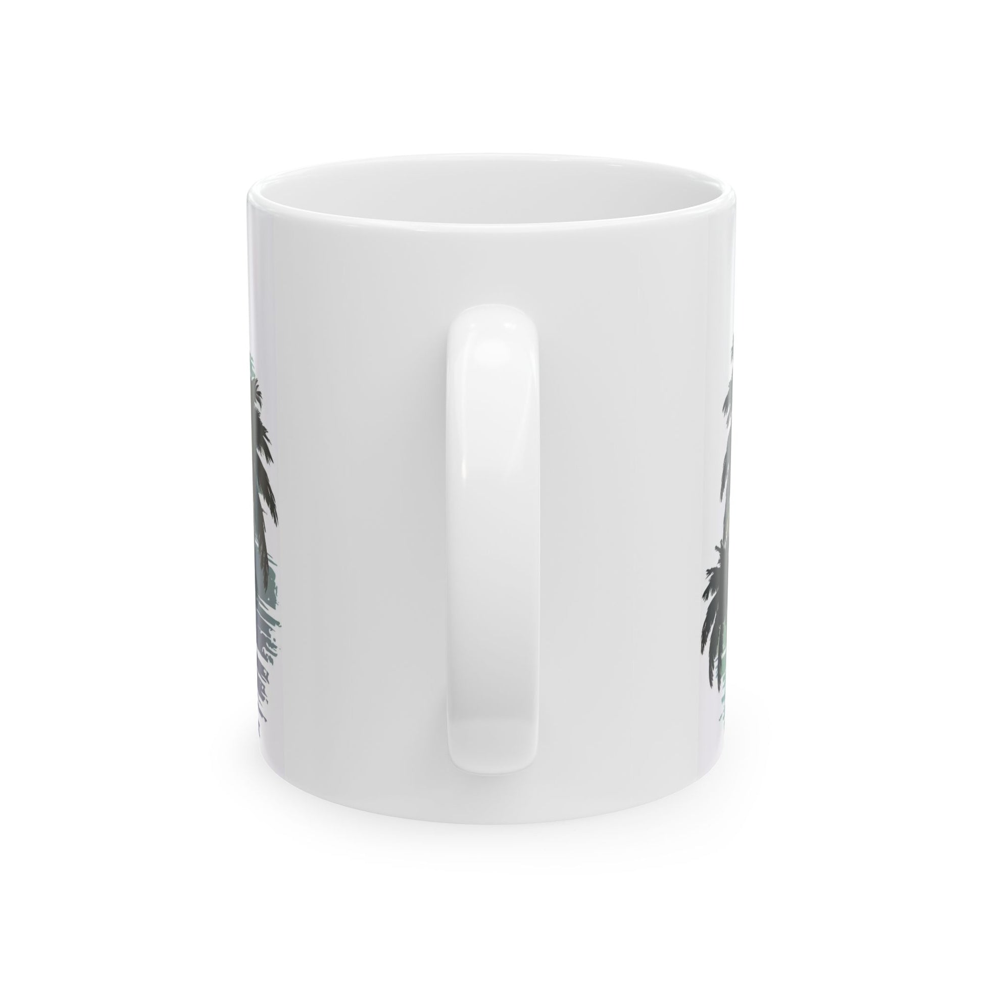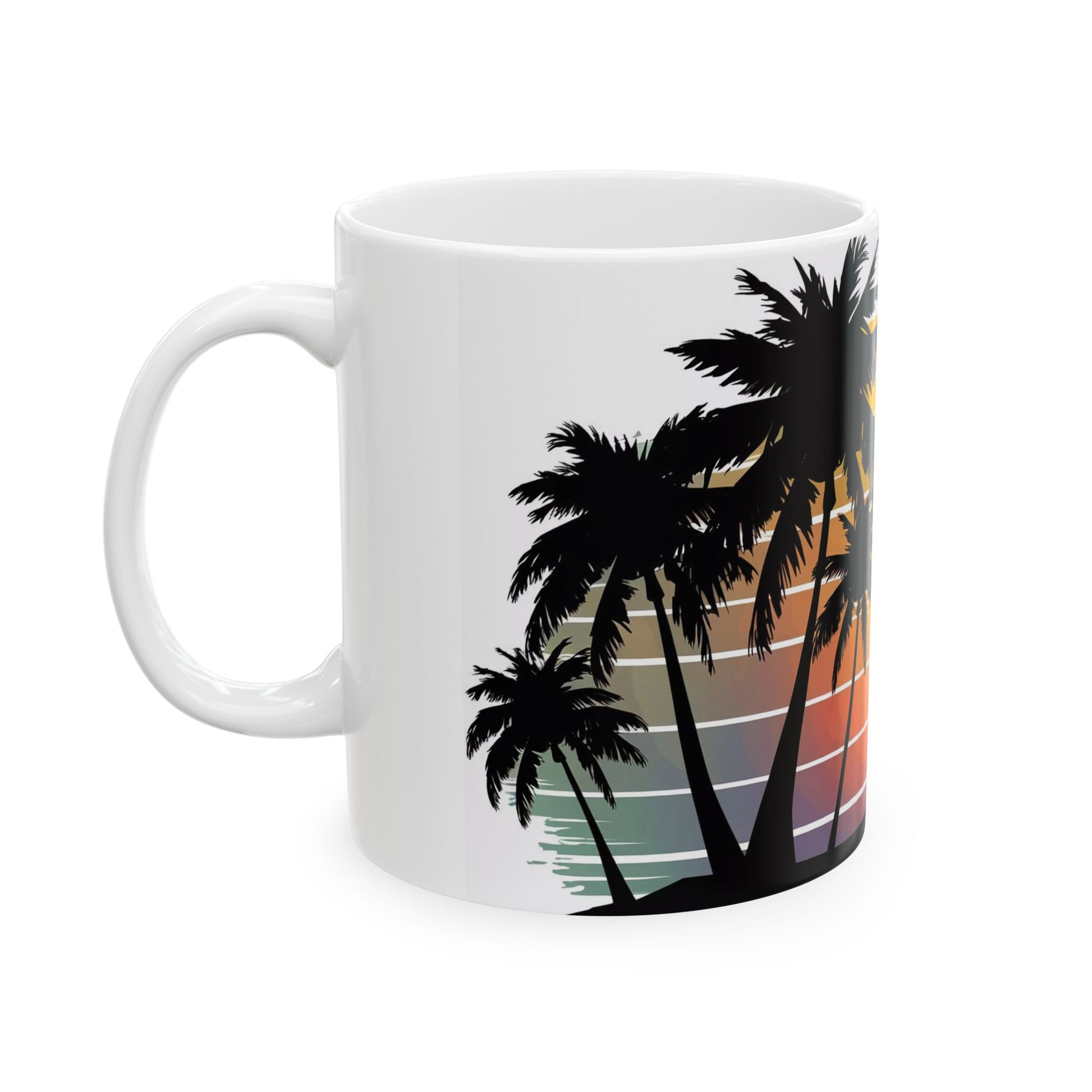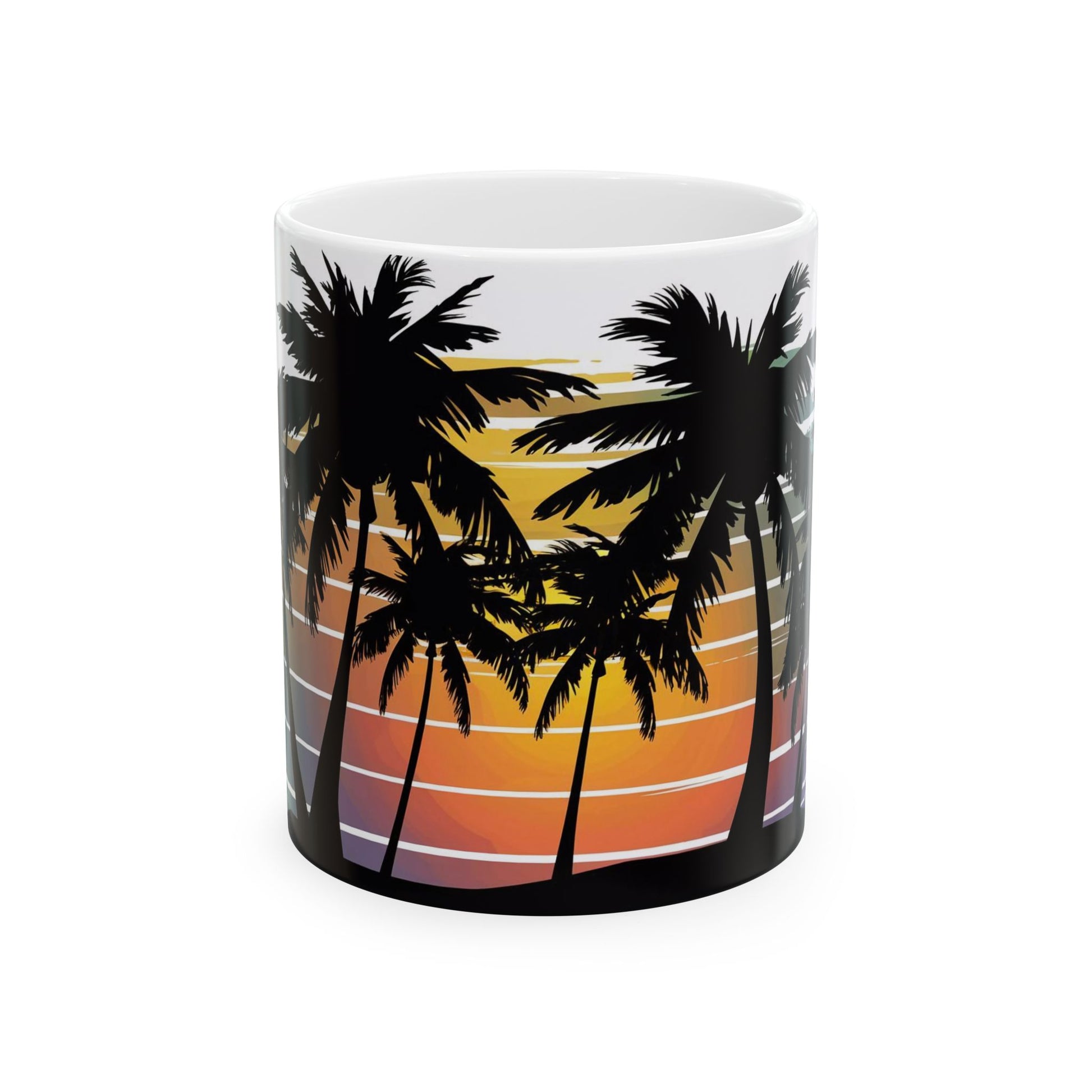 Sip your favorite drink in style with this ceramic coffee mug showcasing a breathtaking gradient sunset in greens, blues, purples, oranges, and yellows. Black palm trees and a serene beach silhouette complete the tropical vibe. Crafted from durable white ceramic, this mug is available in 11oz and 15oz sizes and is BPA and lead-free. Microwave and dishwasher safe, it’s as practical as it is stunning. The vivid colors make every sip feel like a beach getaway – a perfect gift for sunset and coffee lovers alike!