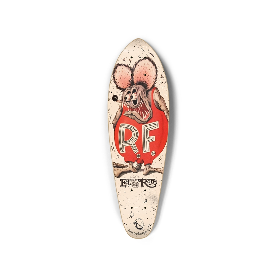 This limited edition Rat Fink mini cruiser Skateboard is a one-of-a-kind collectible designed by a licensed Rat Fink artist, inspired by the iconic designs of Ed Roth. Ed Roth was an artist and custom car builder, who created the Rat Fink character in the 1960s and is considered a pioneer of the Kustom Kulture movement.