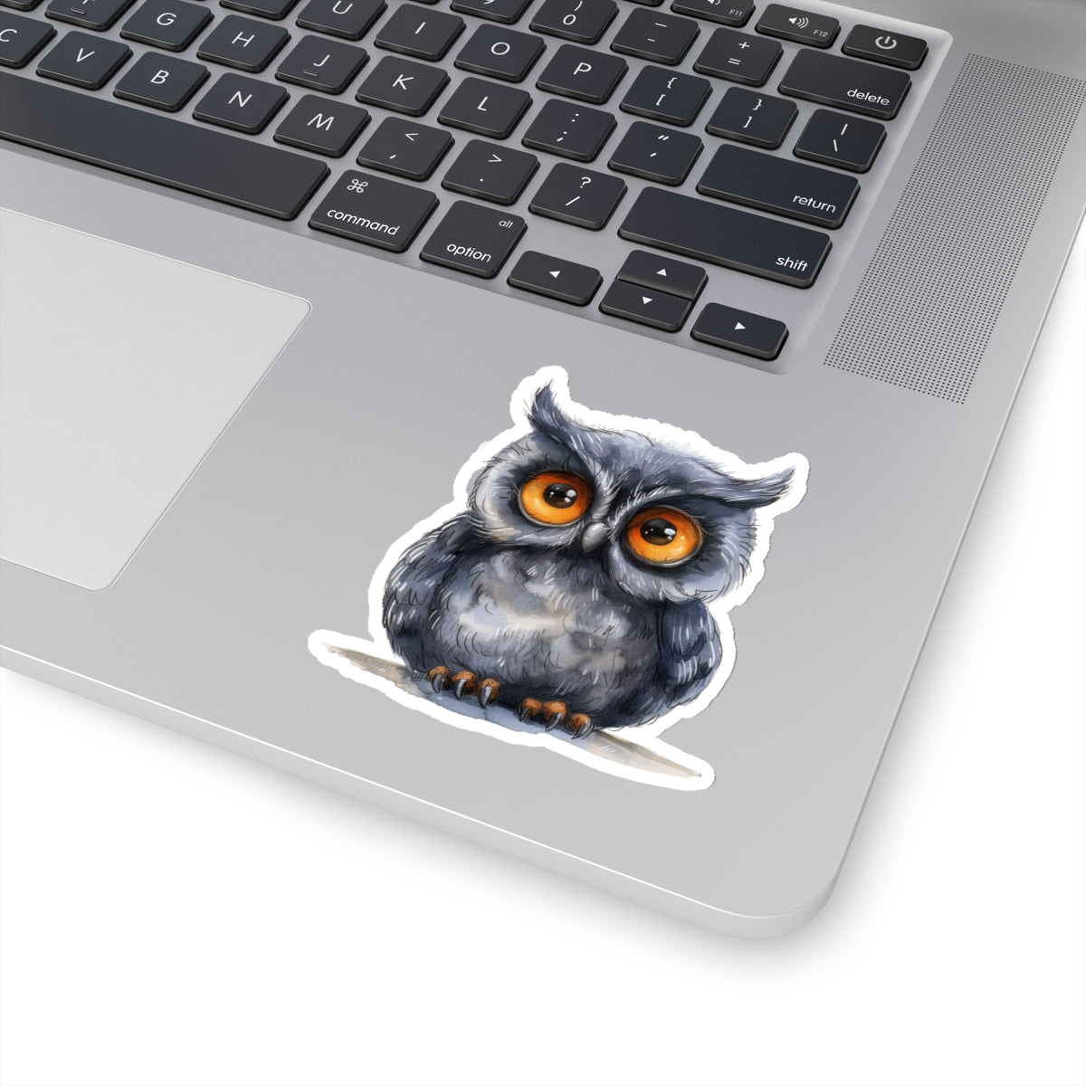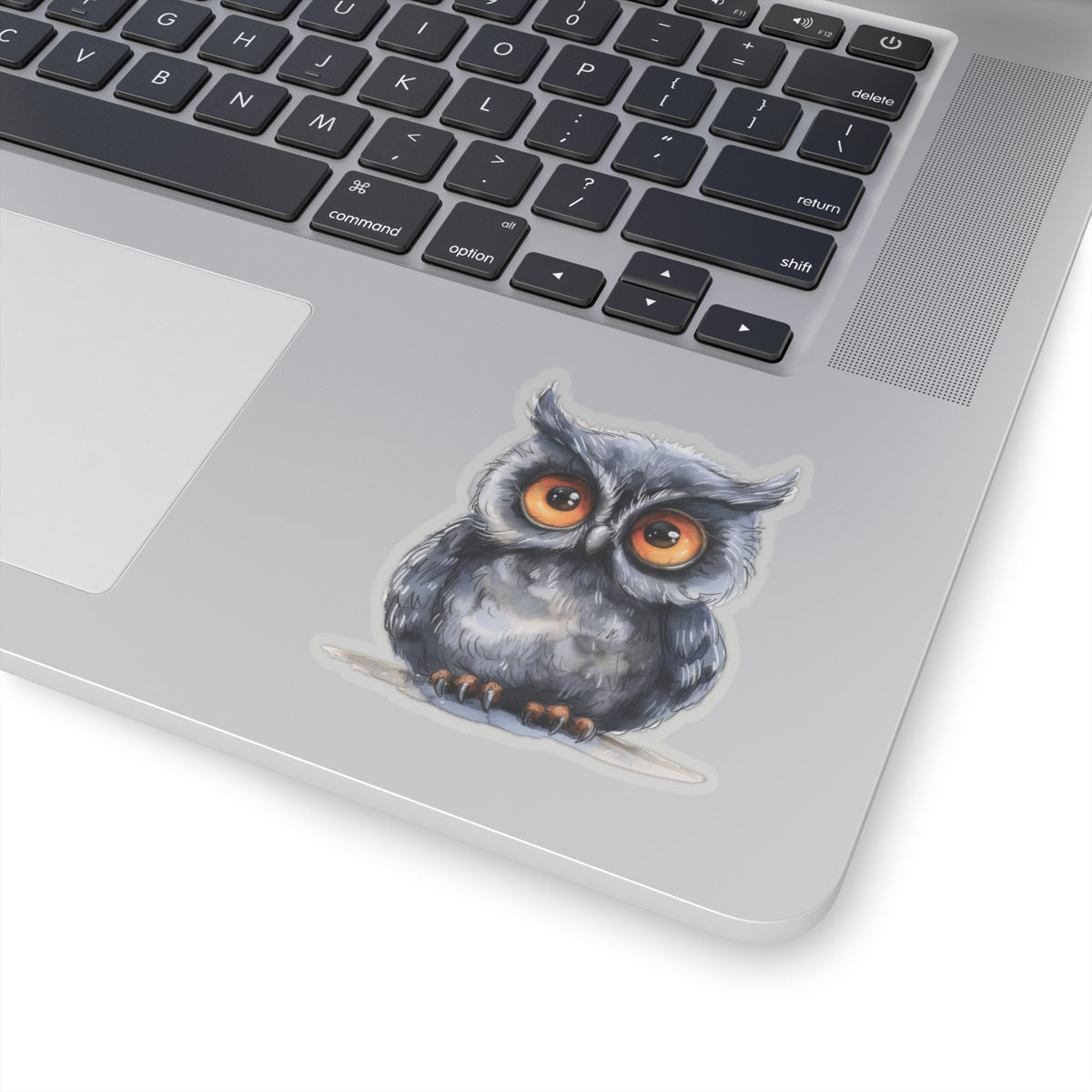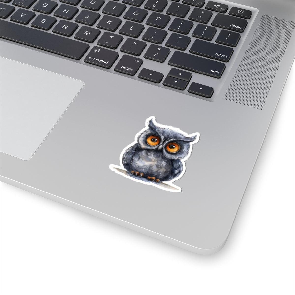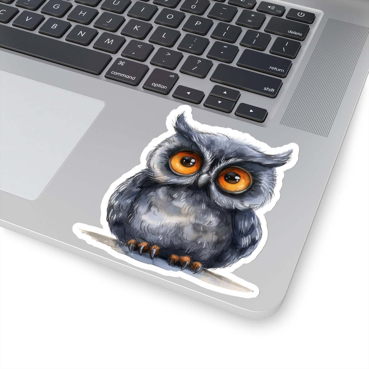 illustration of a cute gray owl, perfect for adorning laptops, notebooks, and more. Crafted from durable vinyl with strong 3M adhesive,