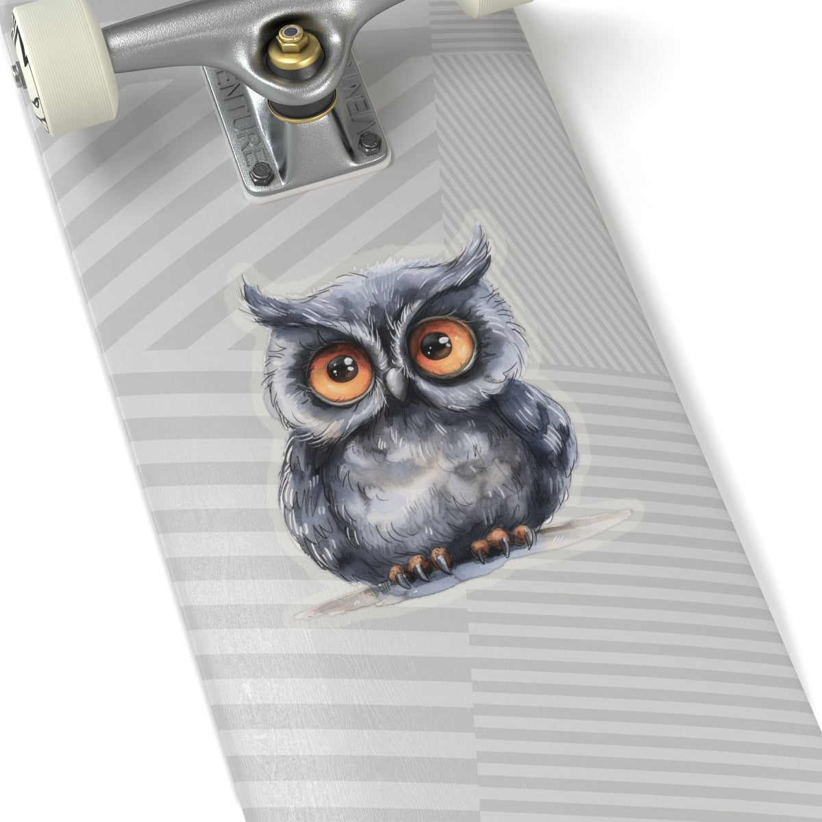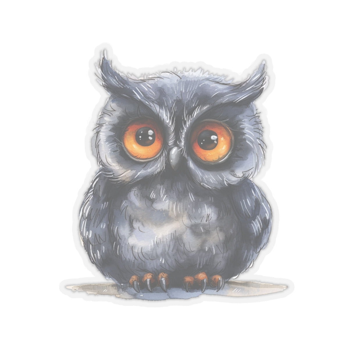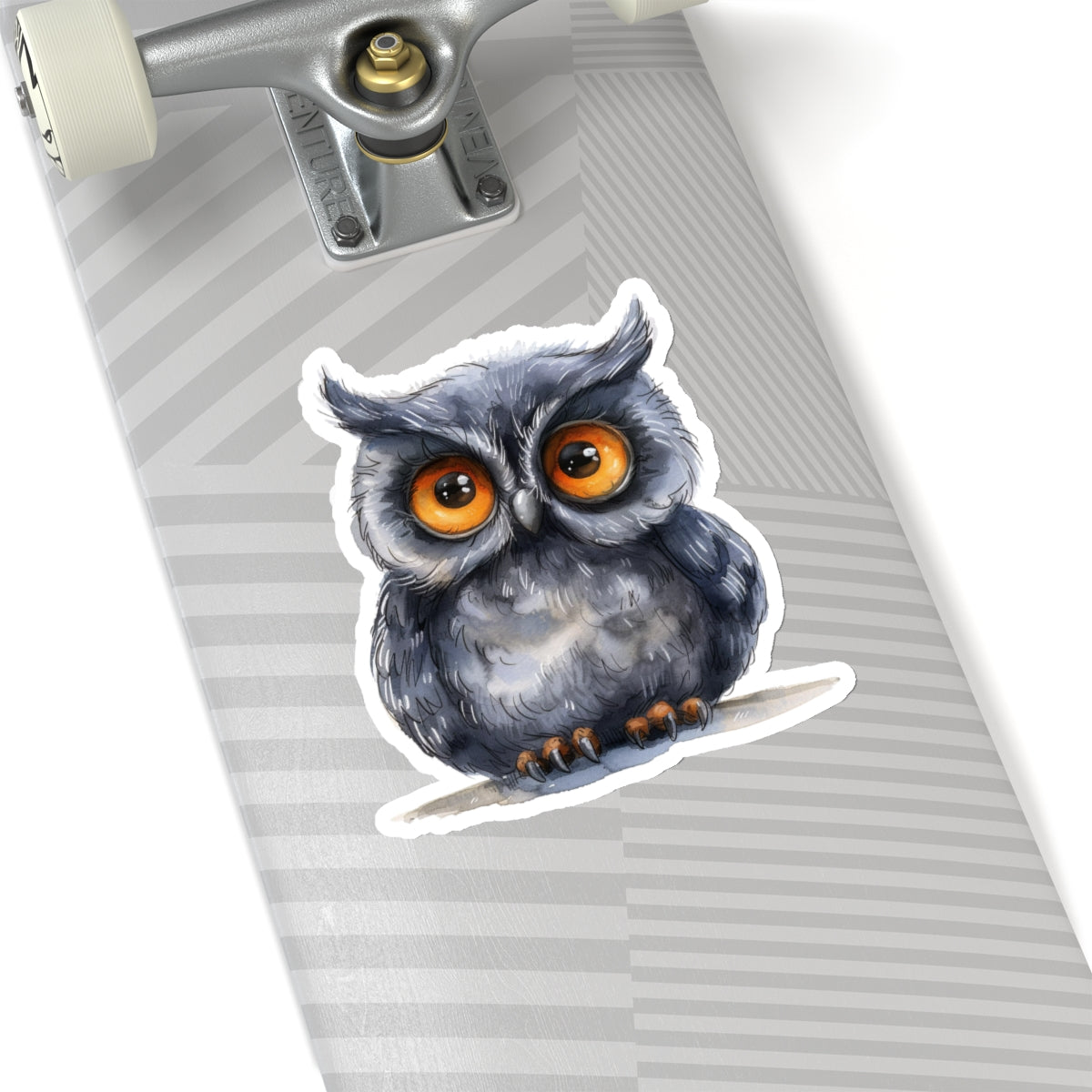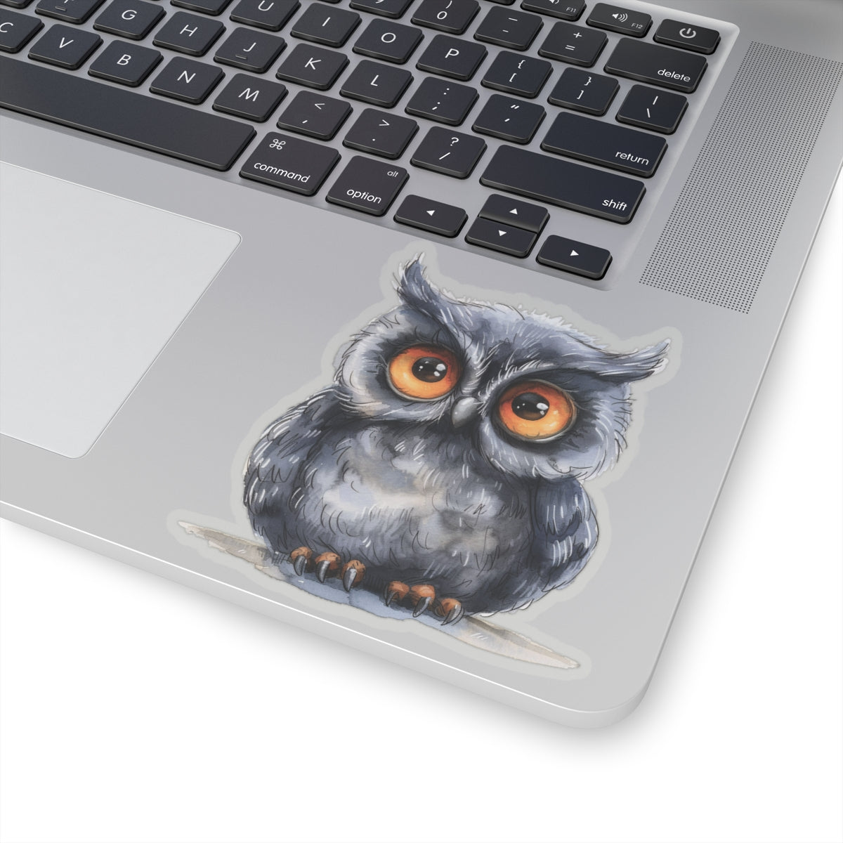 illustration of a cute gray owl, perfect for adorning laptops, notebooks, and more. Crafted from durable vinyl with strong 3M adhesive,